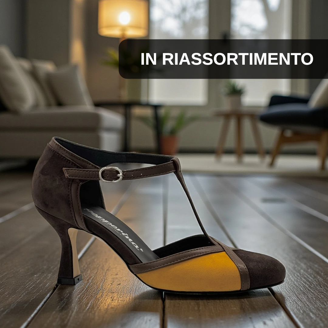 Realizzata artigianalmente in morbida camoscio e pelle, Ottanio e Ocra, con fodera e sottopiede imbottito in vera pelle.