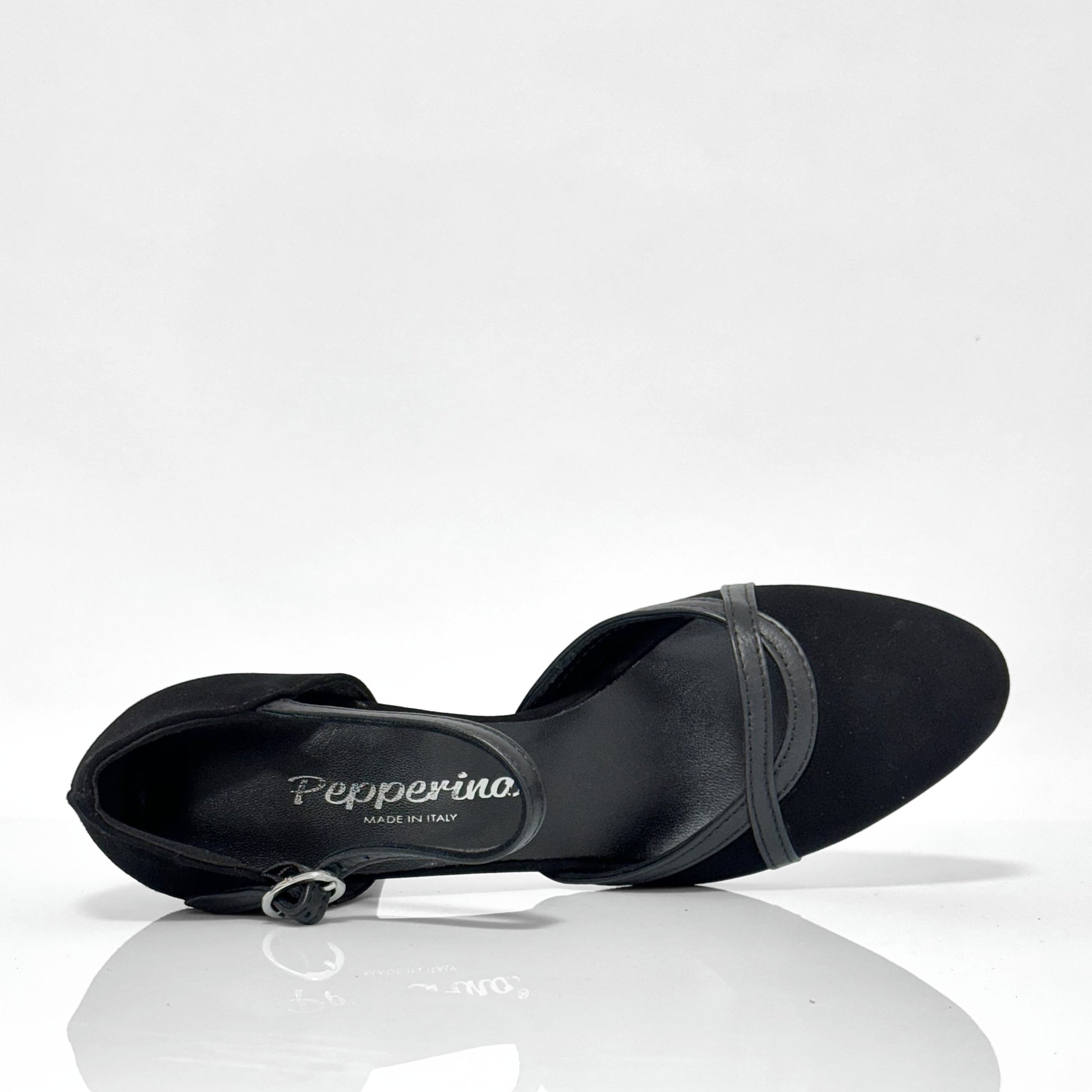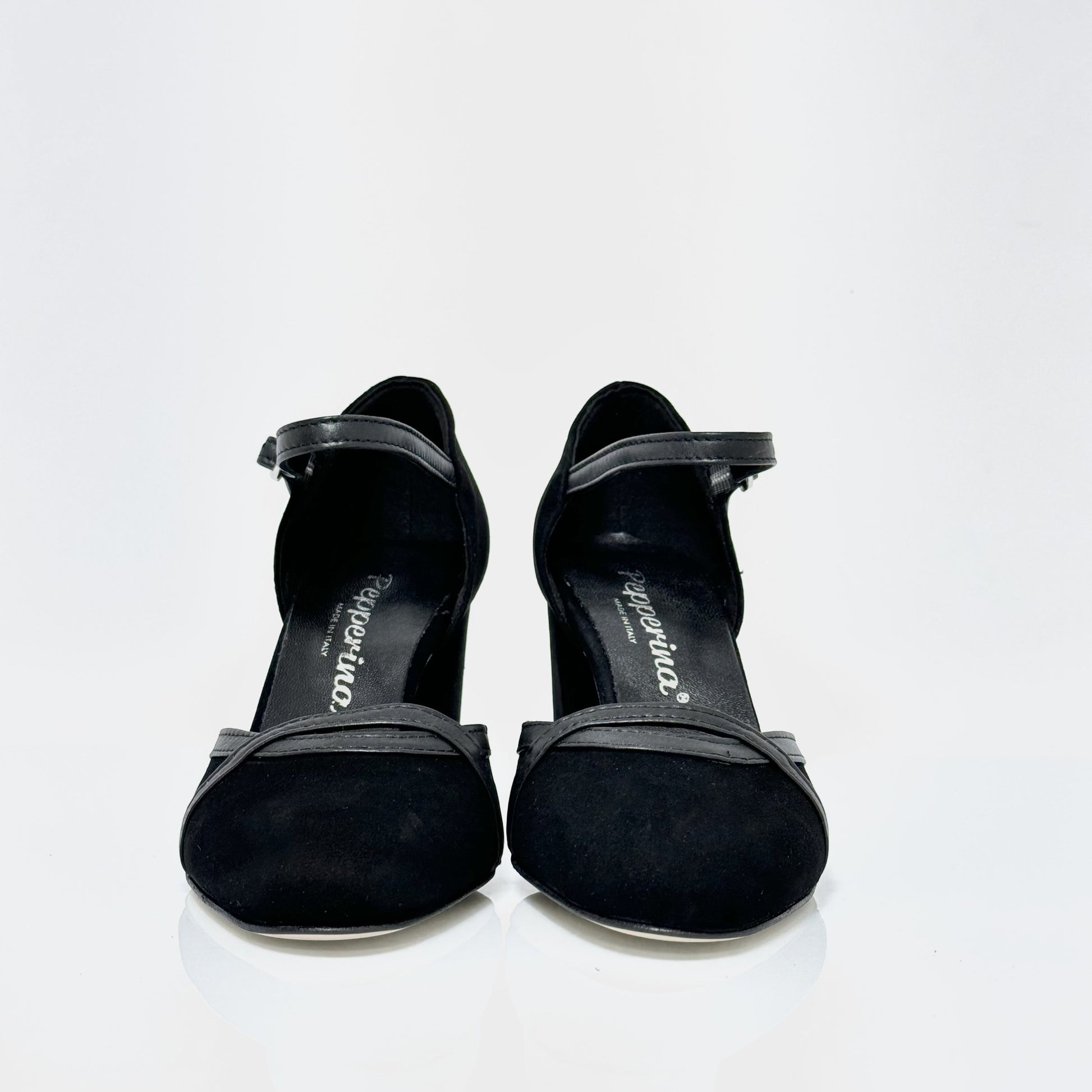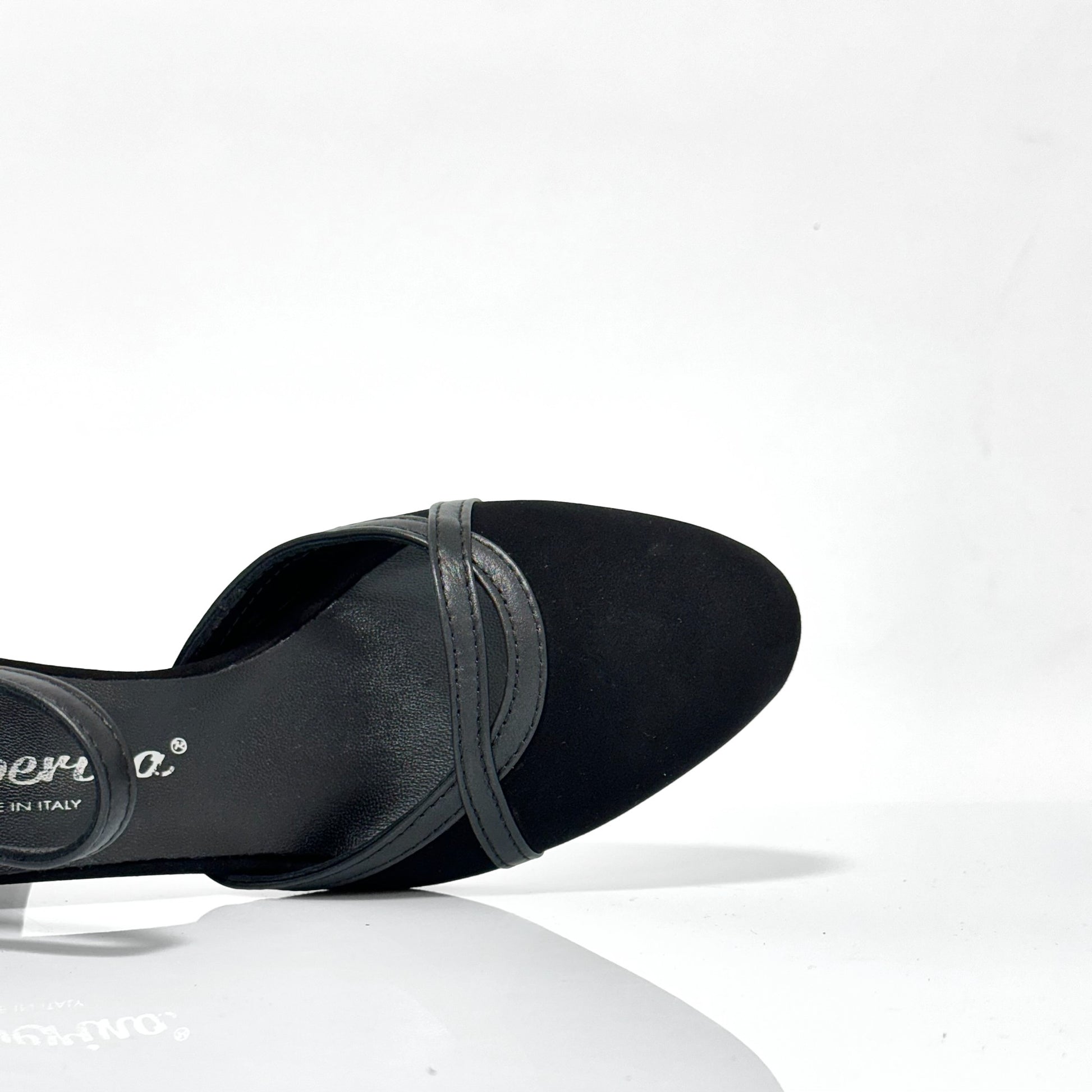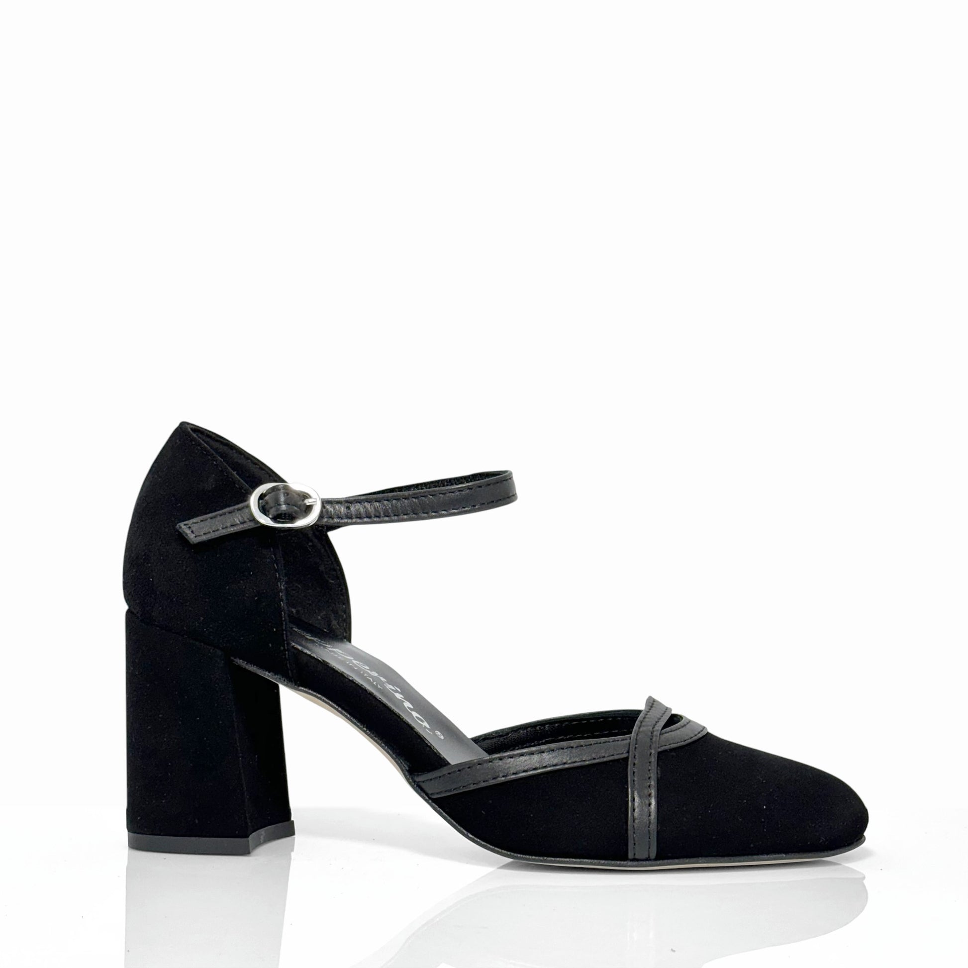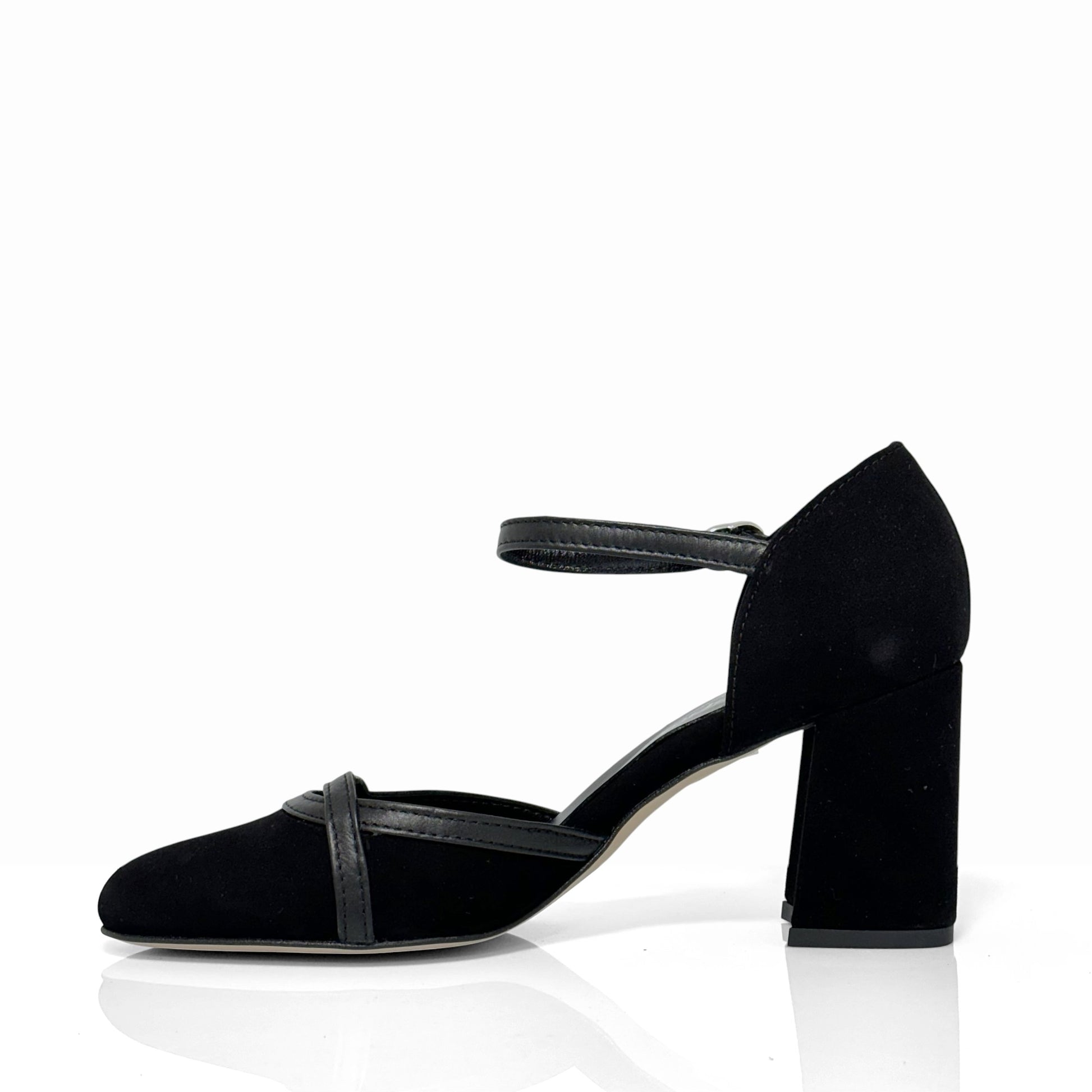 Charleston artigianale in morbido camoscio idrorepellente, con tacco largo e cinturino alla caviglia impreziosito da inserti in pelle.