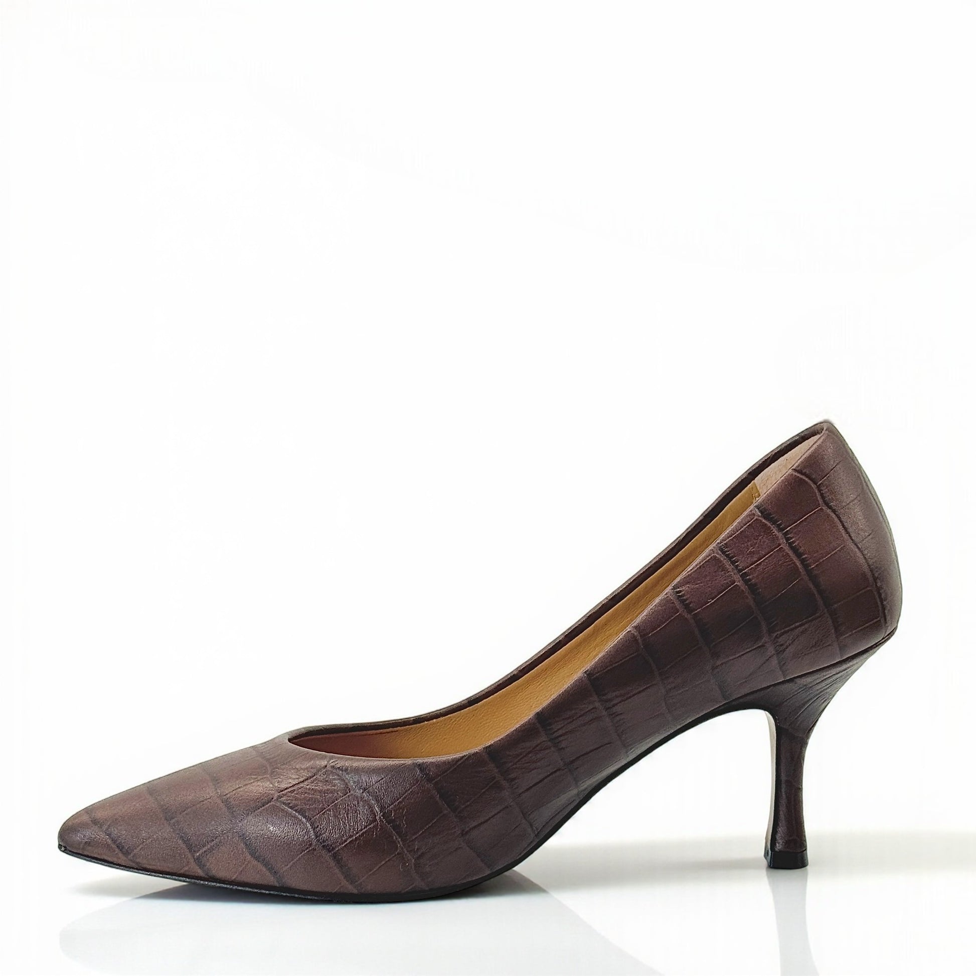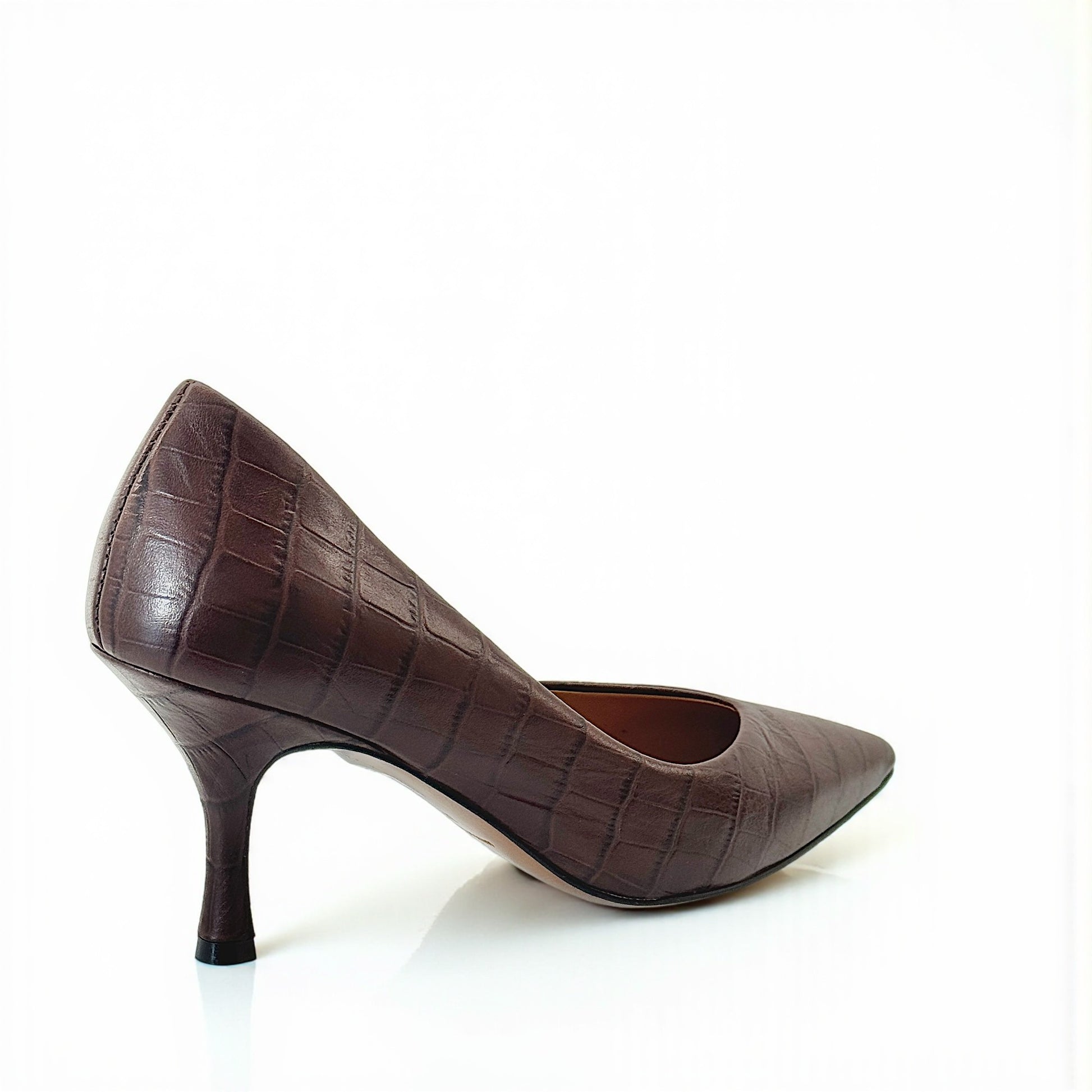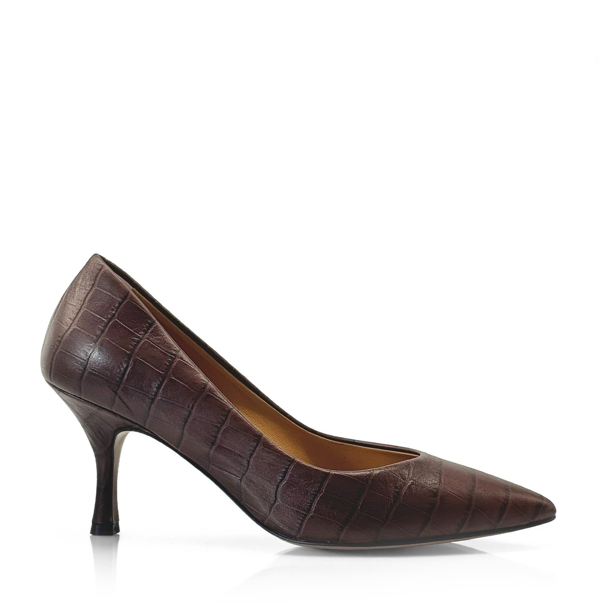 Décolleté Vivara in pelle stampato cocco marrone con punta affusolata e tacco a rocchetto 7 cm. Lavorazione artigianale a sacchetto, sottopiede imbottito e suola flessibile per una calzata confortevole.