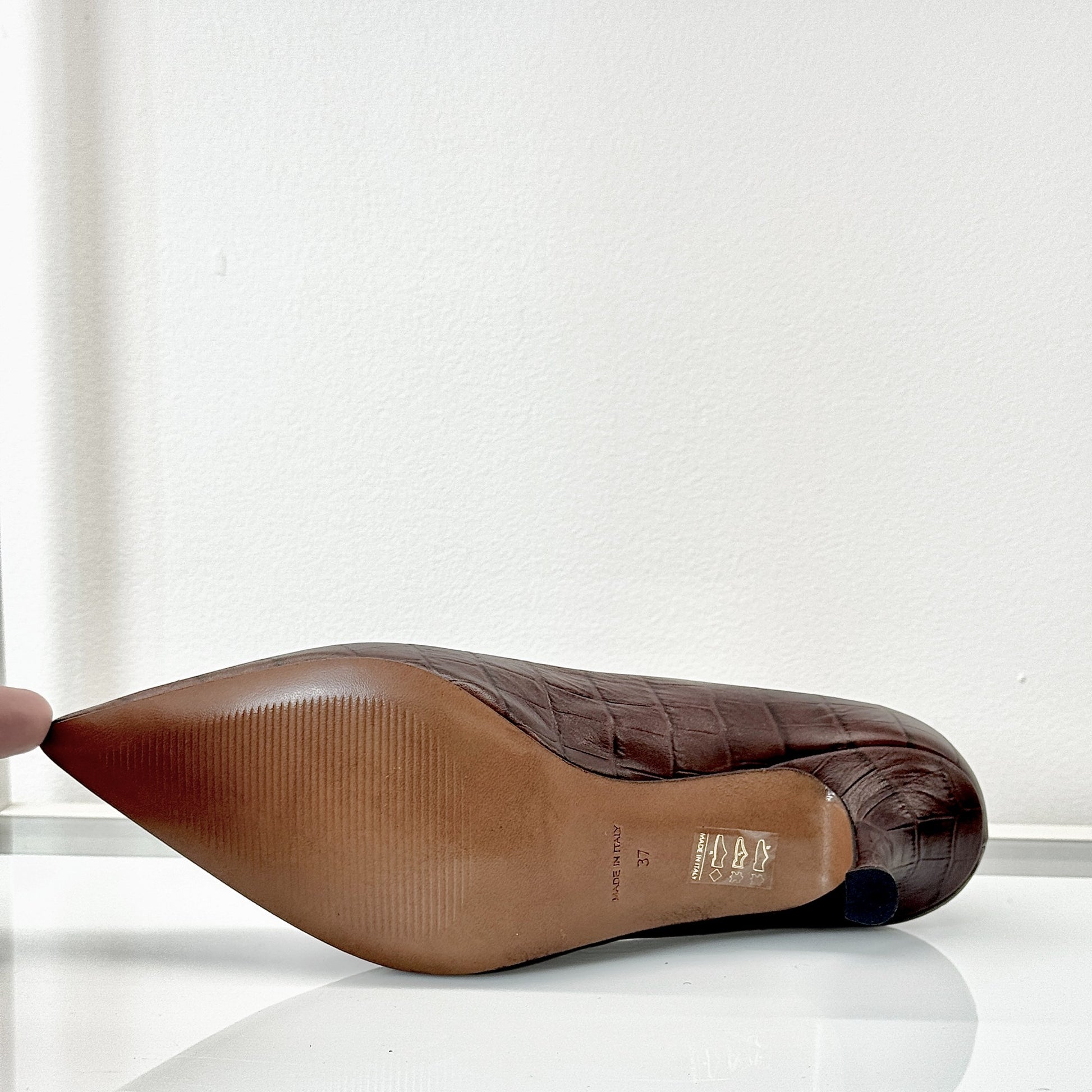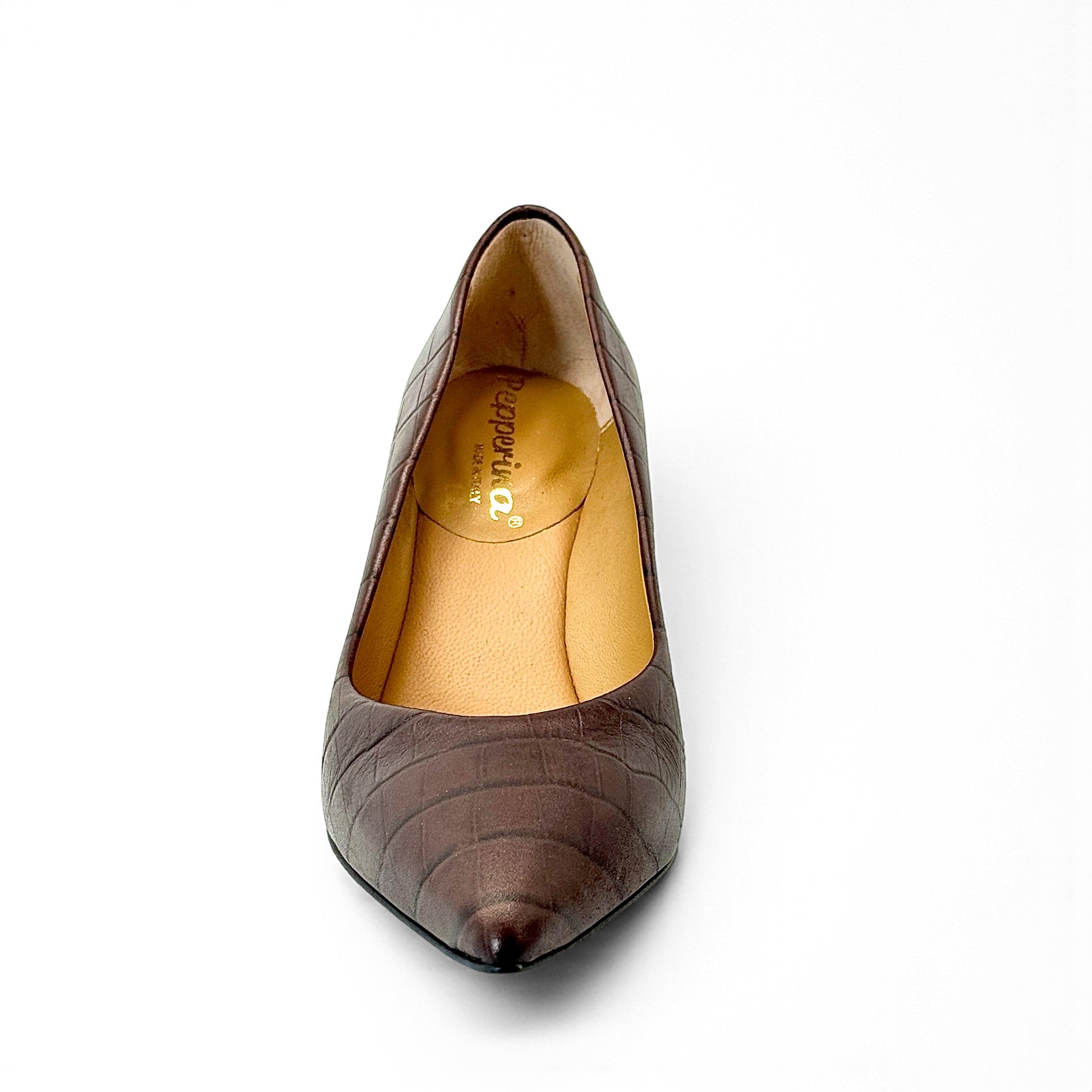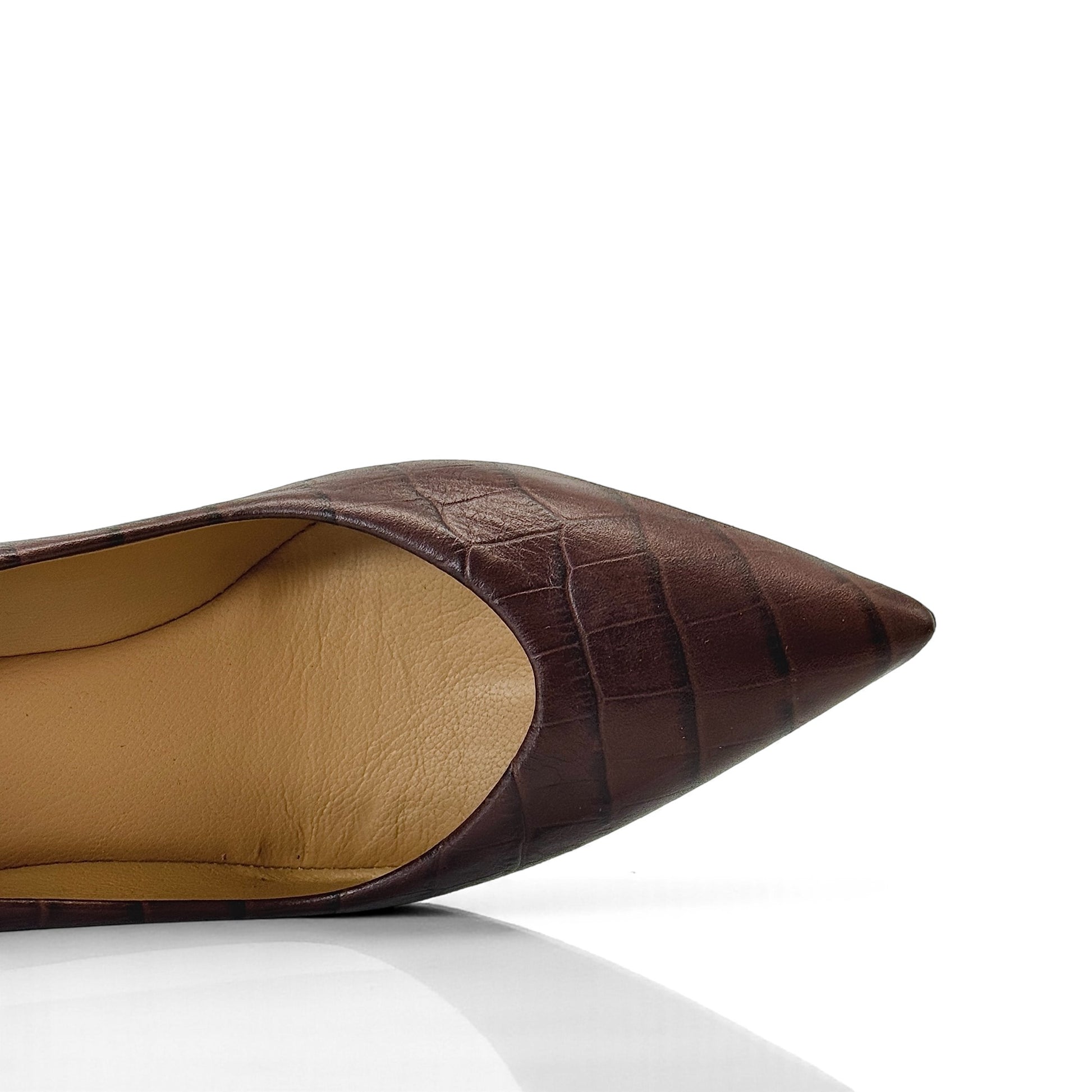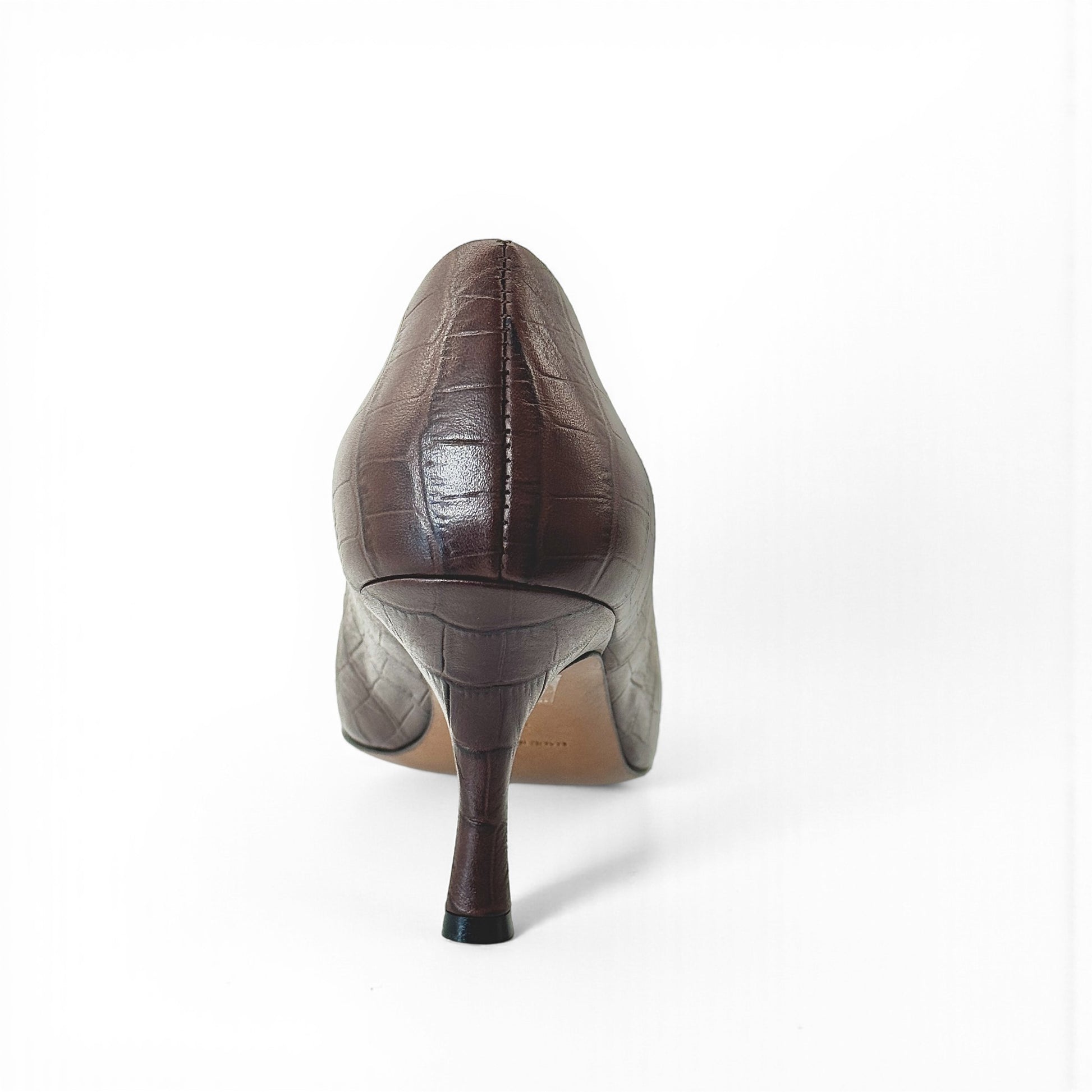 Décolleté Vivara in pelle stampato cocco marrone con punta affusolata e tacco a rocchetto 7 cm. Lavorazione artigianale a sacchetto, sottopiede imbottito e suola flessibile per una calzata confortevole.