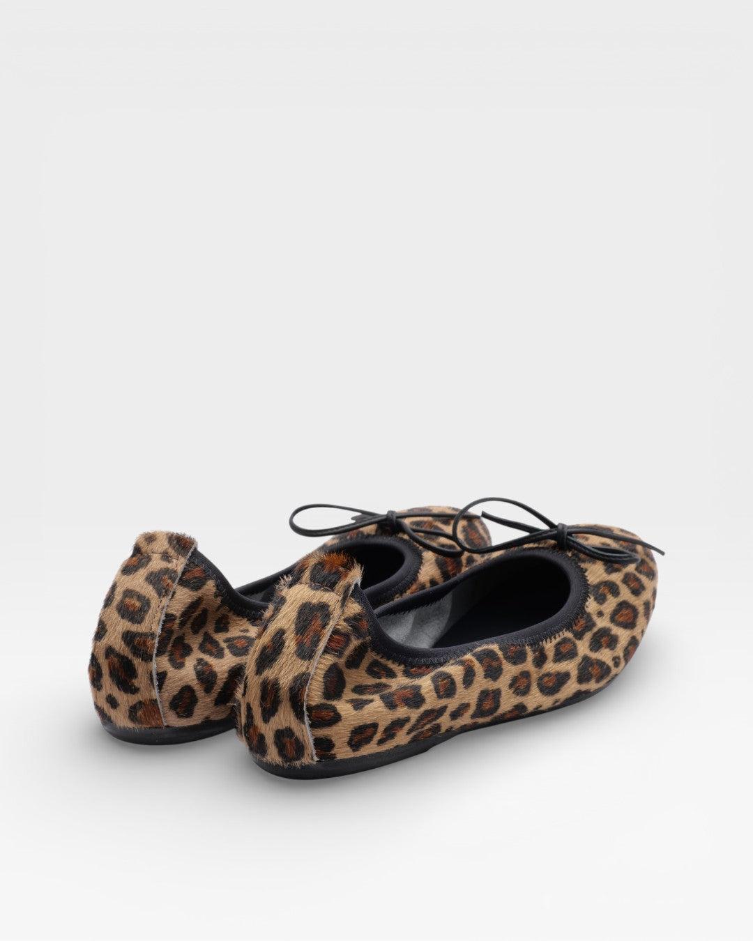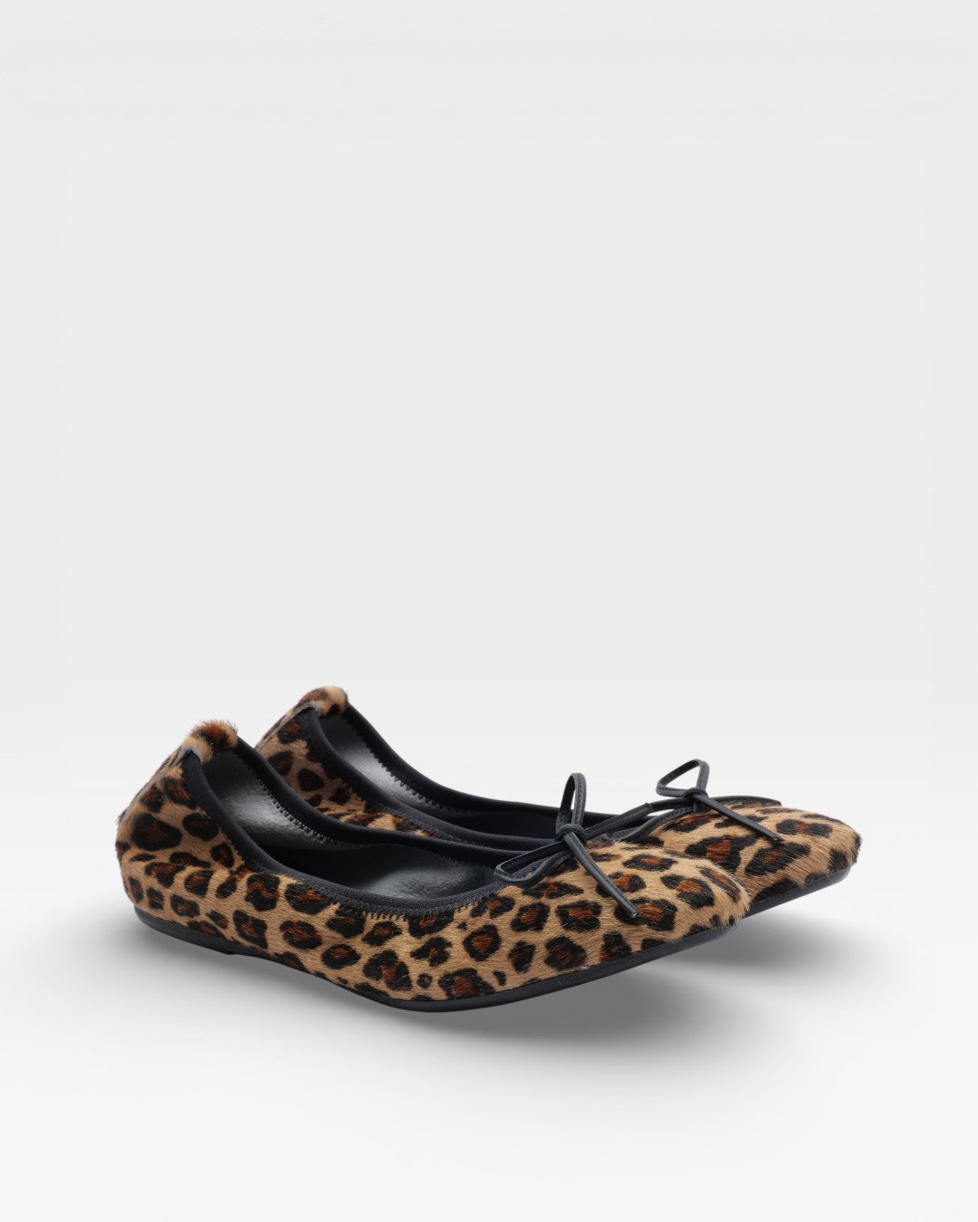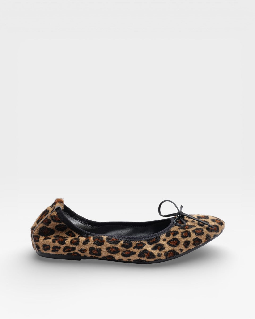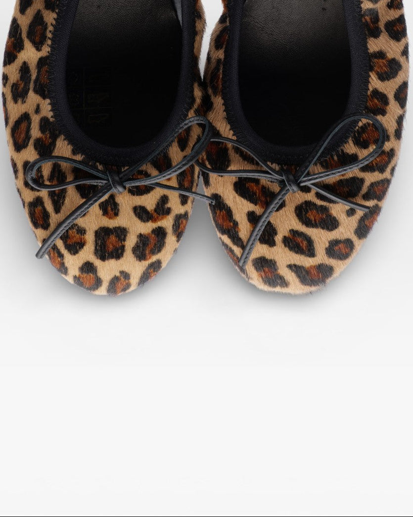Lederballerina Gesprenkelter Ponyfell-Effekt mit klaren, minimalistischen Linien. Ausgestattet mit einer internen Fersenerhöhung, die die Ferse stützt, ohne das Gewicht vollständig auf den hinteren Fußbereich zu verlagern.