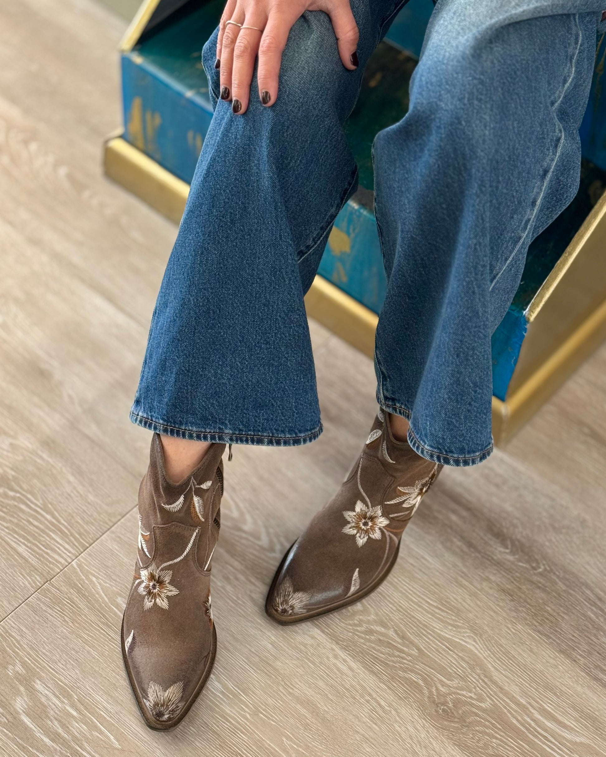 Stivaletto Camperos donna in camoscio moro impreziosito da raffinati ricami floreali tono su tono. Linea femminile, anima western chic e comfort assoluto per ogni giorno.