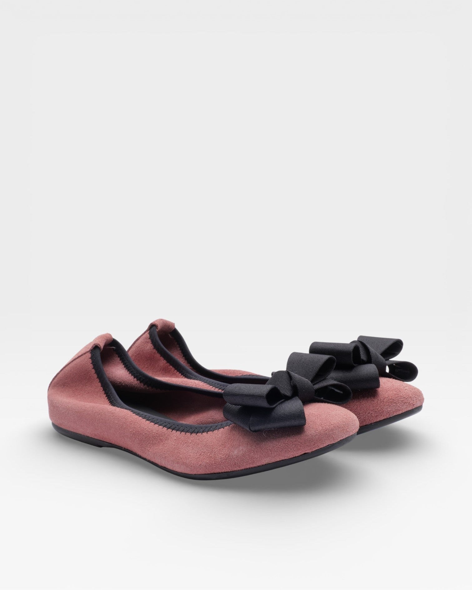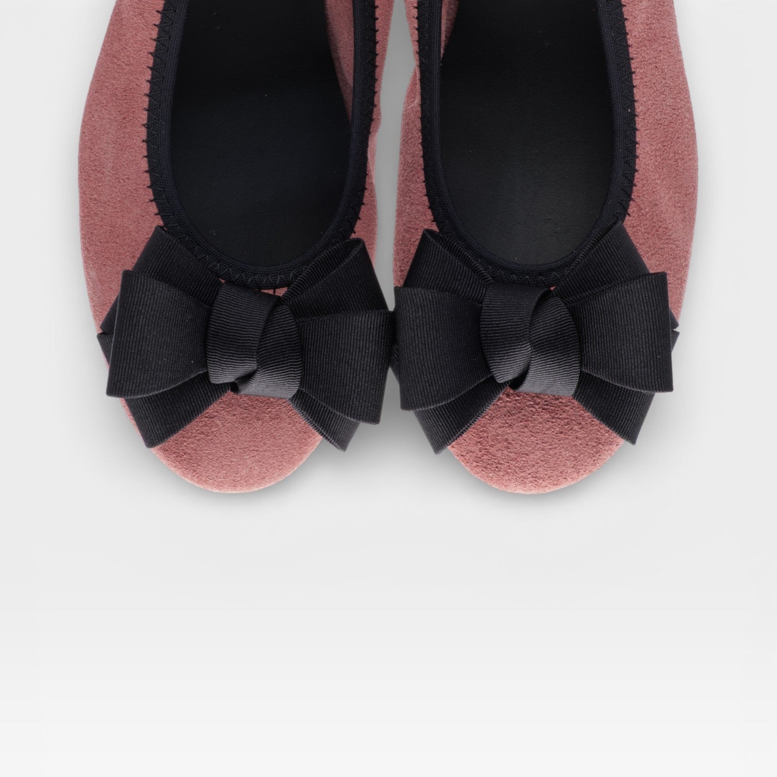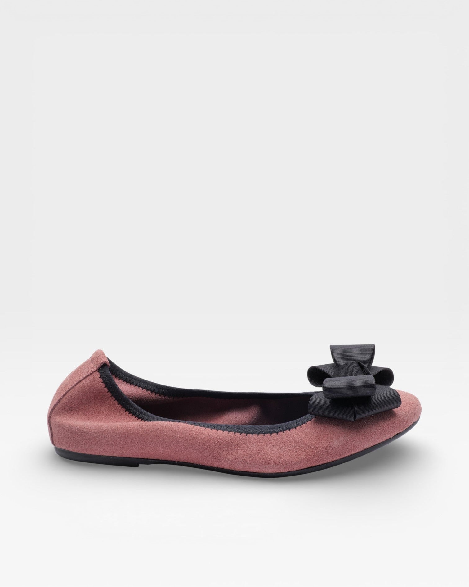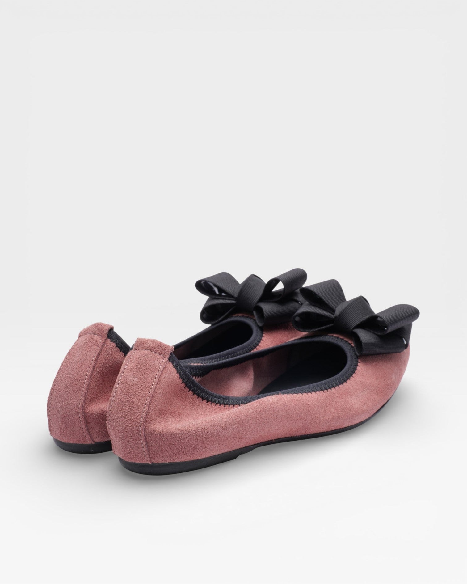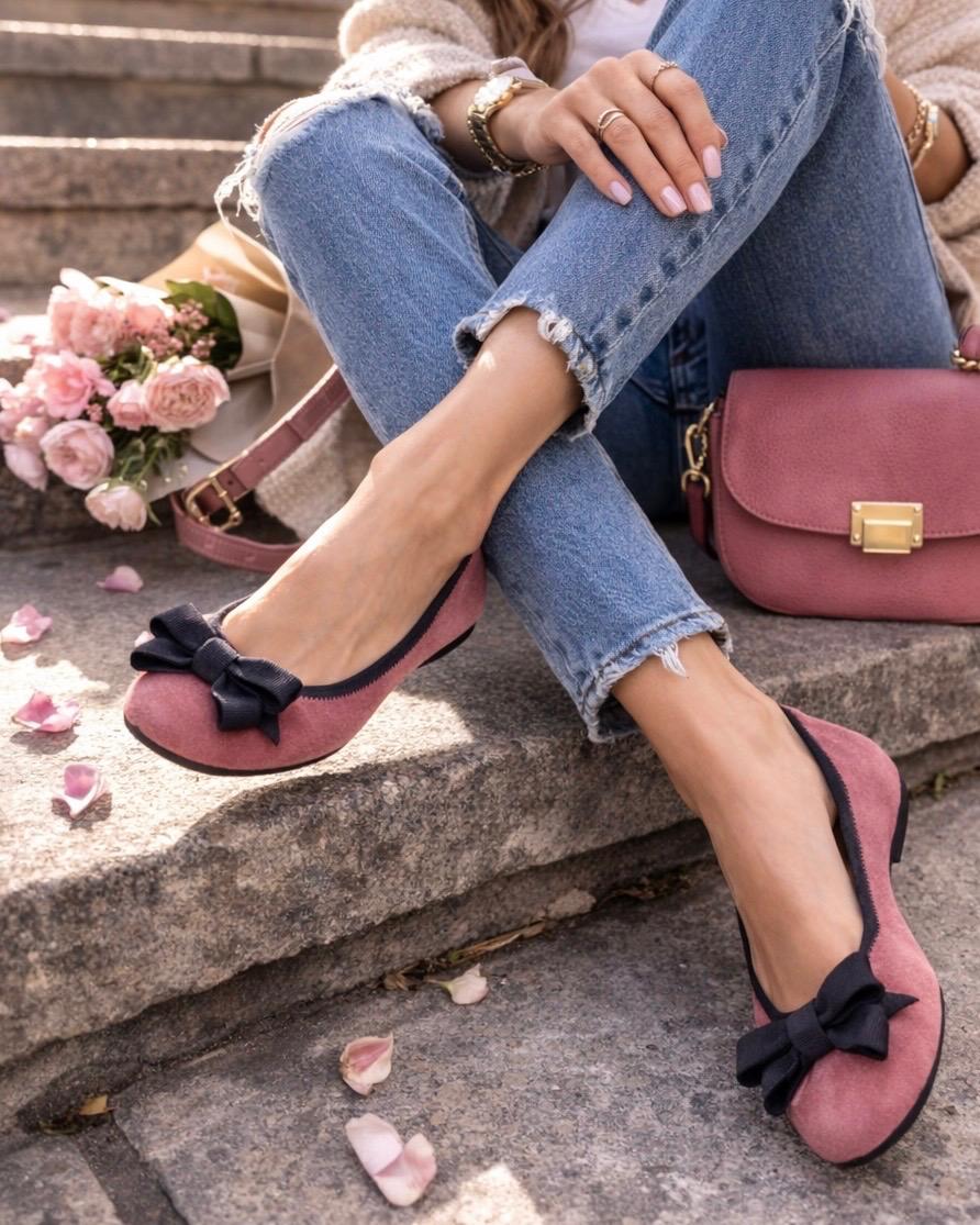 Ballerina aus antikrosa Wildledervelours Mit einer dunkelbraunen Ripsbandschleife und einem 1,5 cm hohen Absatz. Zart und doch strukturiert – perfekt für Frühjahr/Sommer 2026.