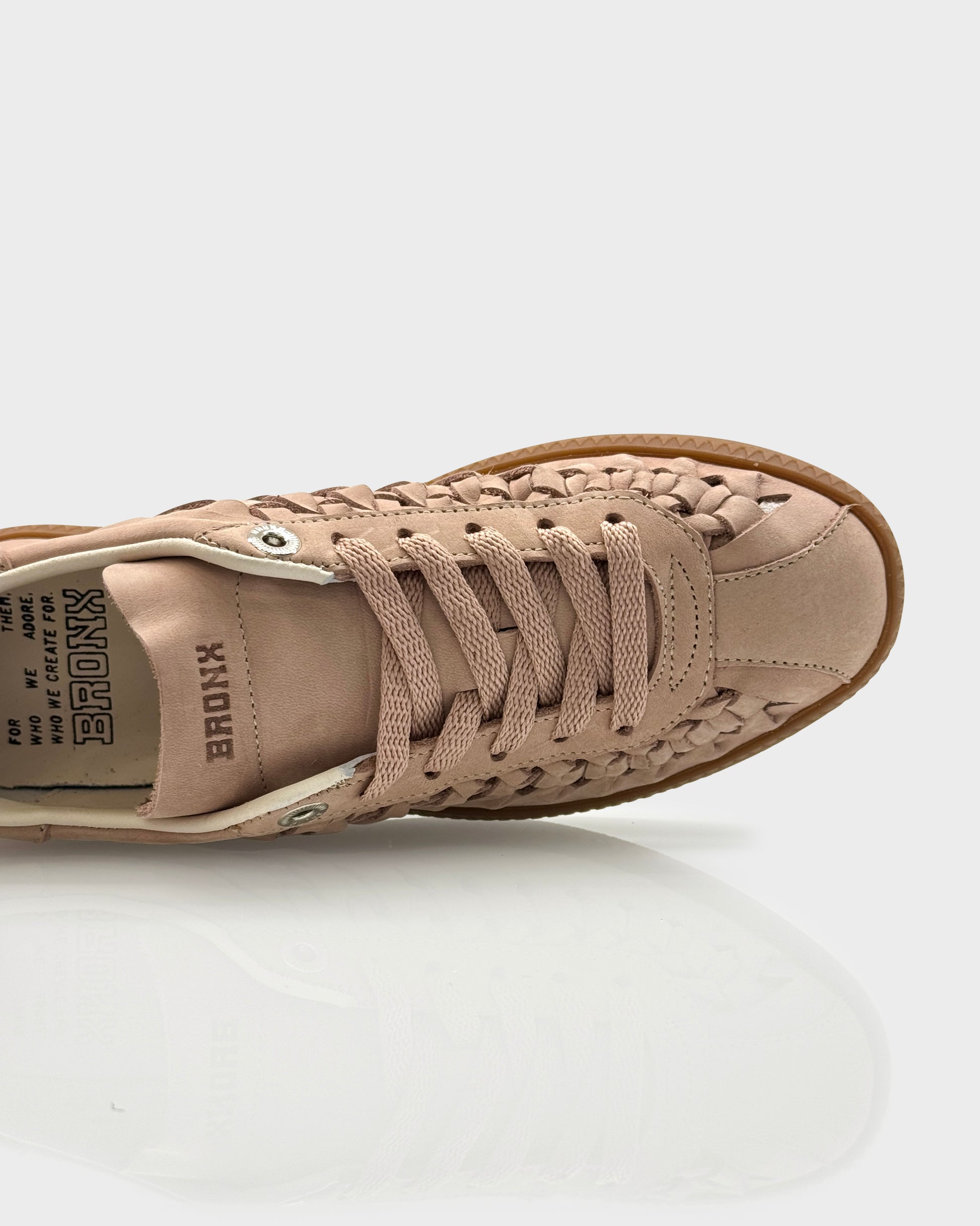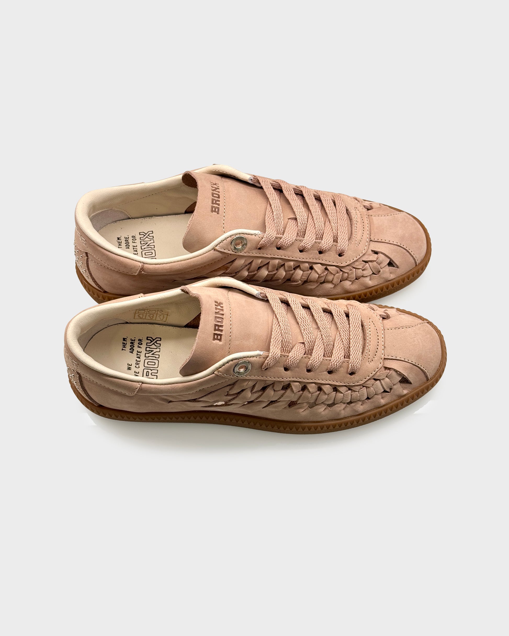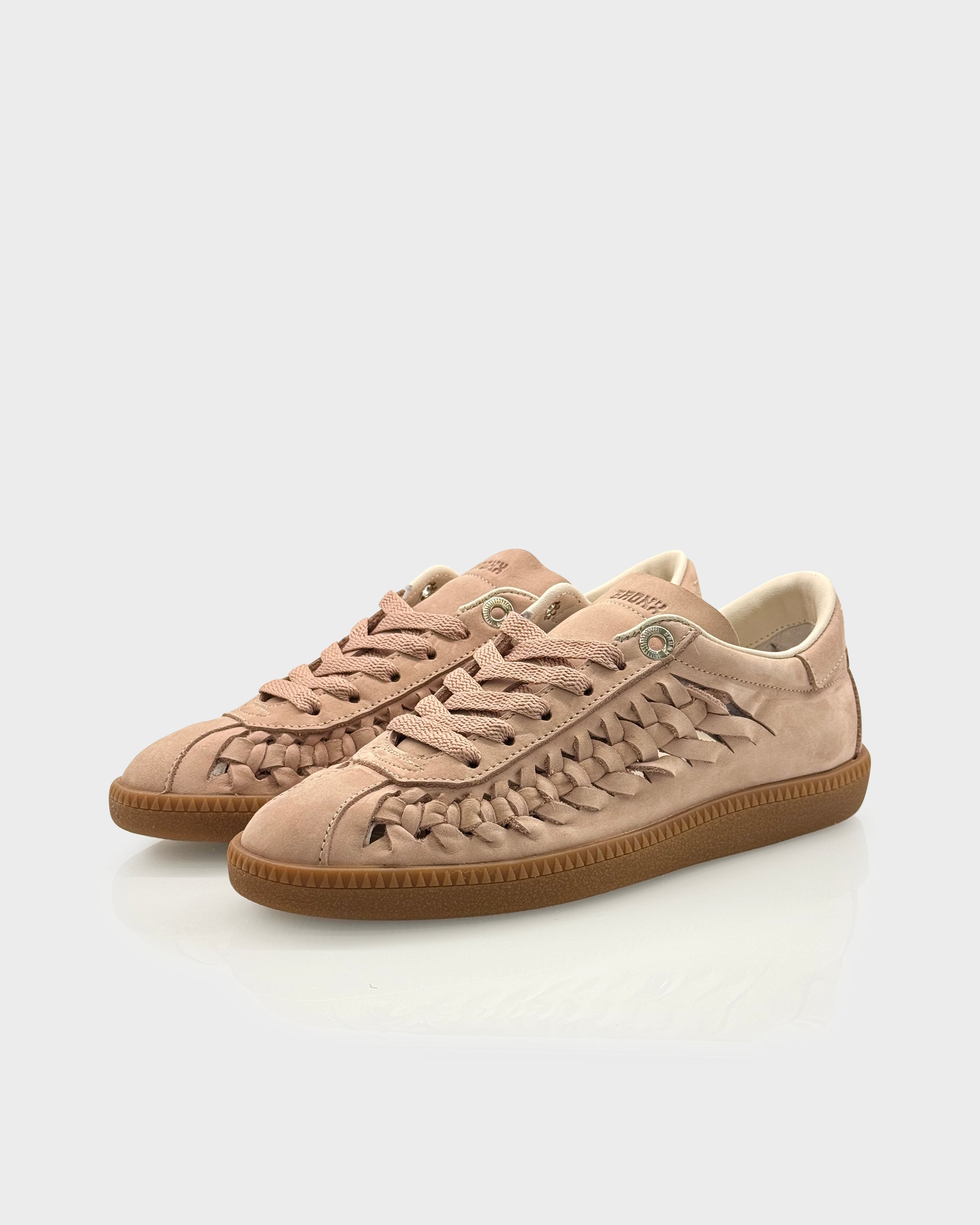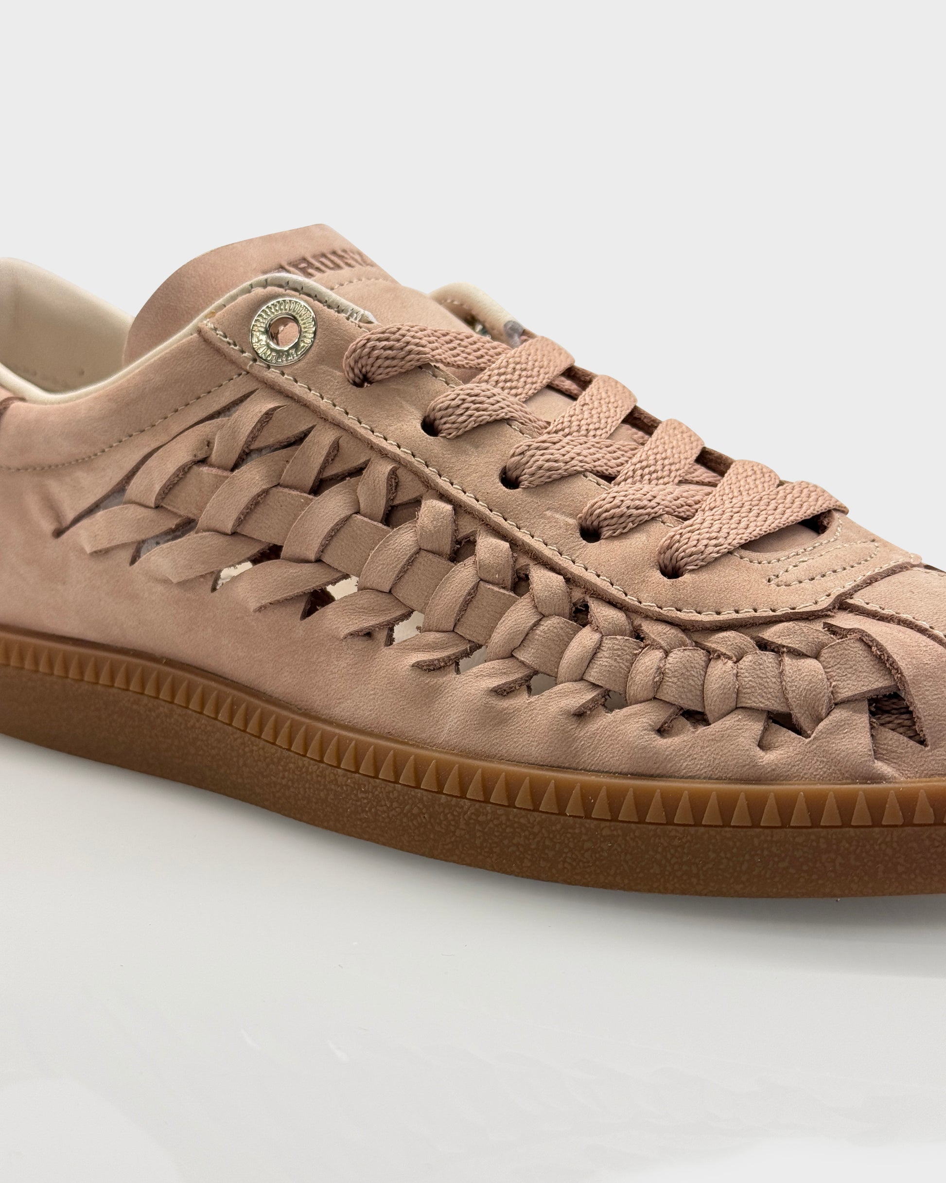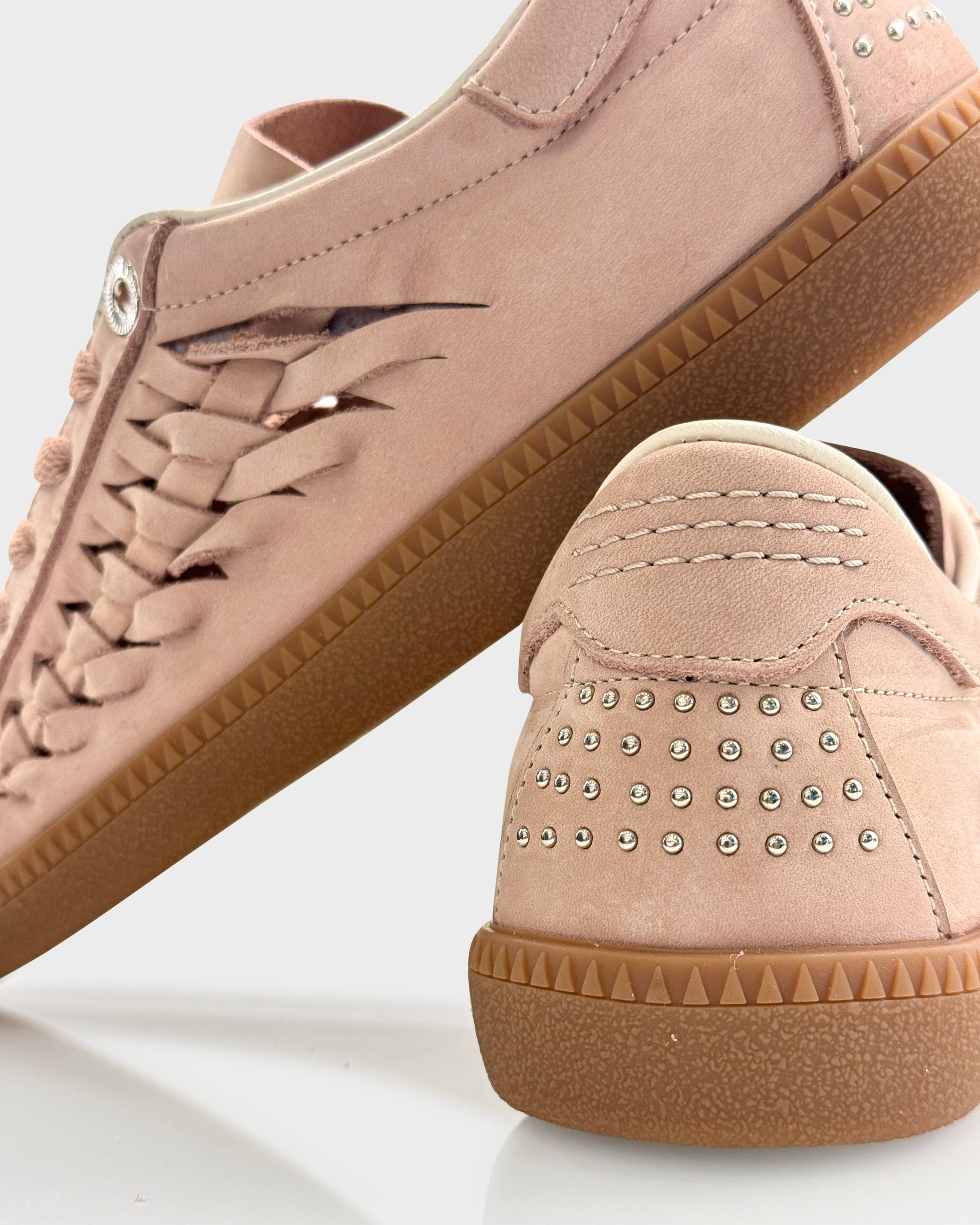 Sneakers donna in nabuk morbido color Blush con suola gum e dettaglio intrecciato sul tallone. Un modello contemporaneo e ricercato, impreziosito da microborchie sul tallone che donano carattere senza appesantire la linea.