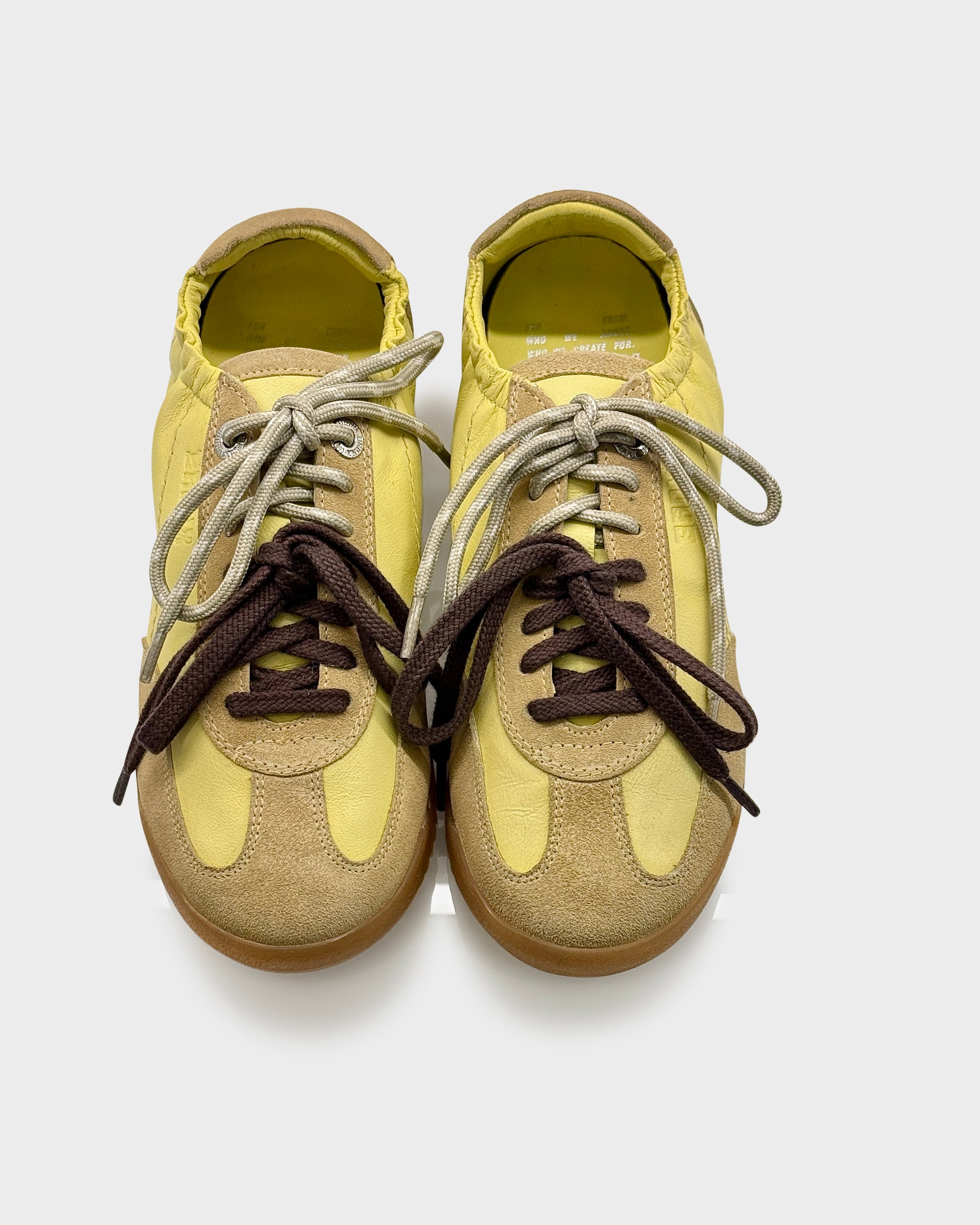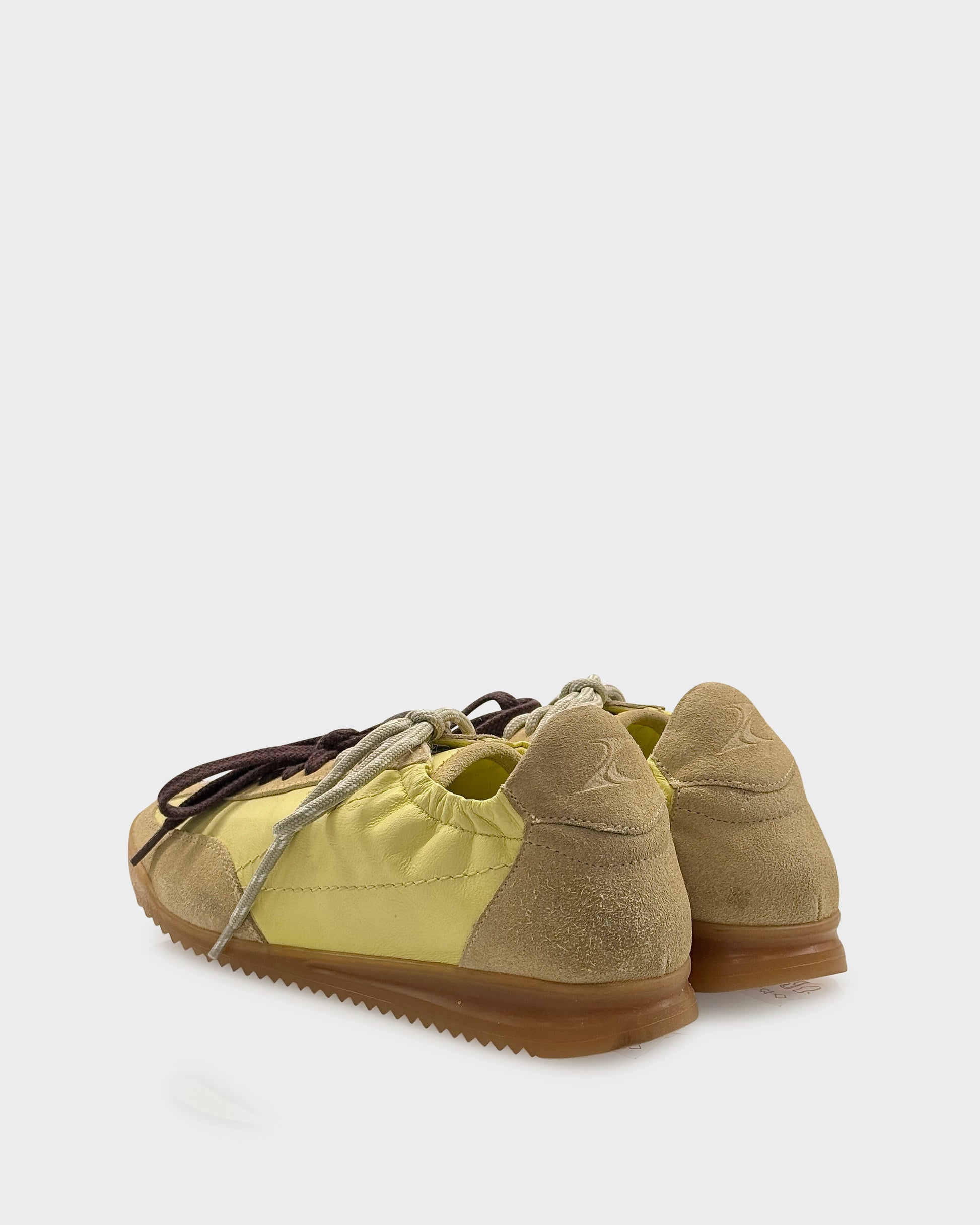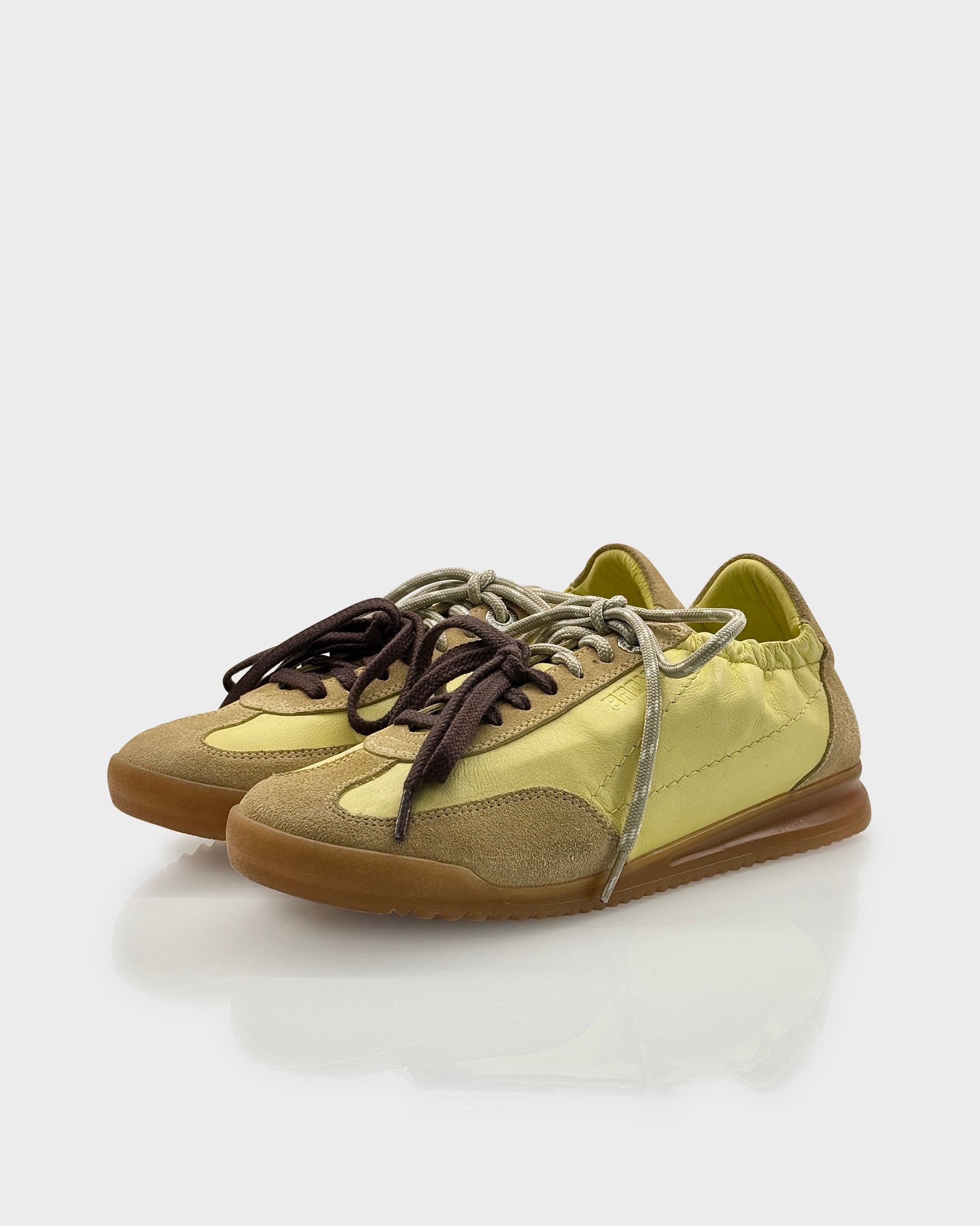 Sneakers donna in pelle morbida color Butter Yellow con inserti in suede e lacci a contrasto. Linea retro running contemporanea, pensata per chi cerca comfort, qualità e un tocco di personalità.
