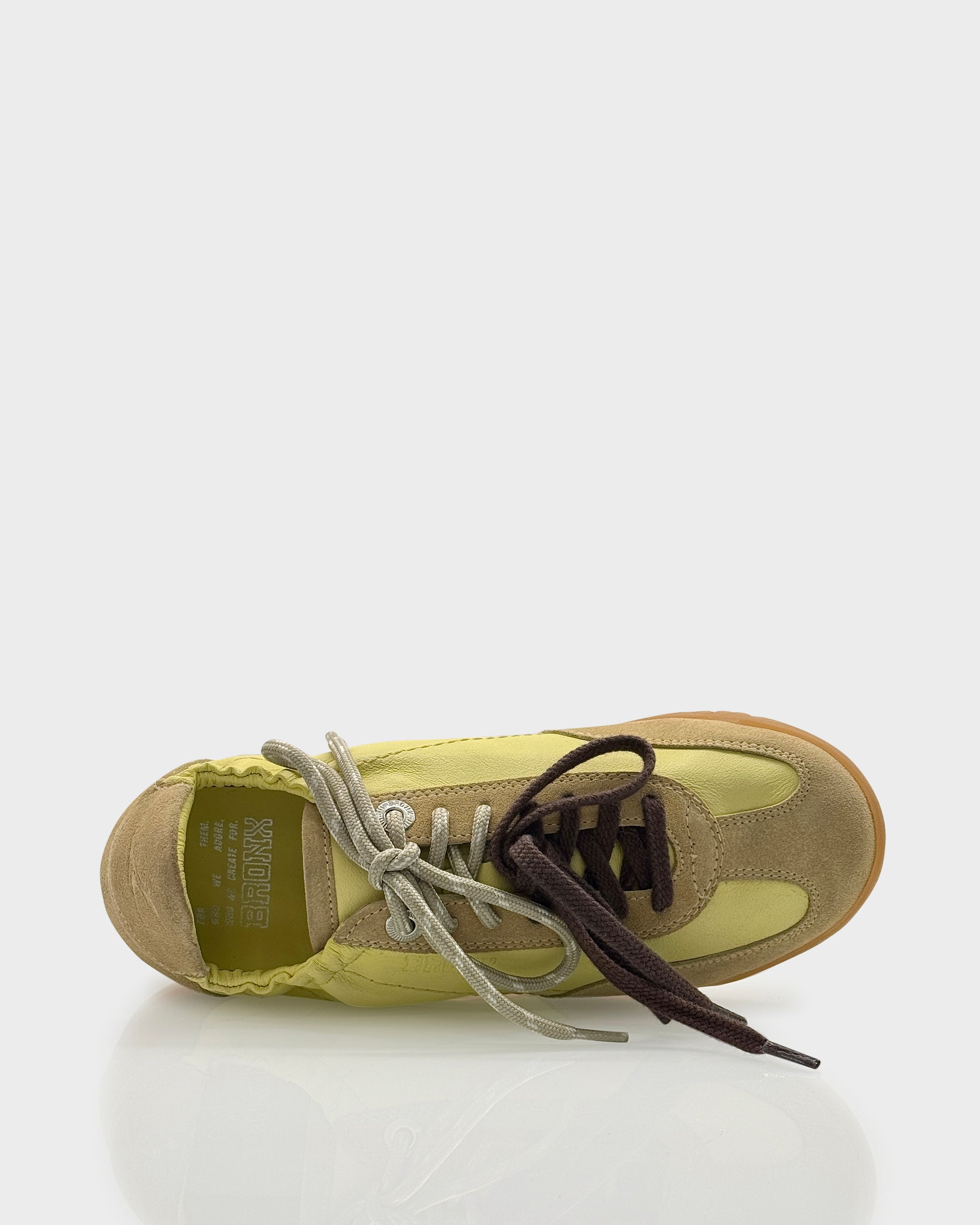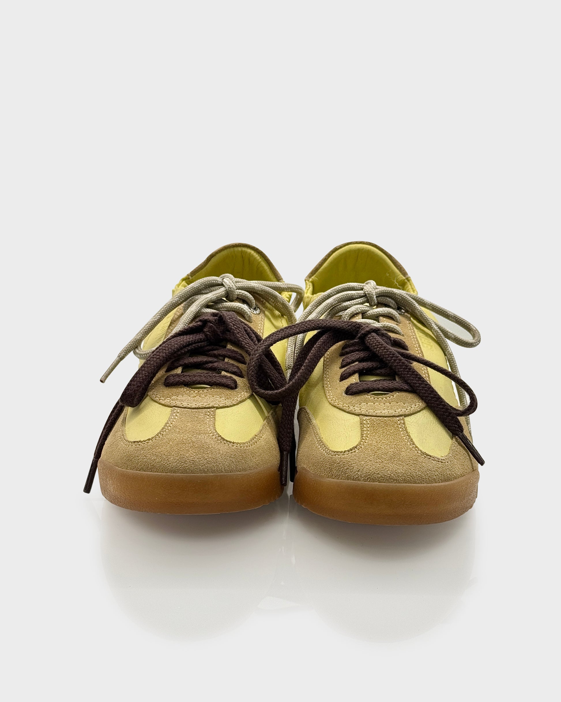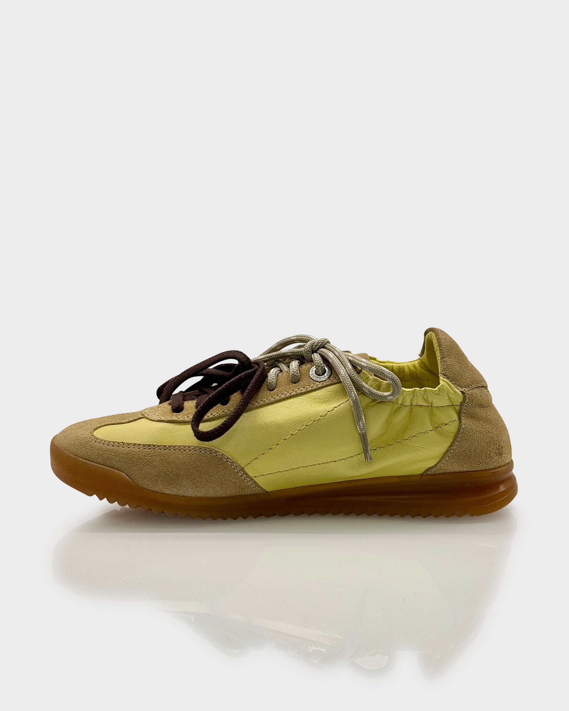 Sneakers donna in pelle morbida color Butter Yellow con inserti in suede e lacci a contrasto. Linea retro running contemporanea, pensata per chi cerca comfort, qualità e un tocco di personalità.