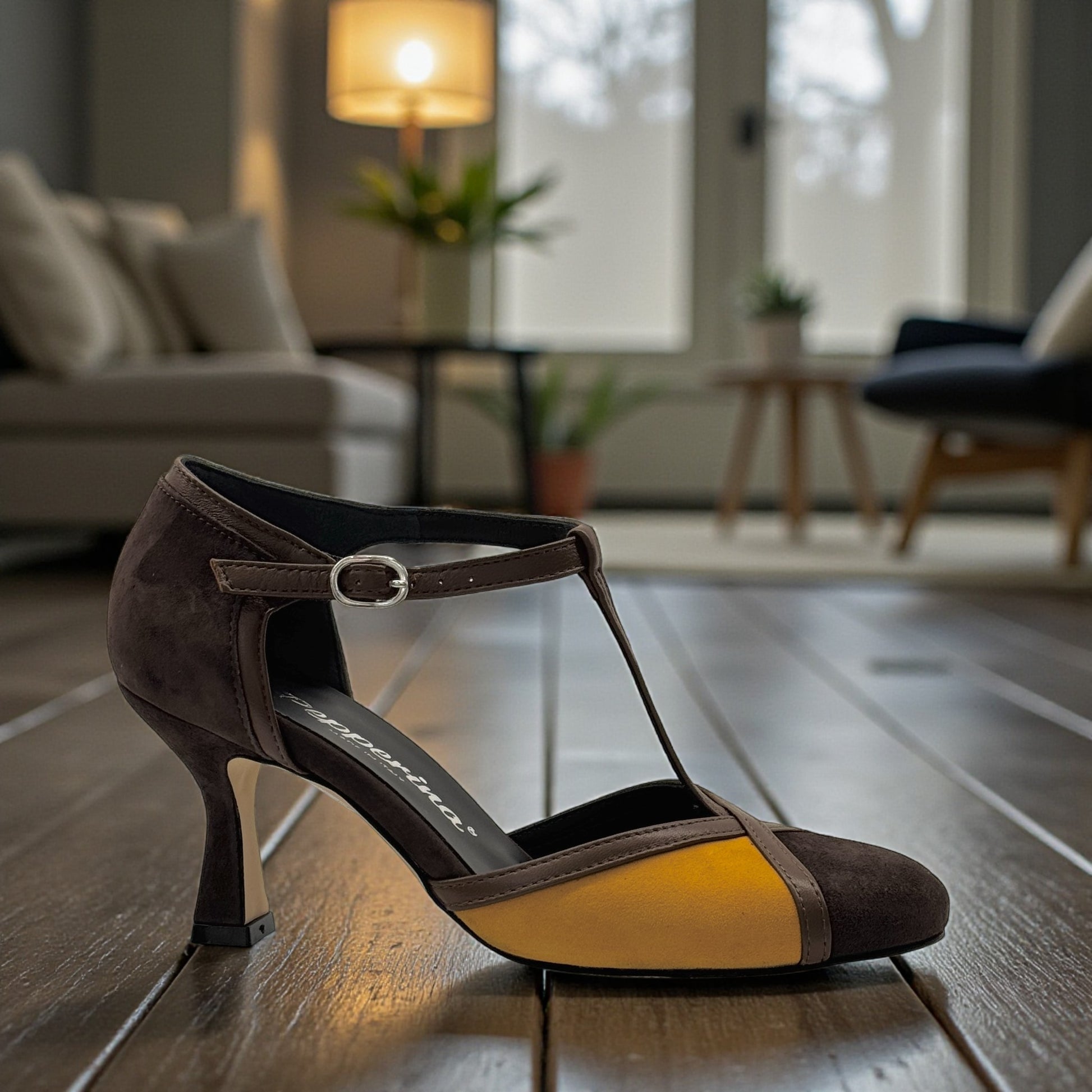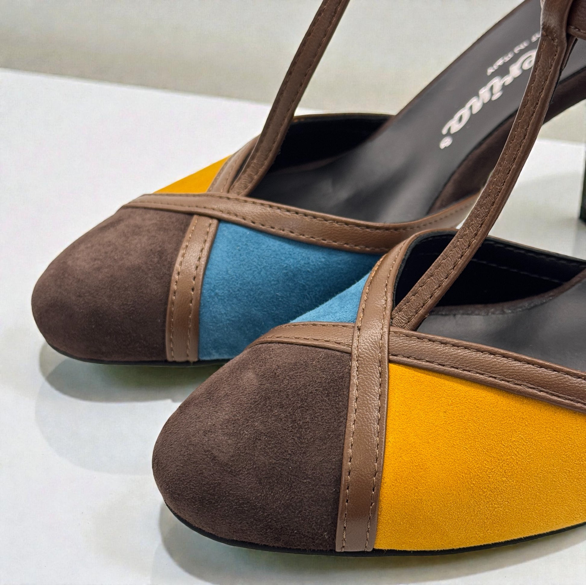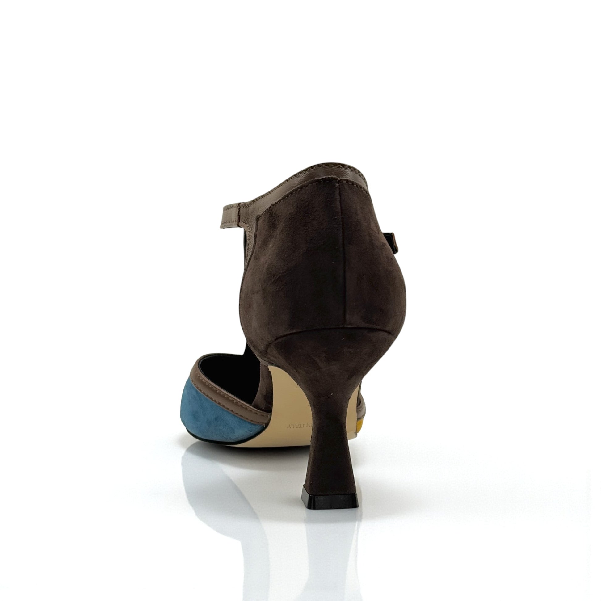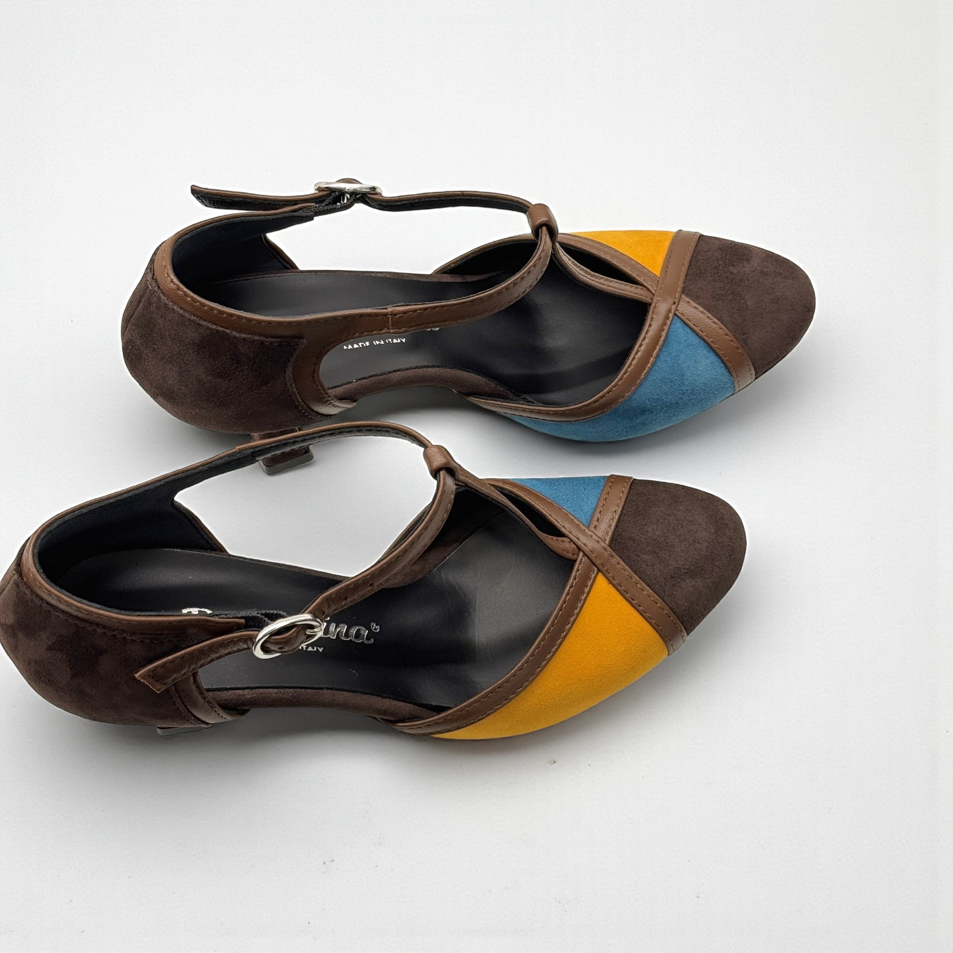 Handgefertigt aus weichem Wildleder und Leder in den Farben Petrol und Ocker, mit echtem Lederfutter und gepolsterter Innensohle. Der 7 cm hohe, stabile und ausbalancierte Blockabsatz bietet den Komfort eines 5 cm hohen Absatzes.