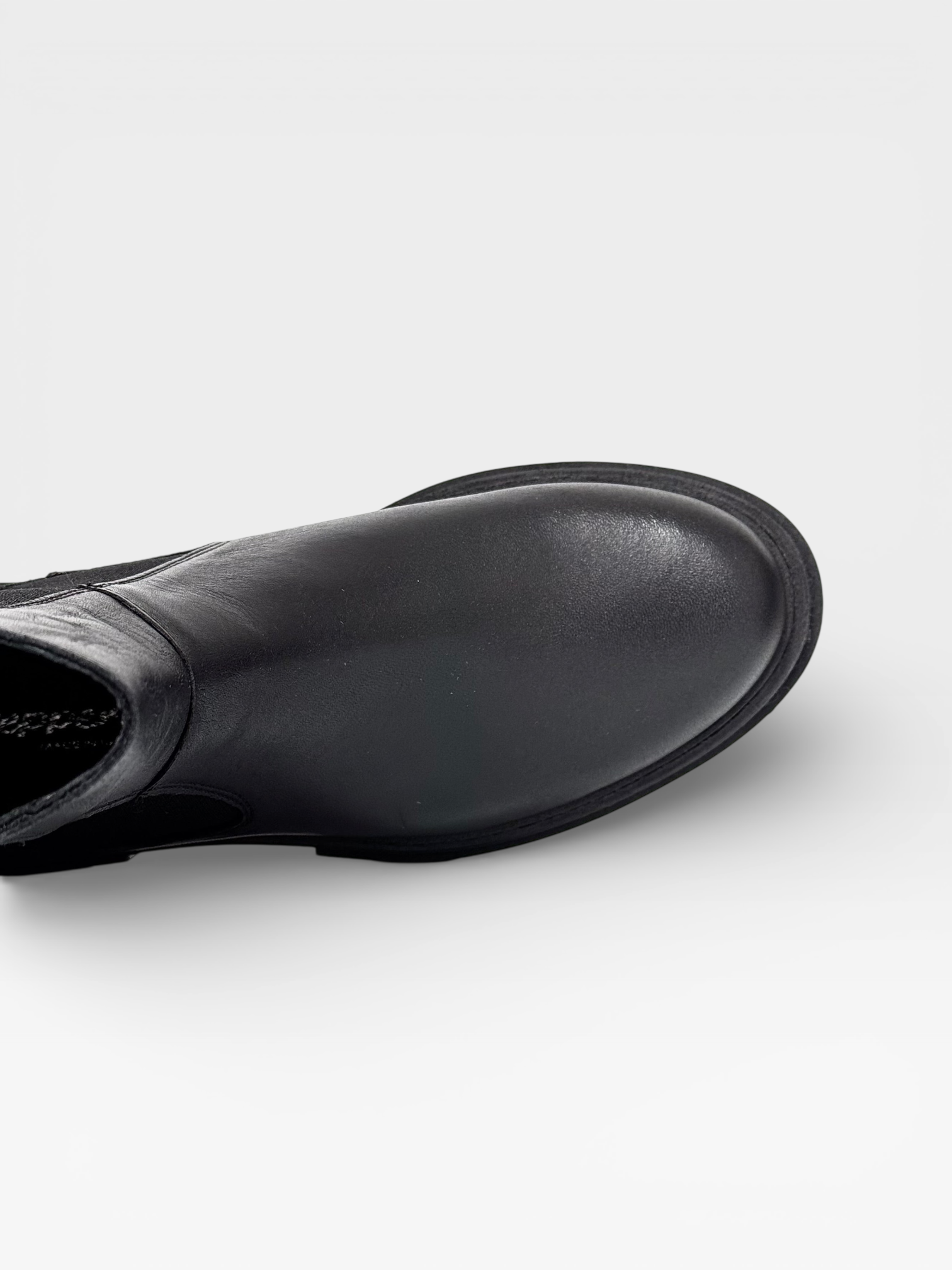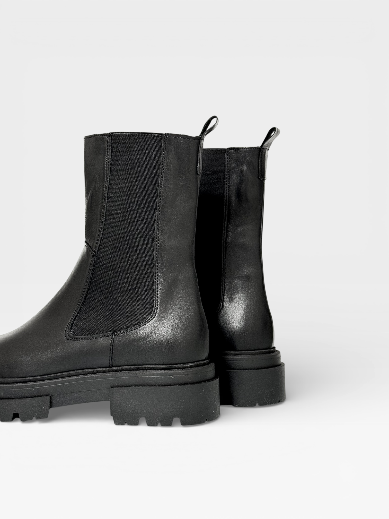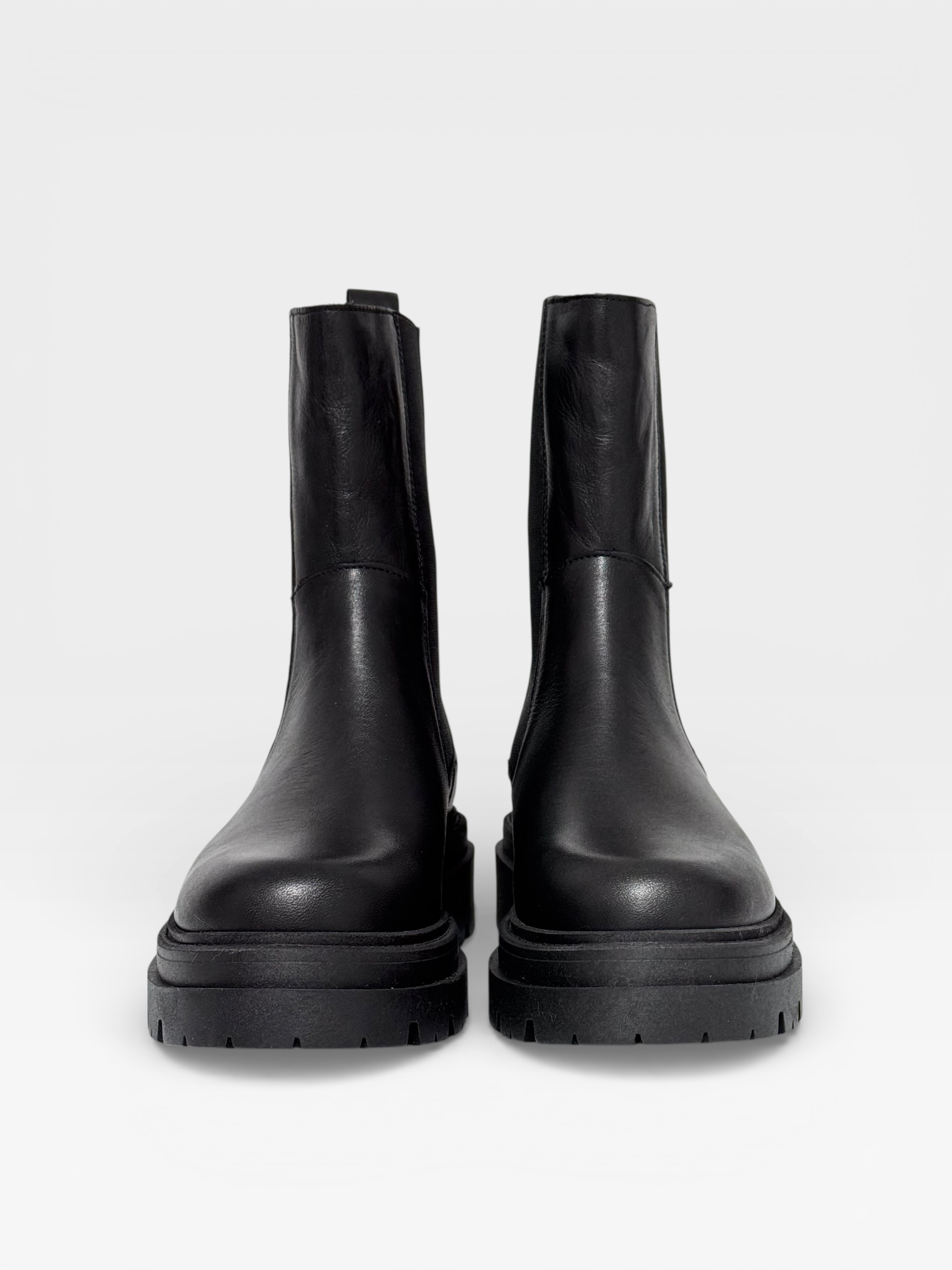 Stivaletto Combat boot in morbida pelle nera con suola carrarmato e linea grintosa, tra i best seller della collezione.