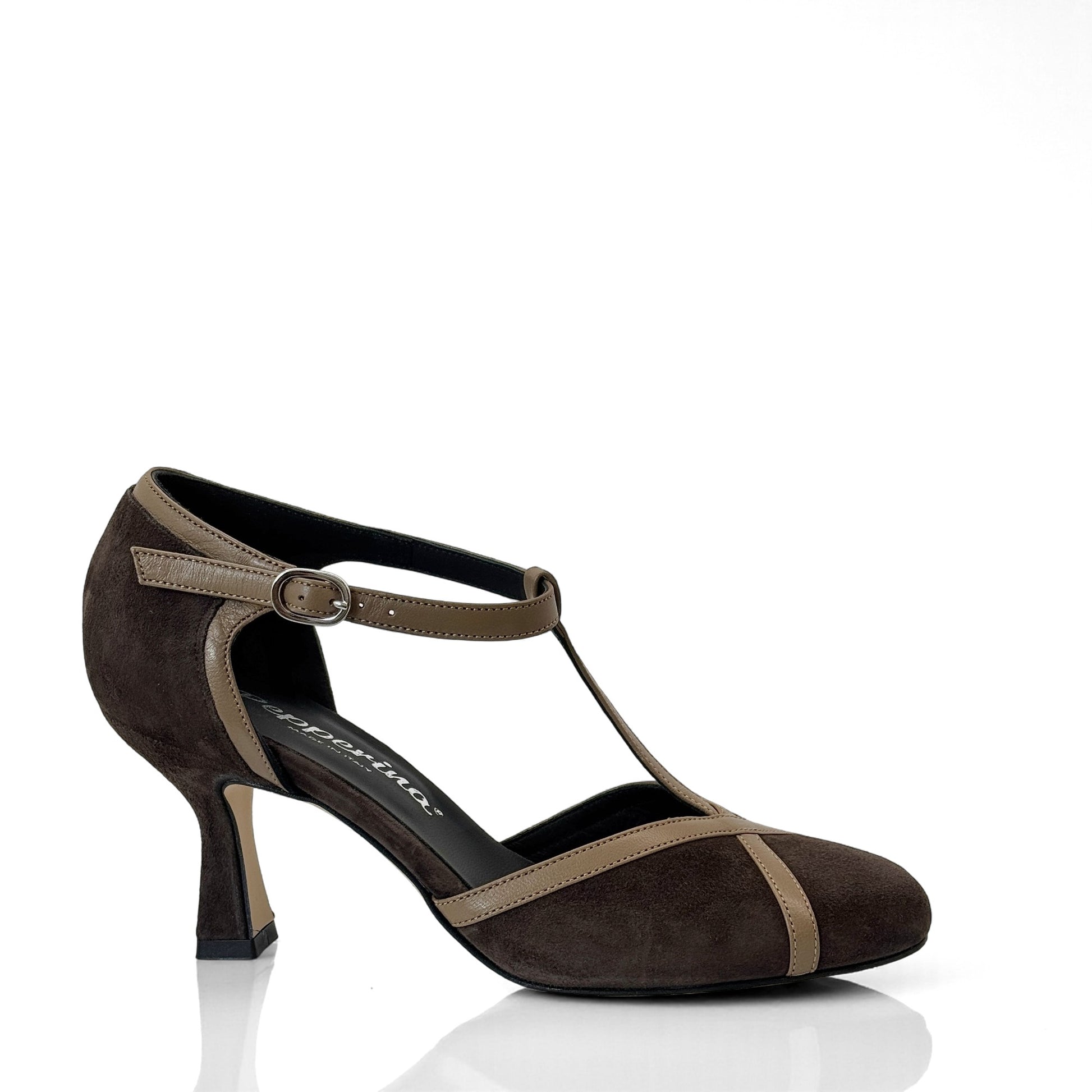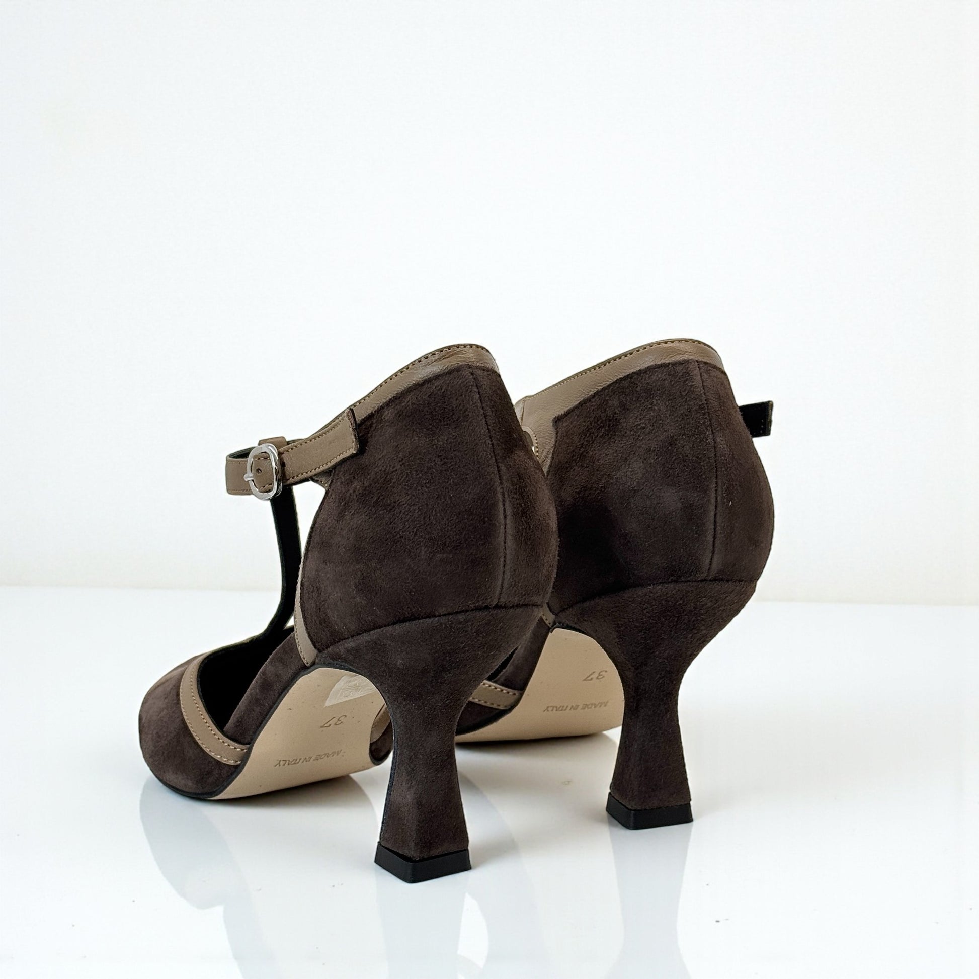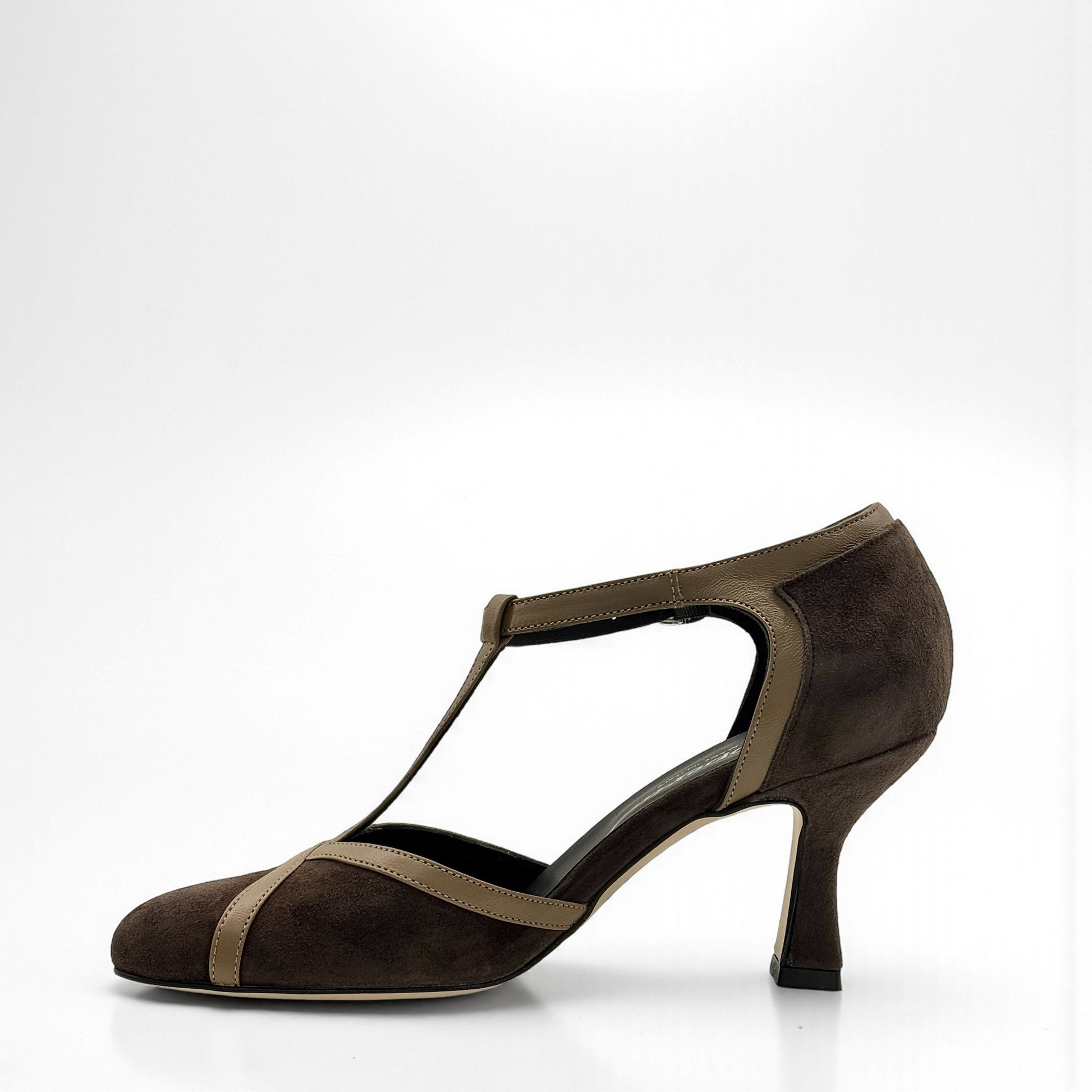 The Marika Charleston is our iconic model: feminine, comfortable, and elegant. Crafted from soft suede and leather with a T-strap and comfortable heel, it's the perfect balance of retro style and everyday comfort.