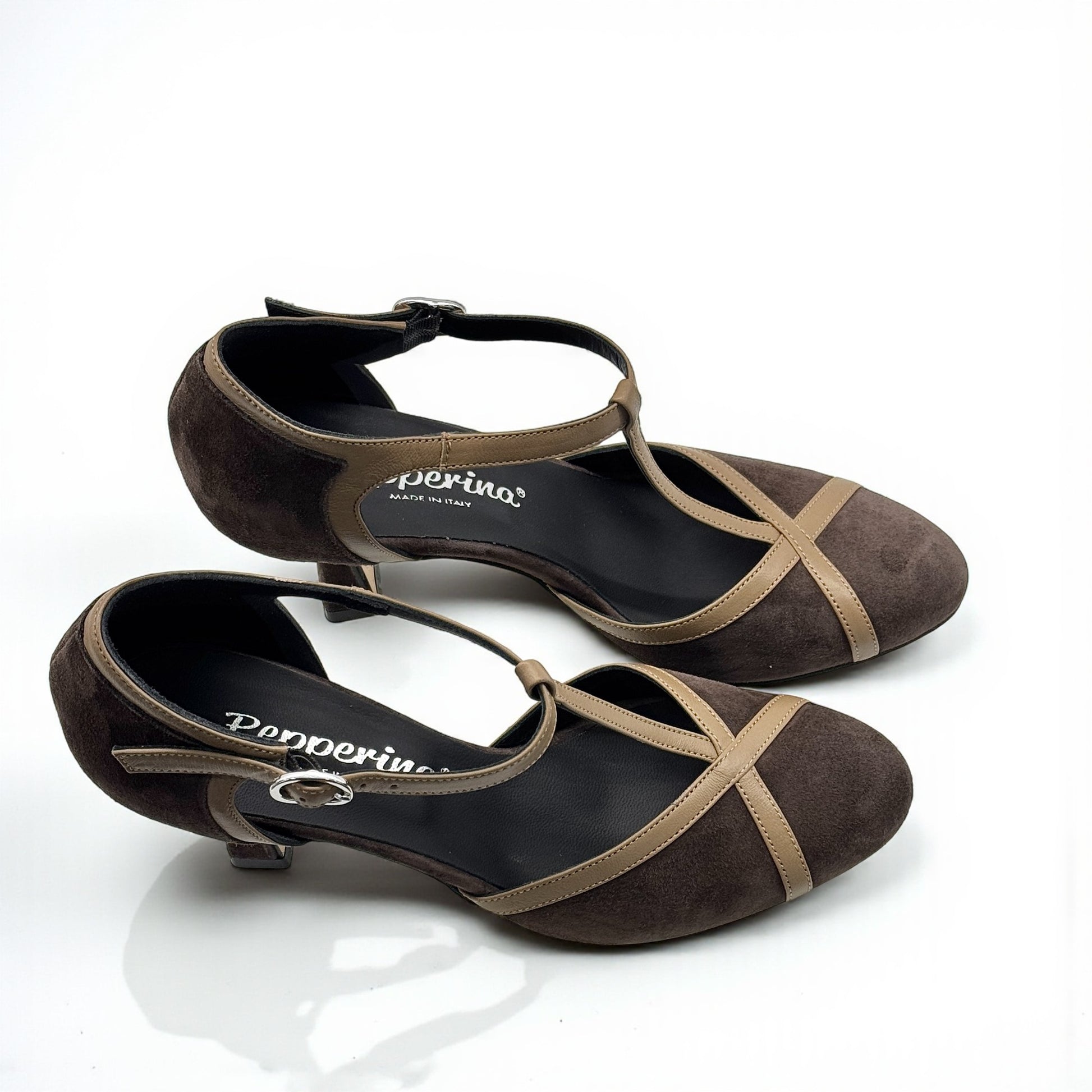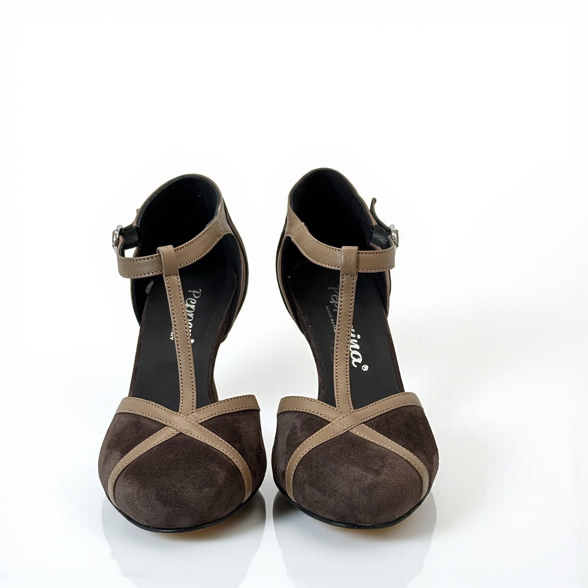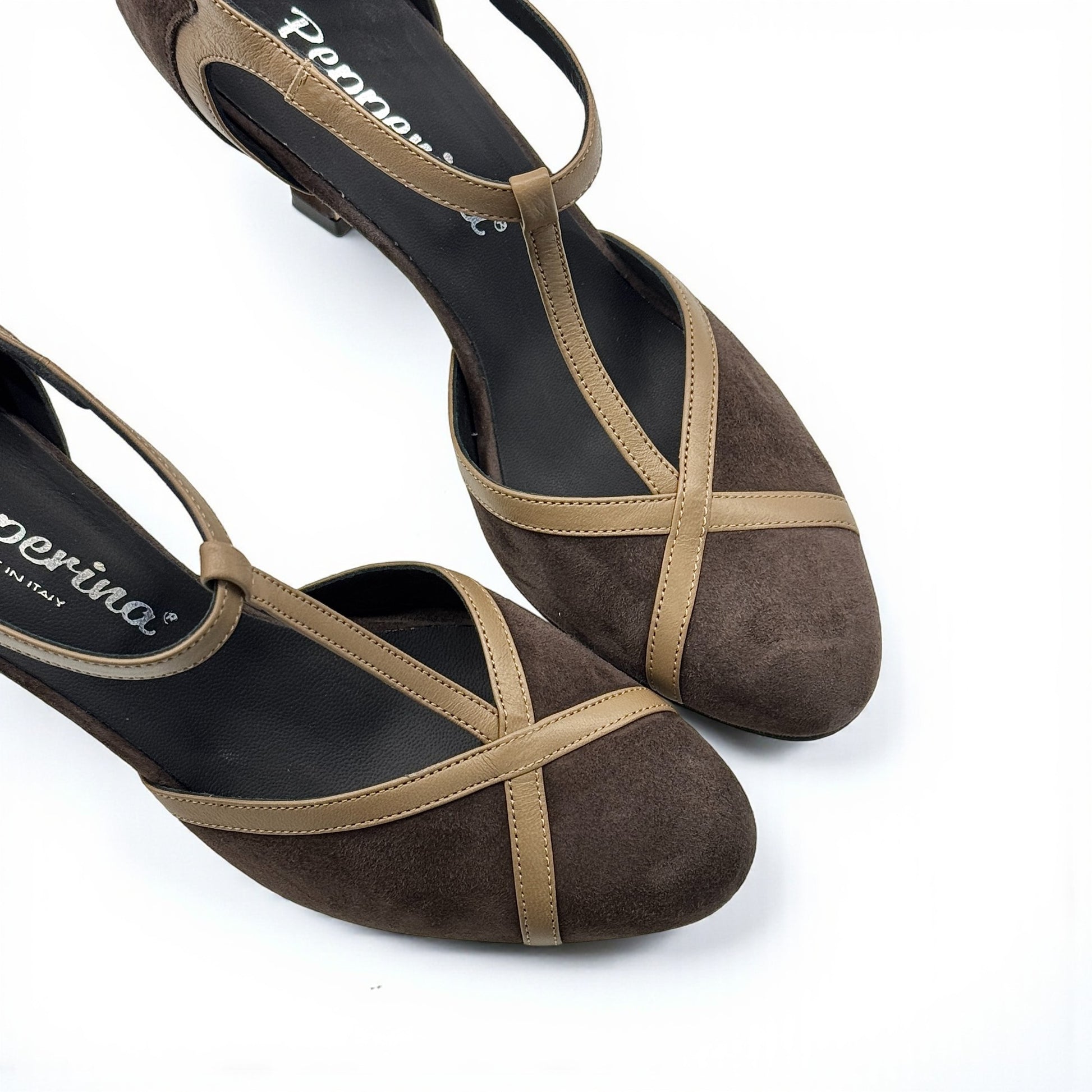 The Marika Charleston is our iconic model: feminine, comfortable, and elegant. Crafted from soft suede and leather with a T-strap and comfortable heel, it's the perfect balance of retro style and everyday comfort.