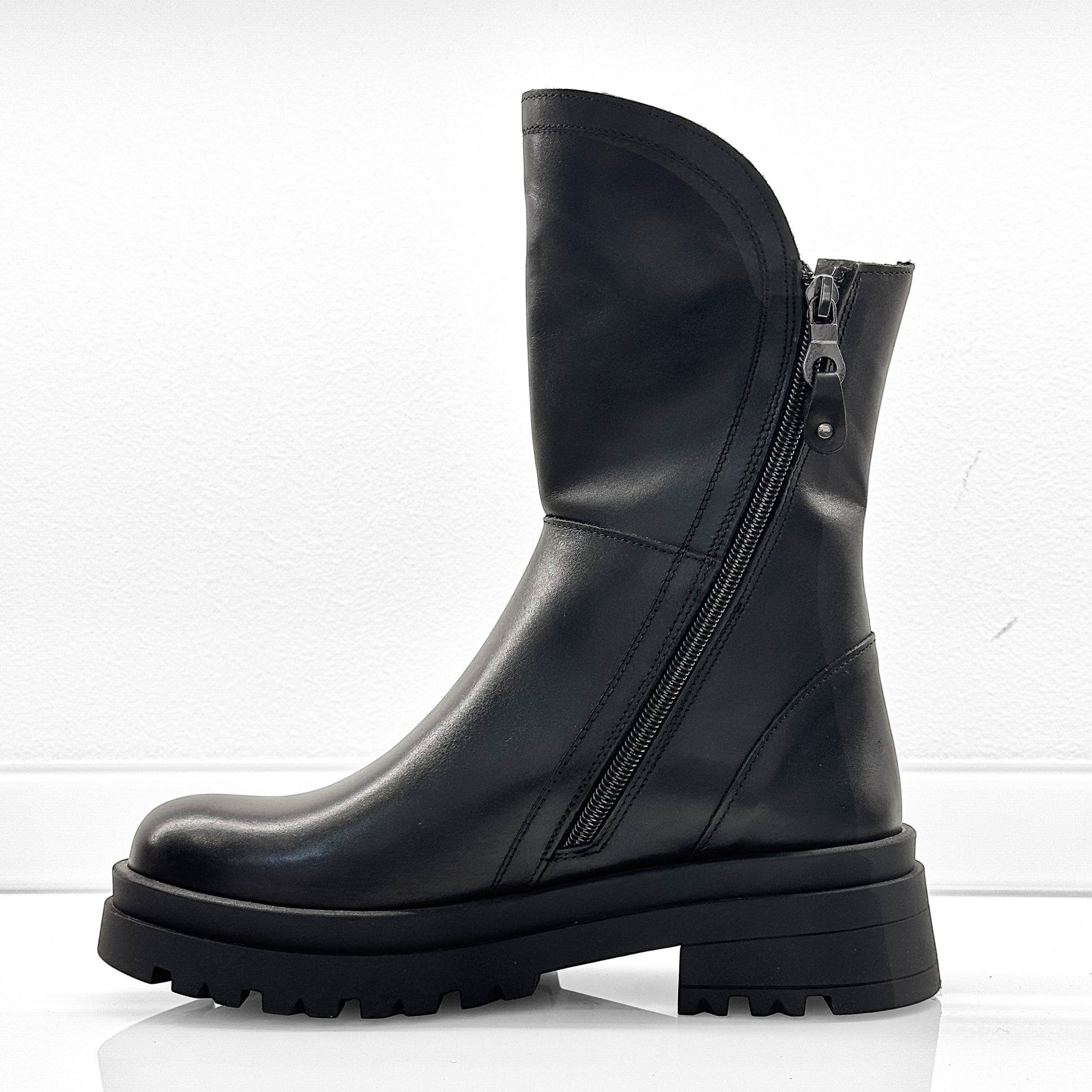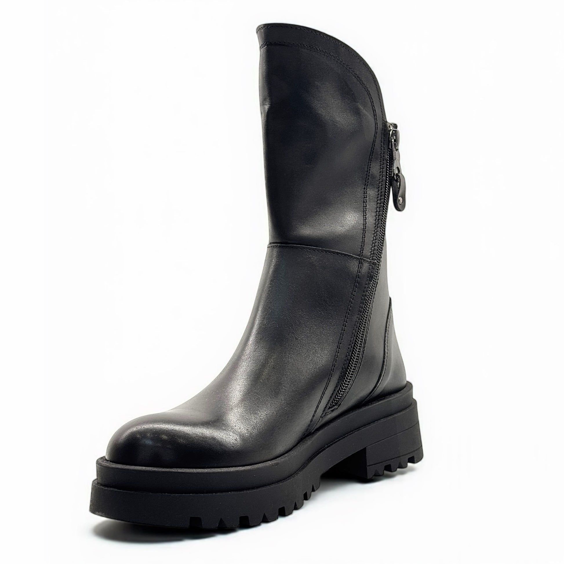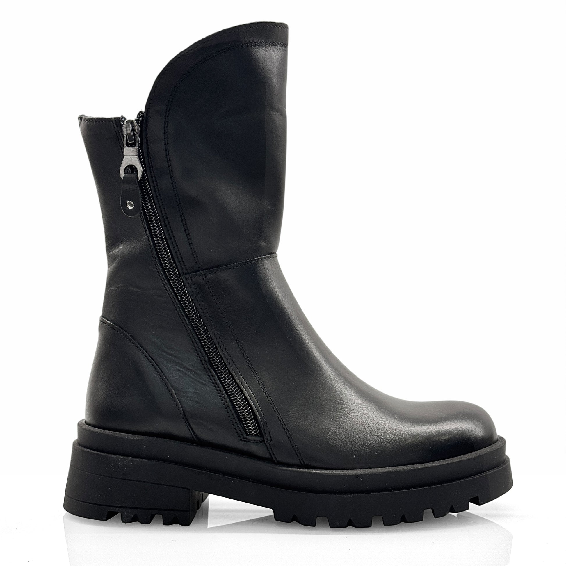 Stivaletto biker Grafite in morbida pelle nera con doppia zip e suola carrarmato.