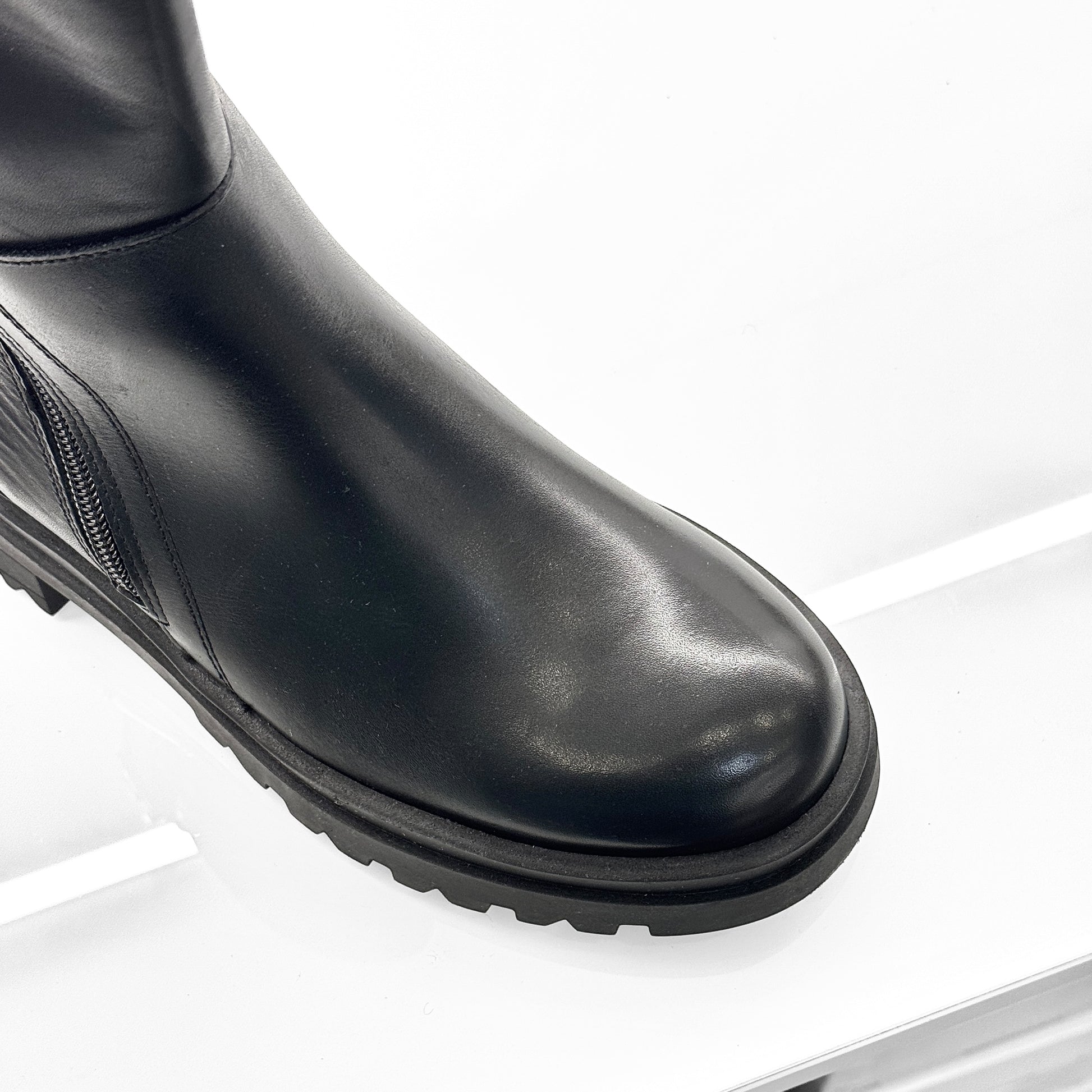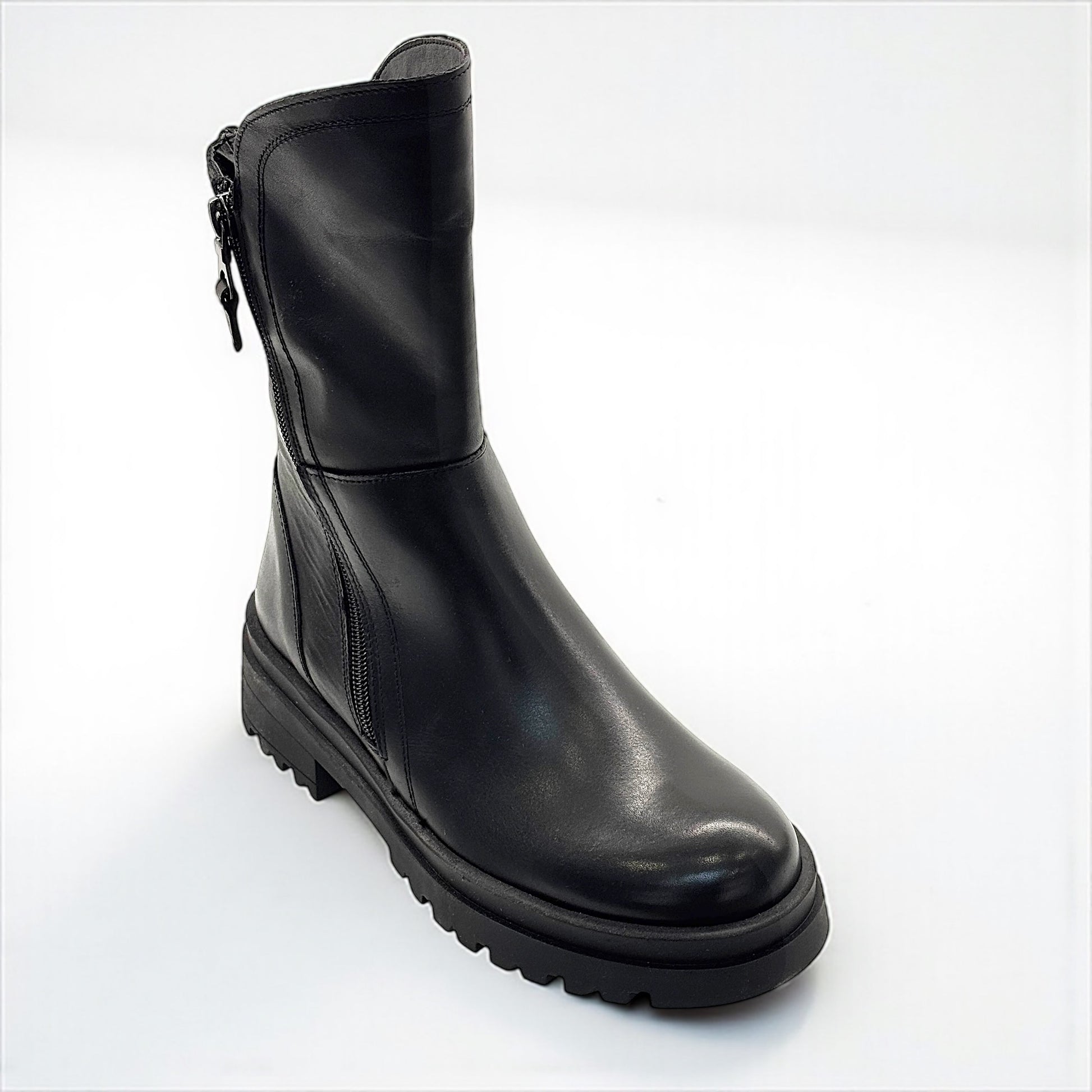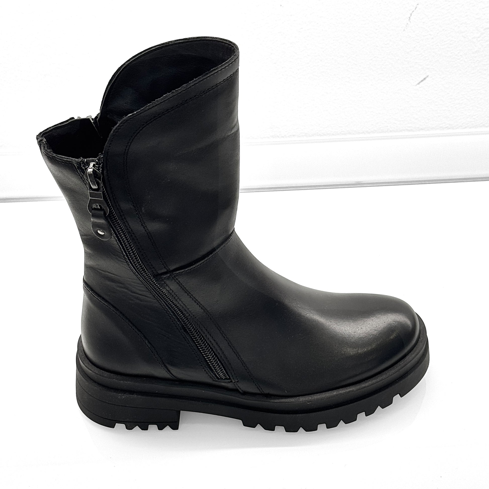 Stivaletto biker Grafite in morbida pelle nera con doppia zip e suola carrarmato.