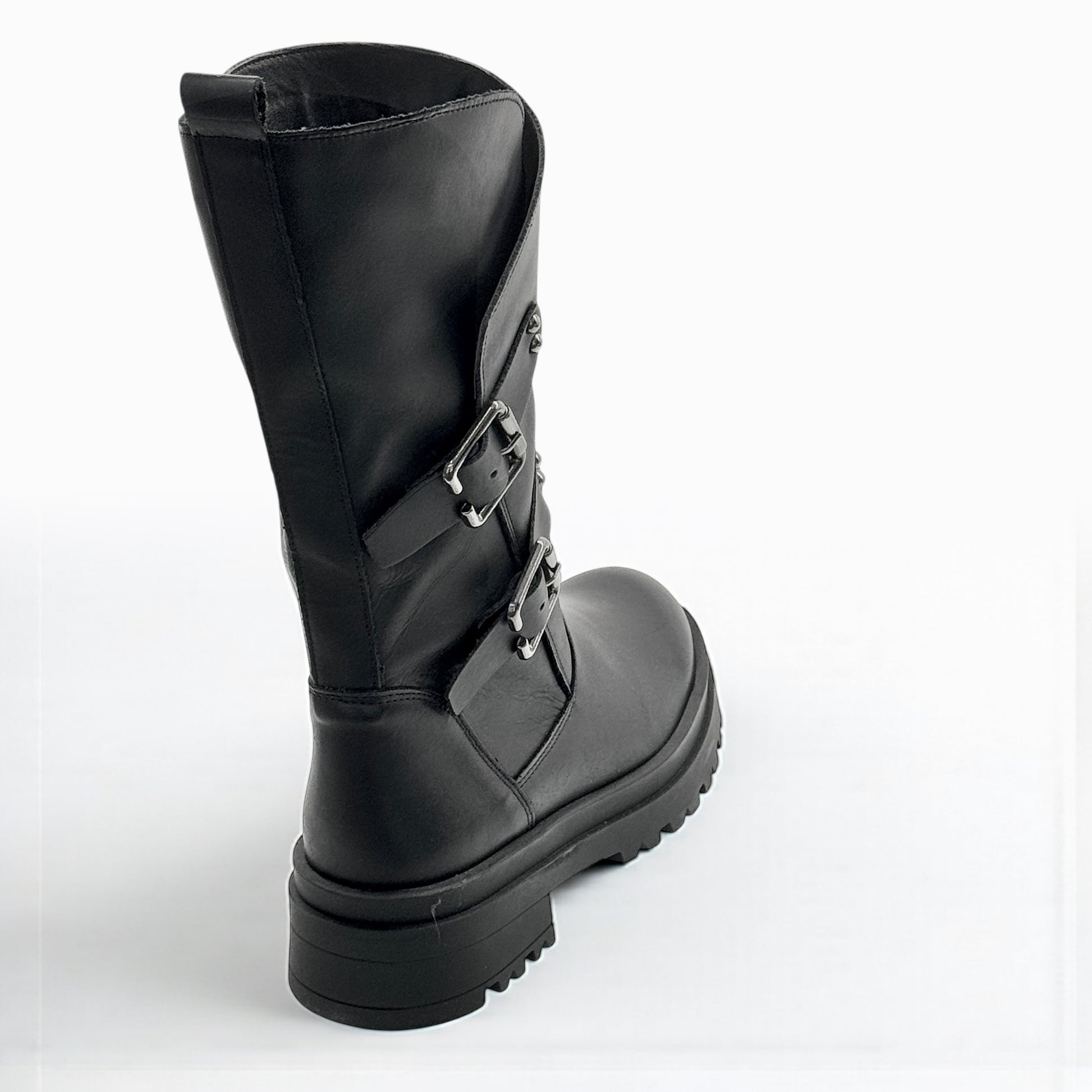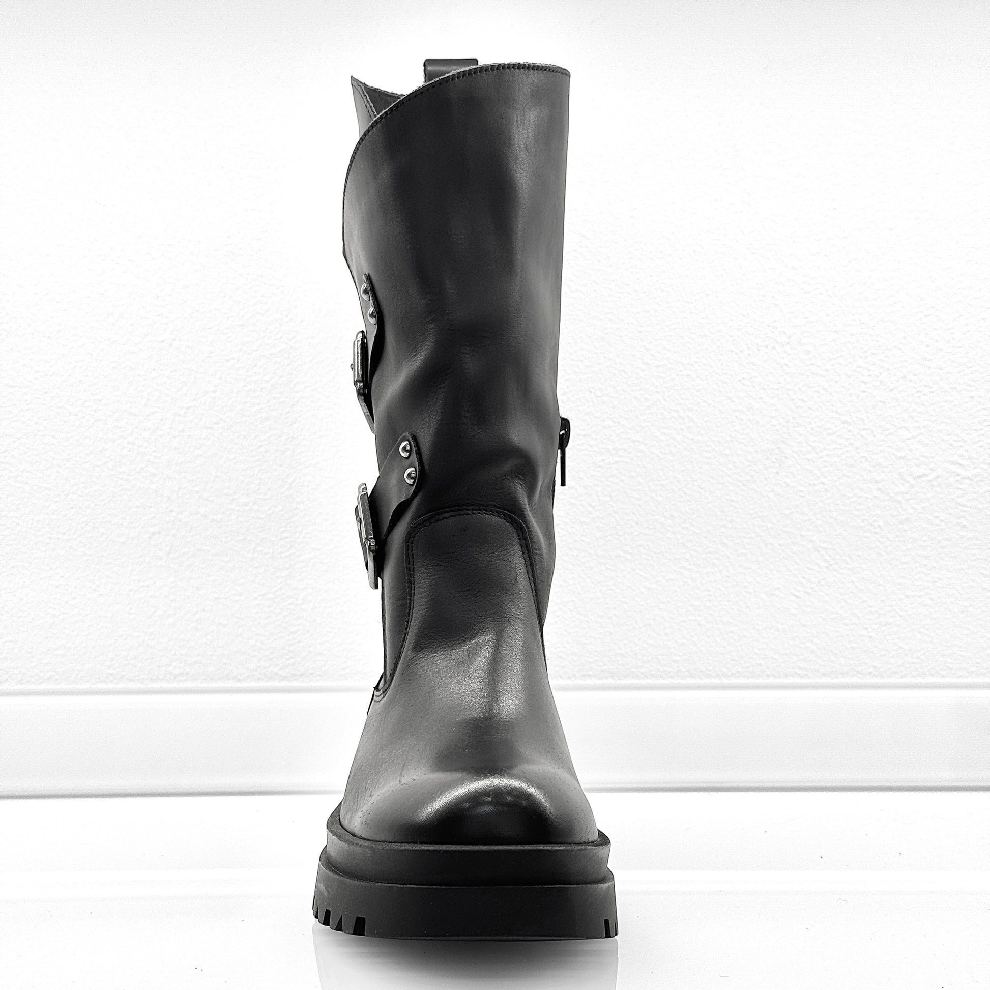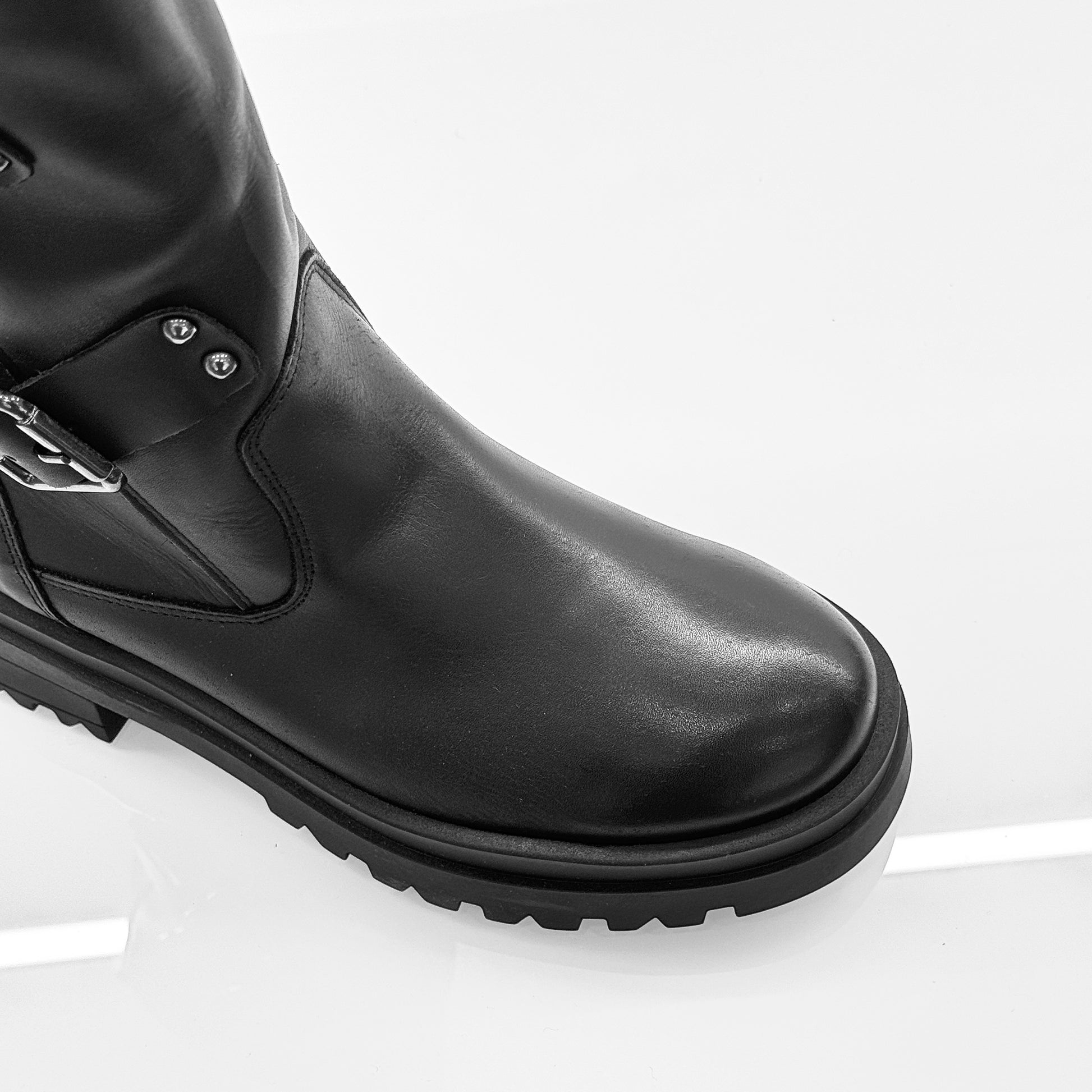 Stivaletto biker Onice in morbida pelle nera con suola carrarmato e linea grintosa, tra i best seller della stagione.