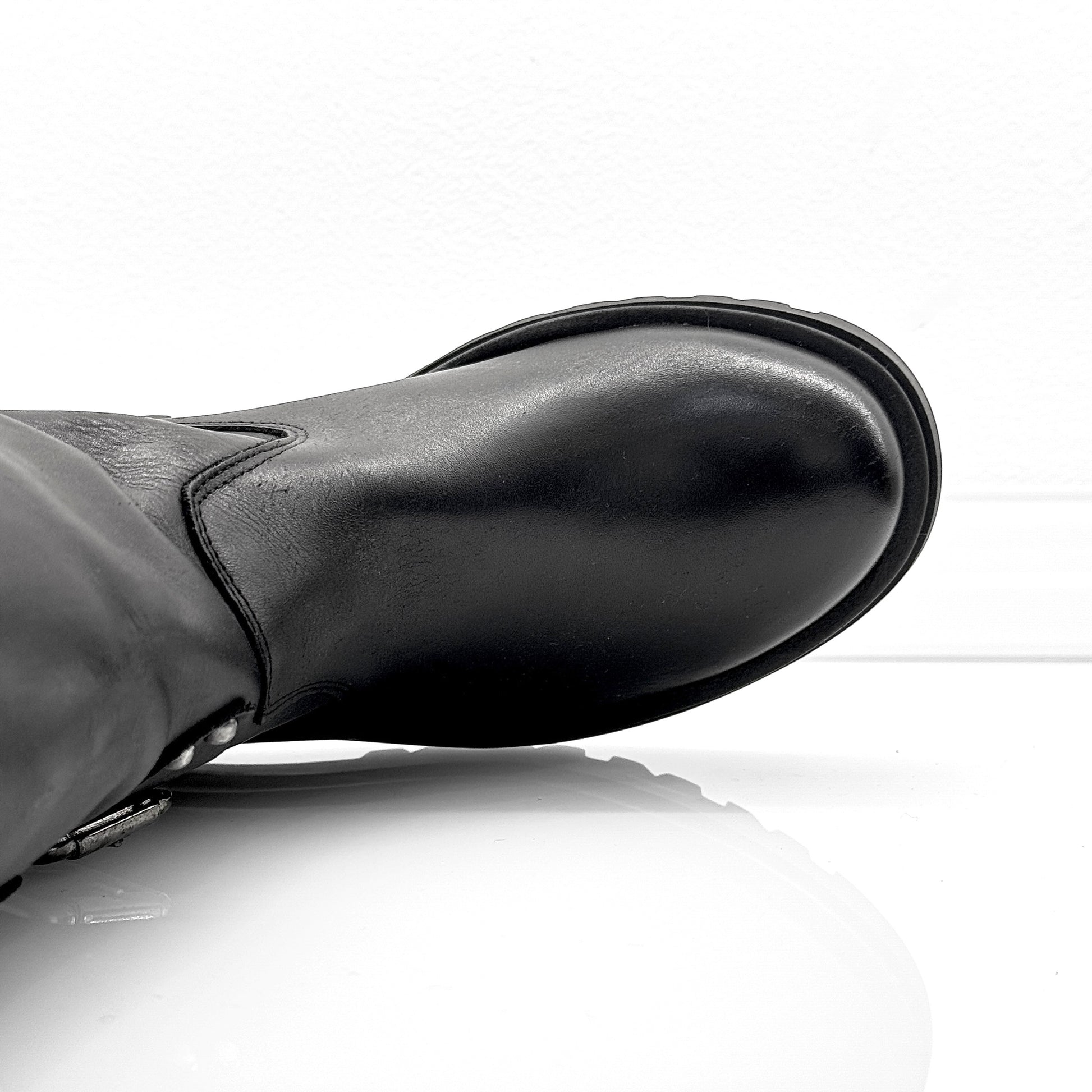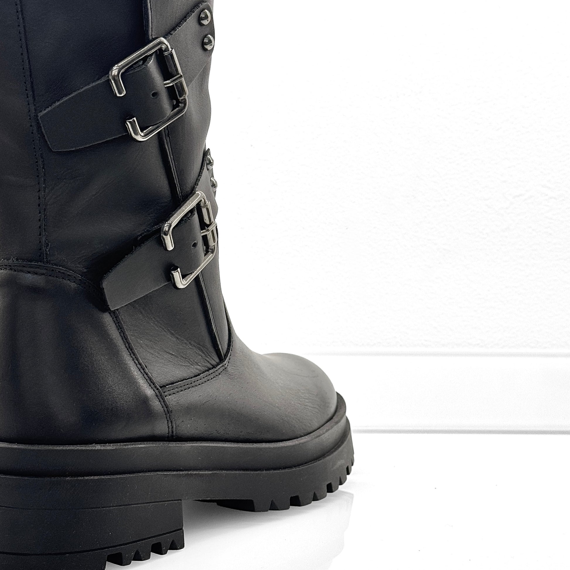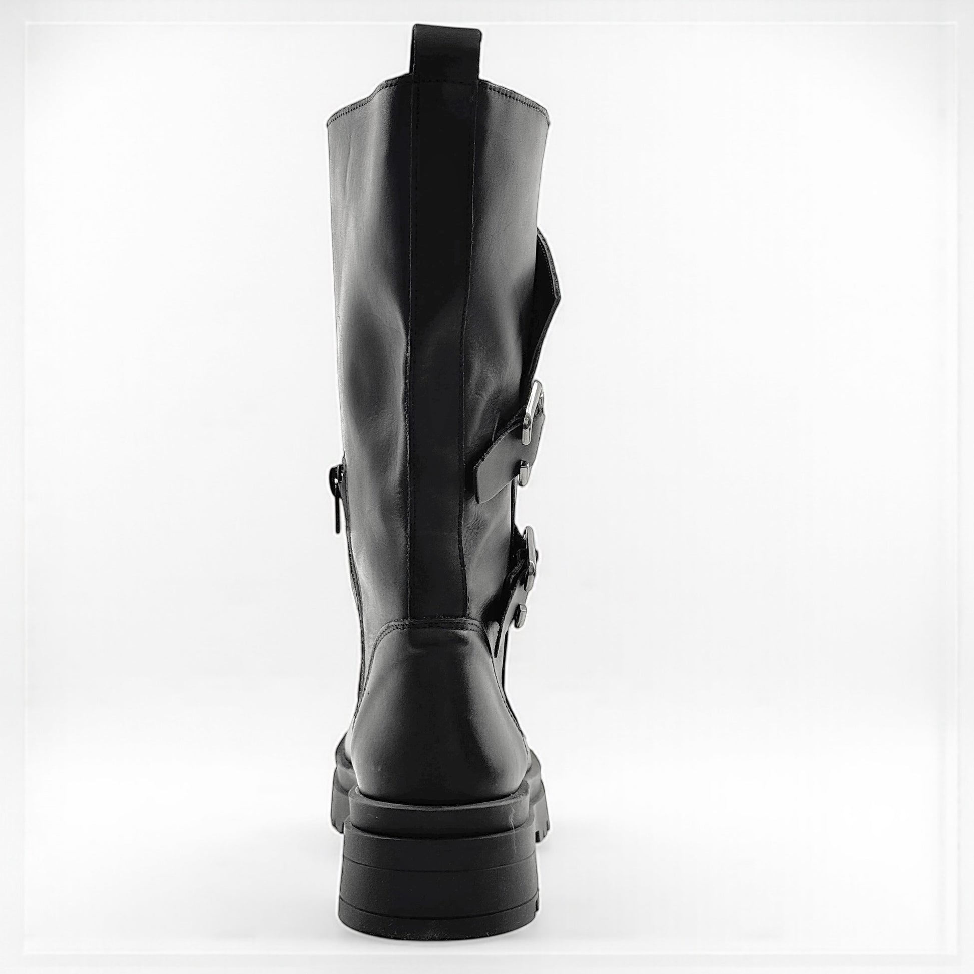 Stivaletto biker Onice in morbida pelle nera con suola carrarmato e linea grintosa, tra i best seller della stagione.