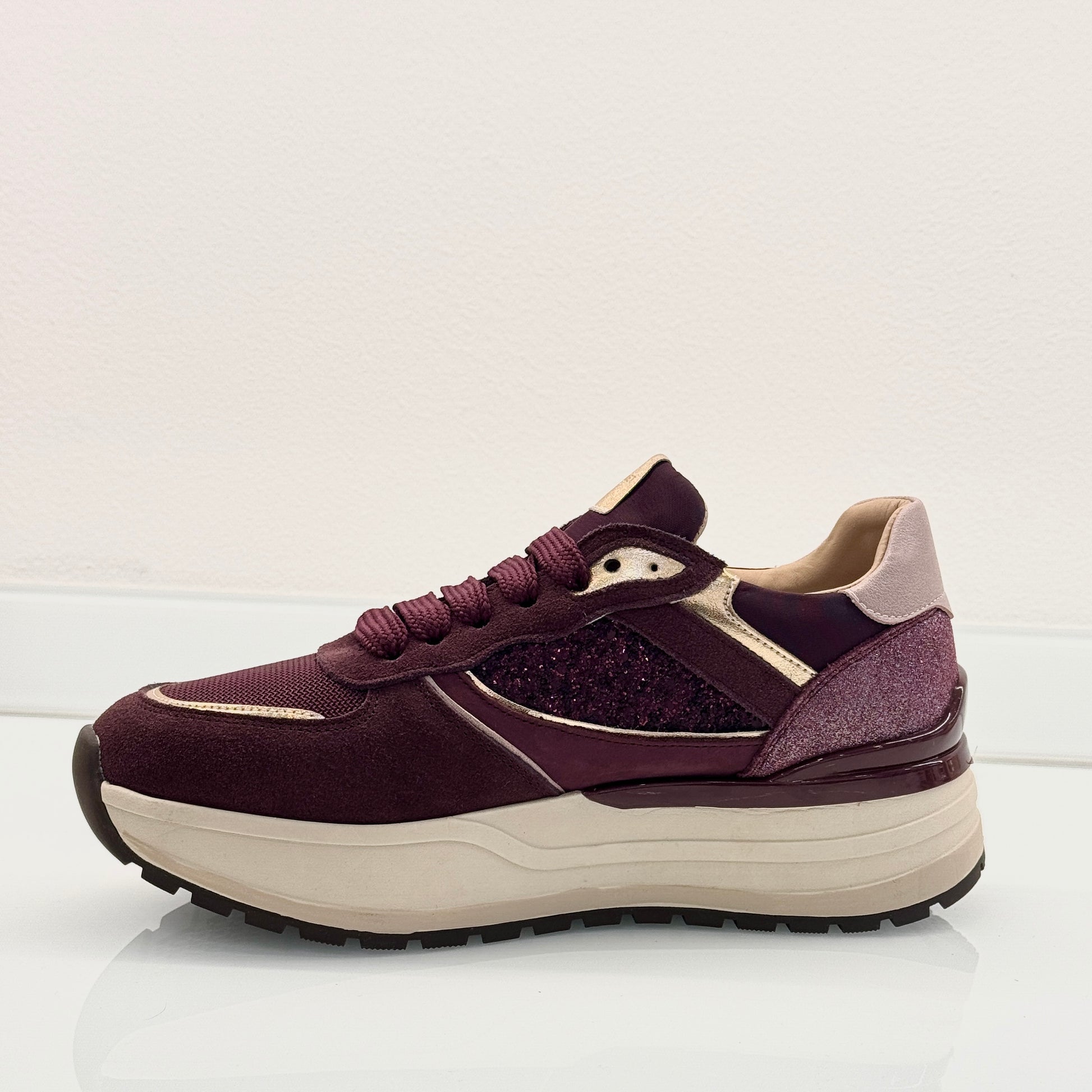 Sneaker Janet & Janet in camoscio bordeaux con dettagli glitter e inserti dorati, elegante e grintosa.