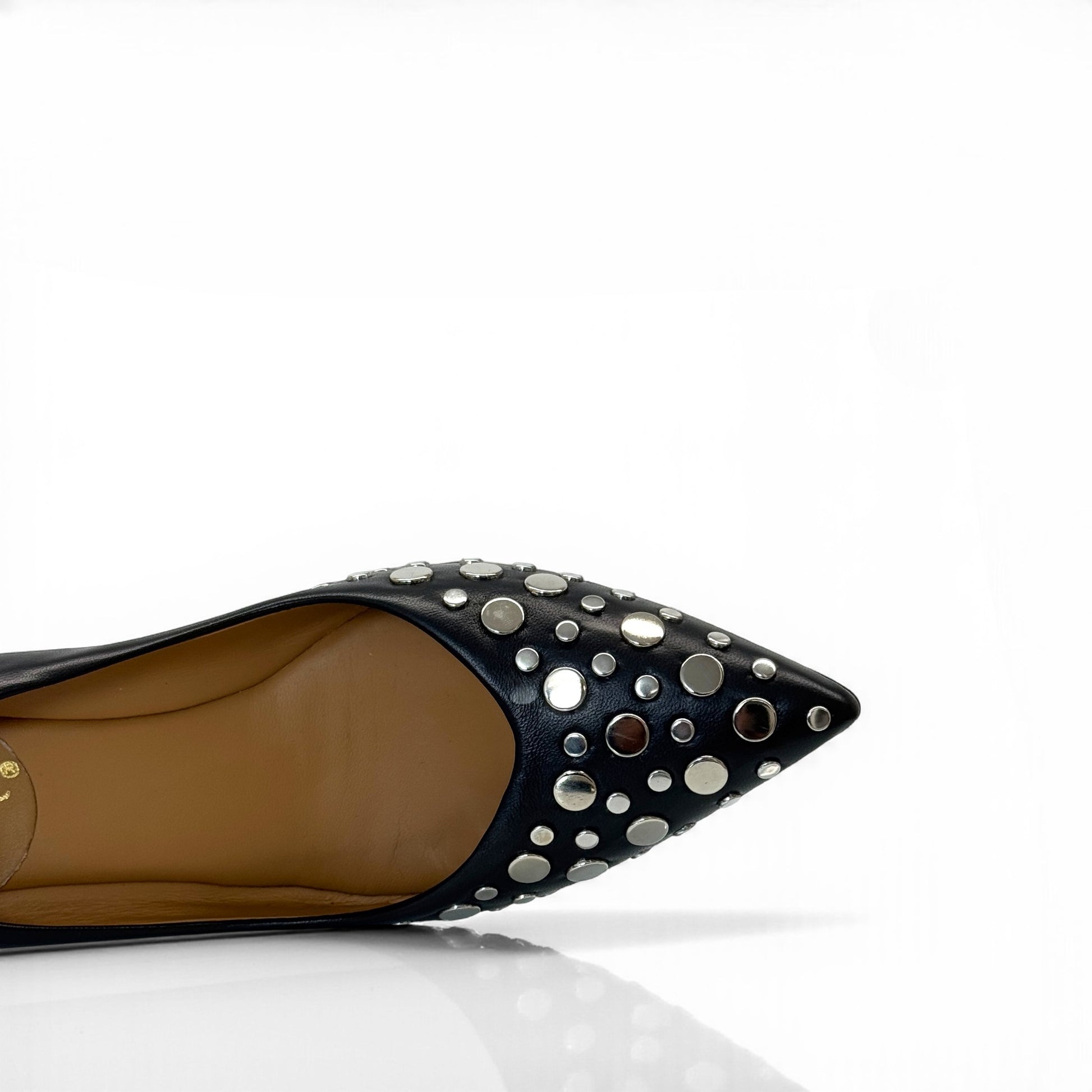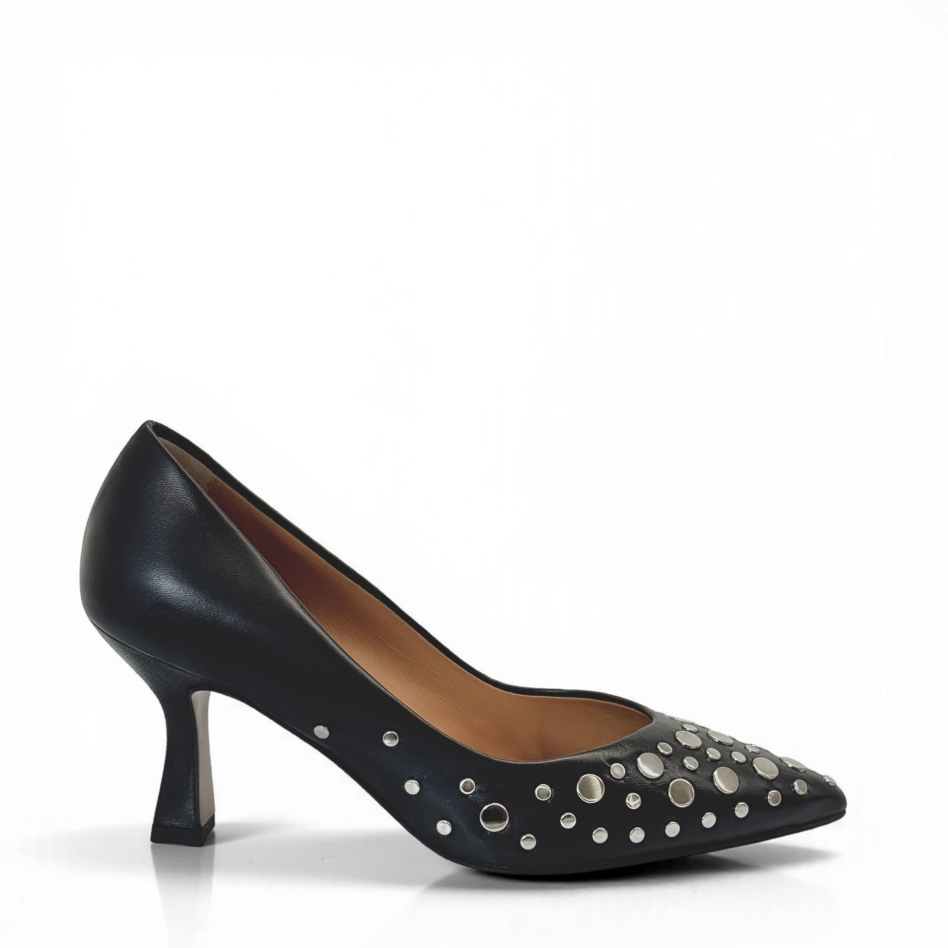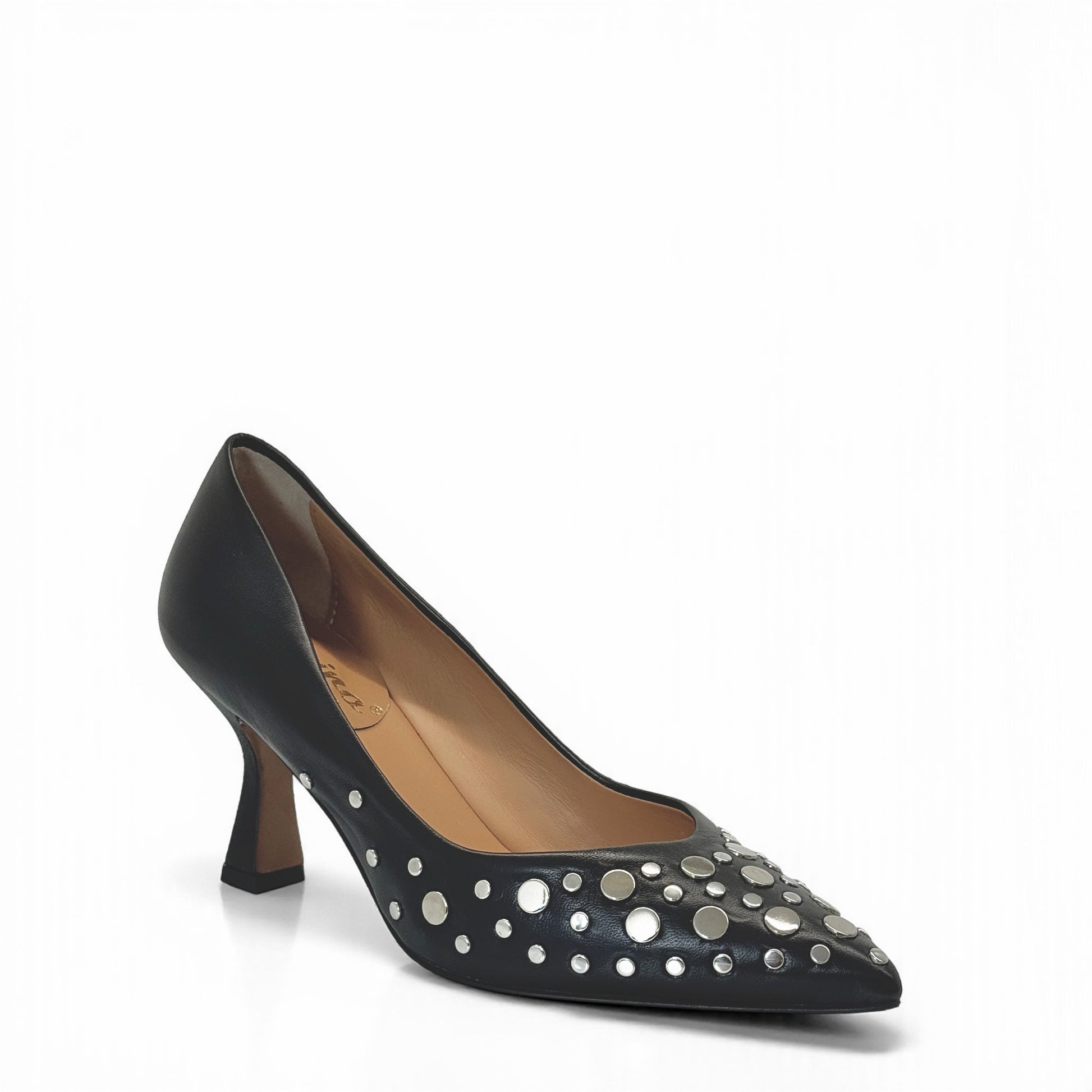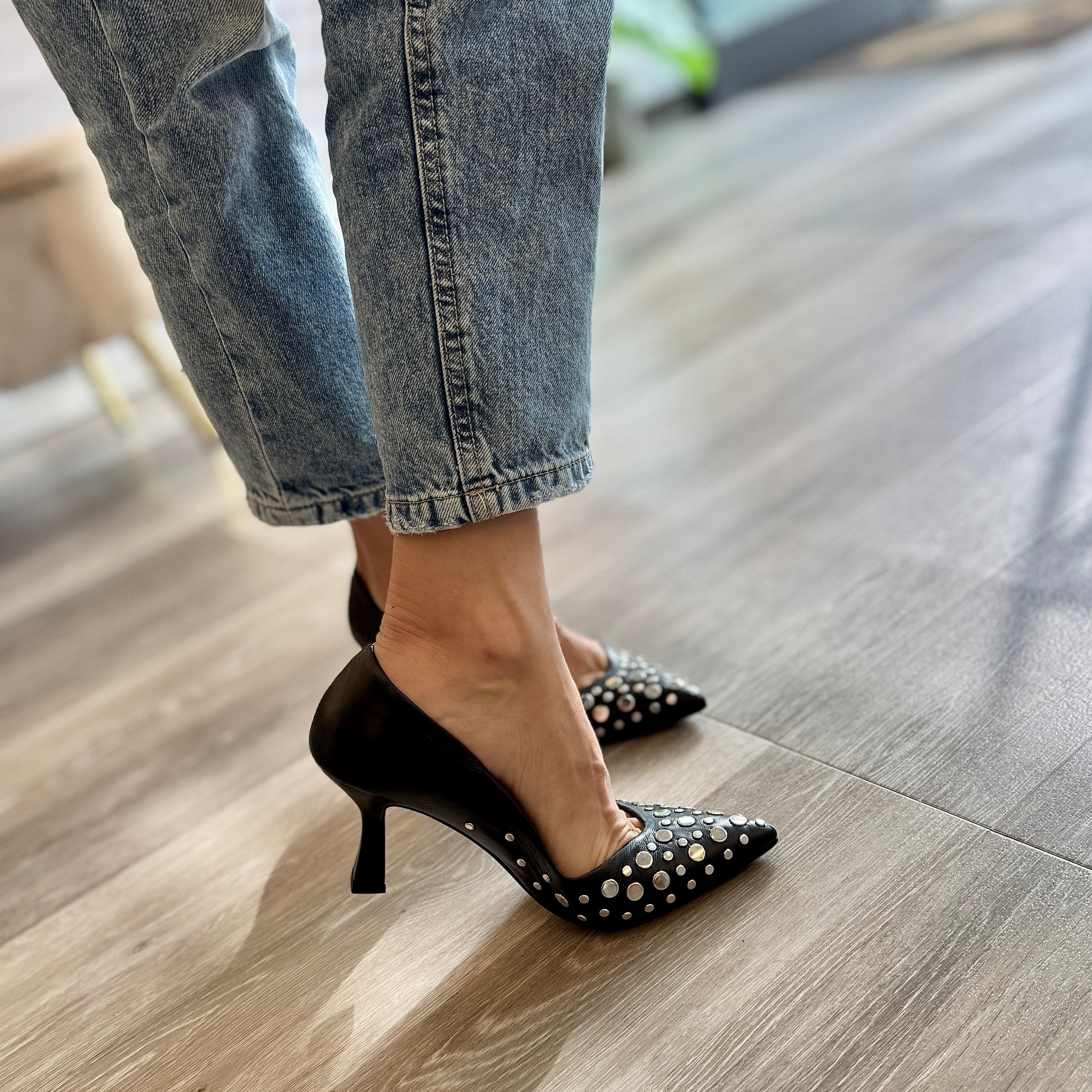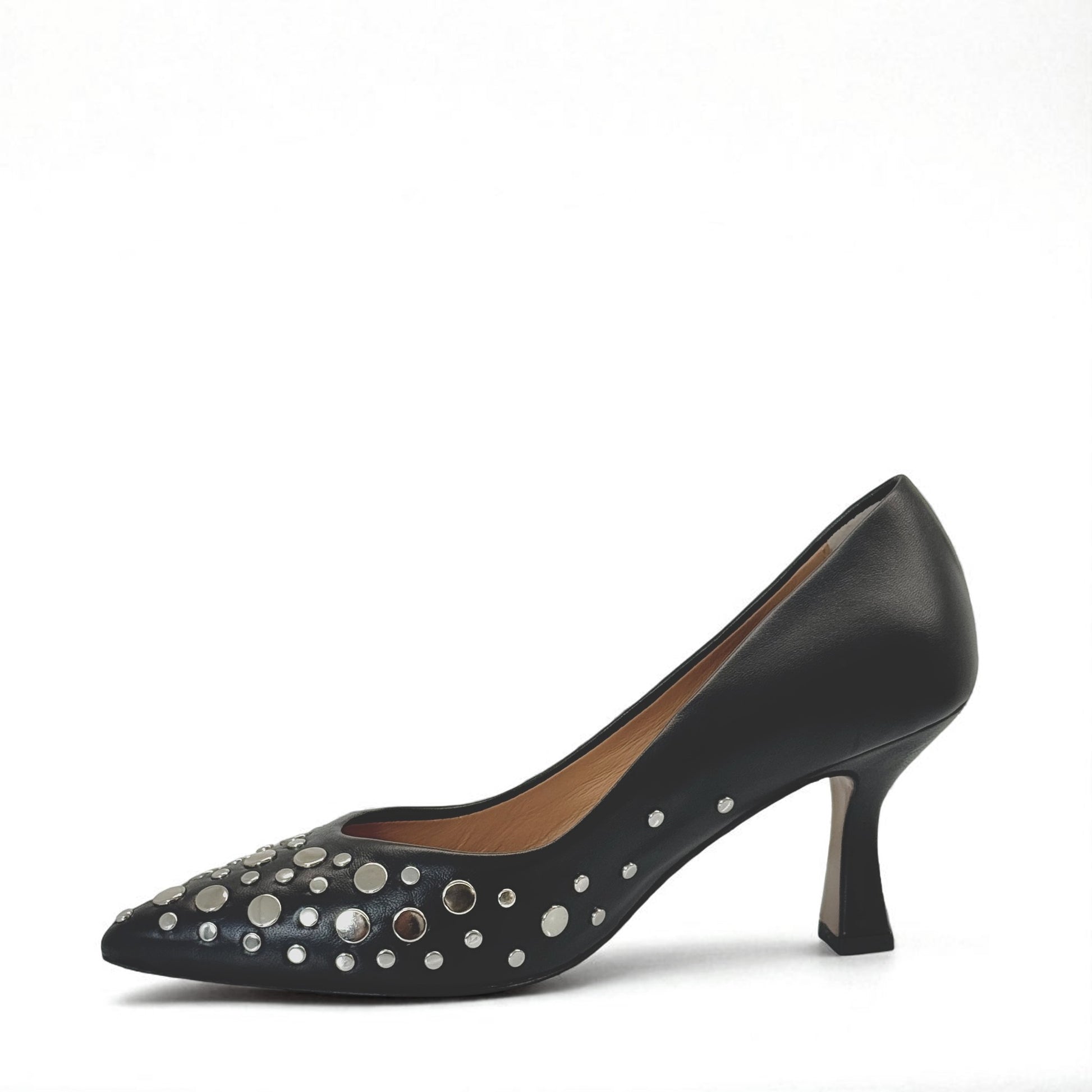 Décolleté Trixie Made of soft black nappa leather, embellished with rock-chic studs. The pointed toe and comfortable 7 cm heel with a padded insole provide an elegant and comfortable fit.