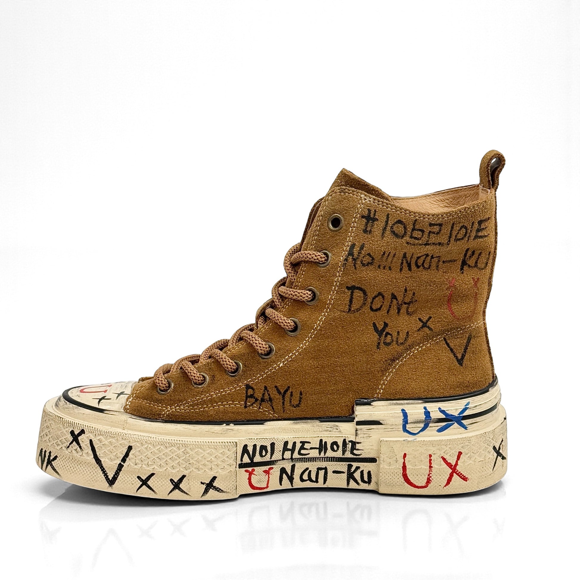 Nanku è una sneakers alta in camoscio dal carattere rock e artistico, arricchita da dettagli unici realizzati a mano. Lo smiley in cristalli, le applicazioni gioiello e le grafiche disegnate rendono ogni paio una creazione originale e di forte personalità.