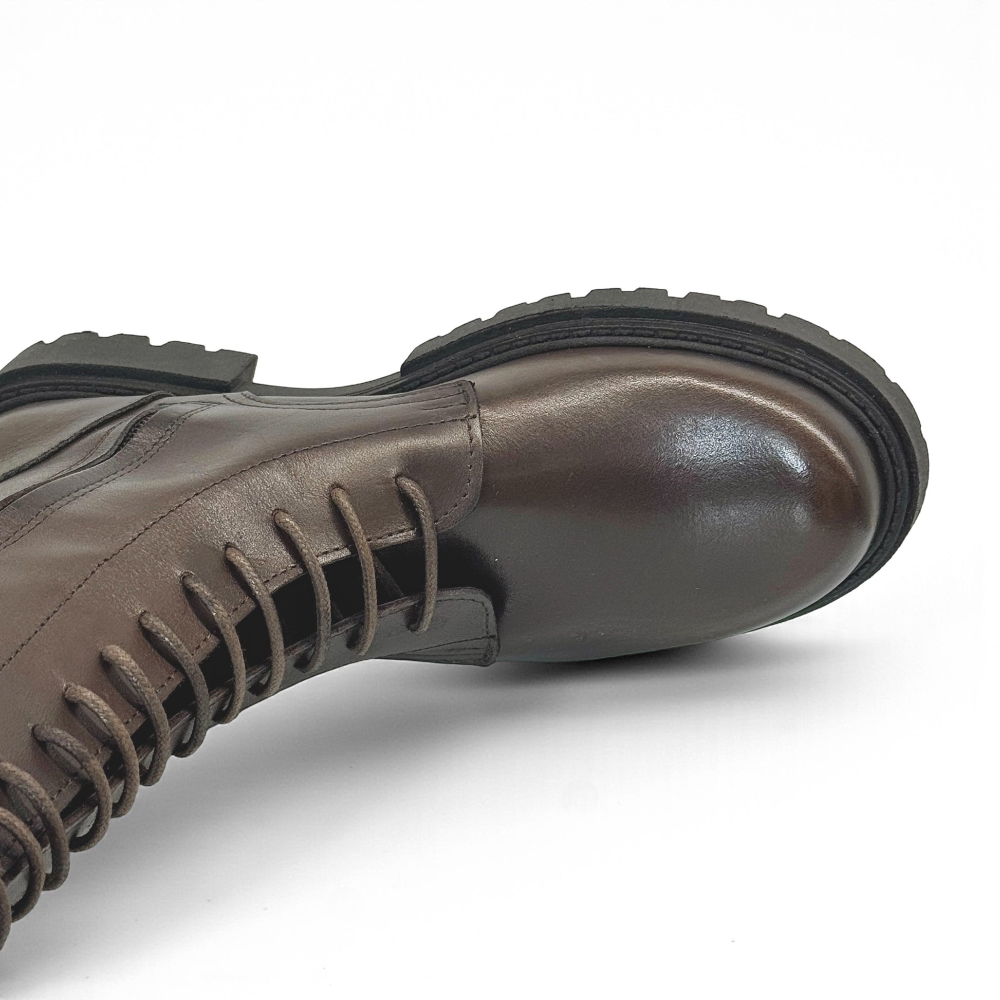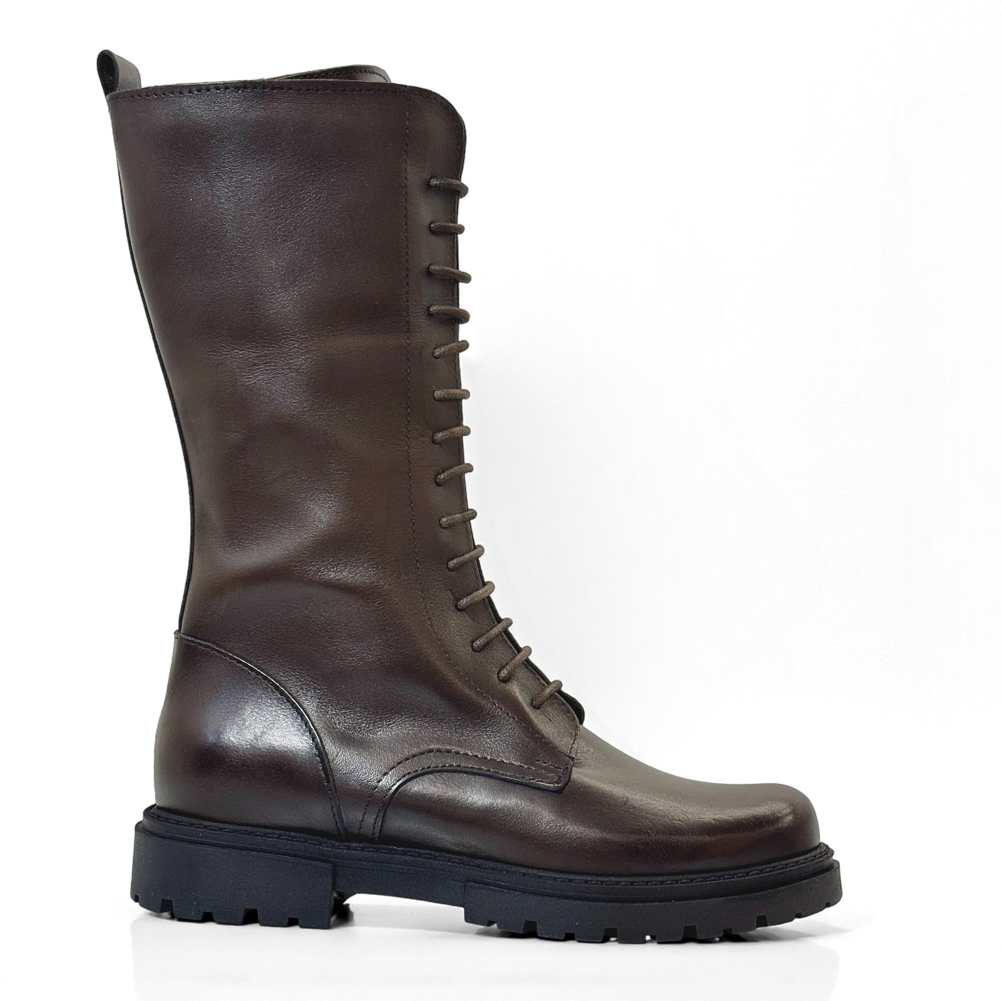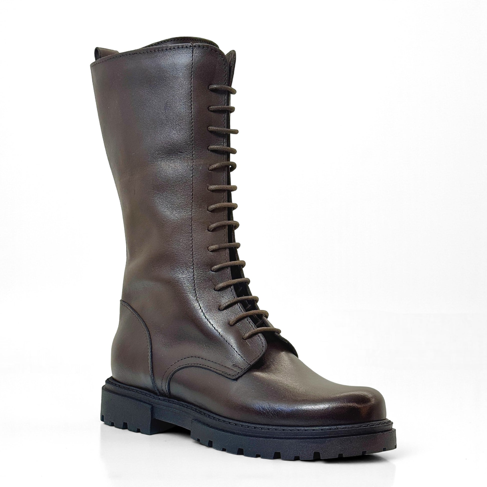 Anfibio in pelle artigianale con suola carrarmato. Realizzato in morbida pelle marrone, con zip laterale, gambale 3/4 e suola alta 4 cm per uno stile deciso e pratico.