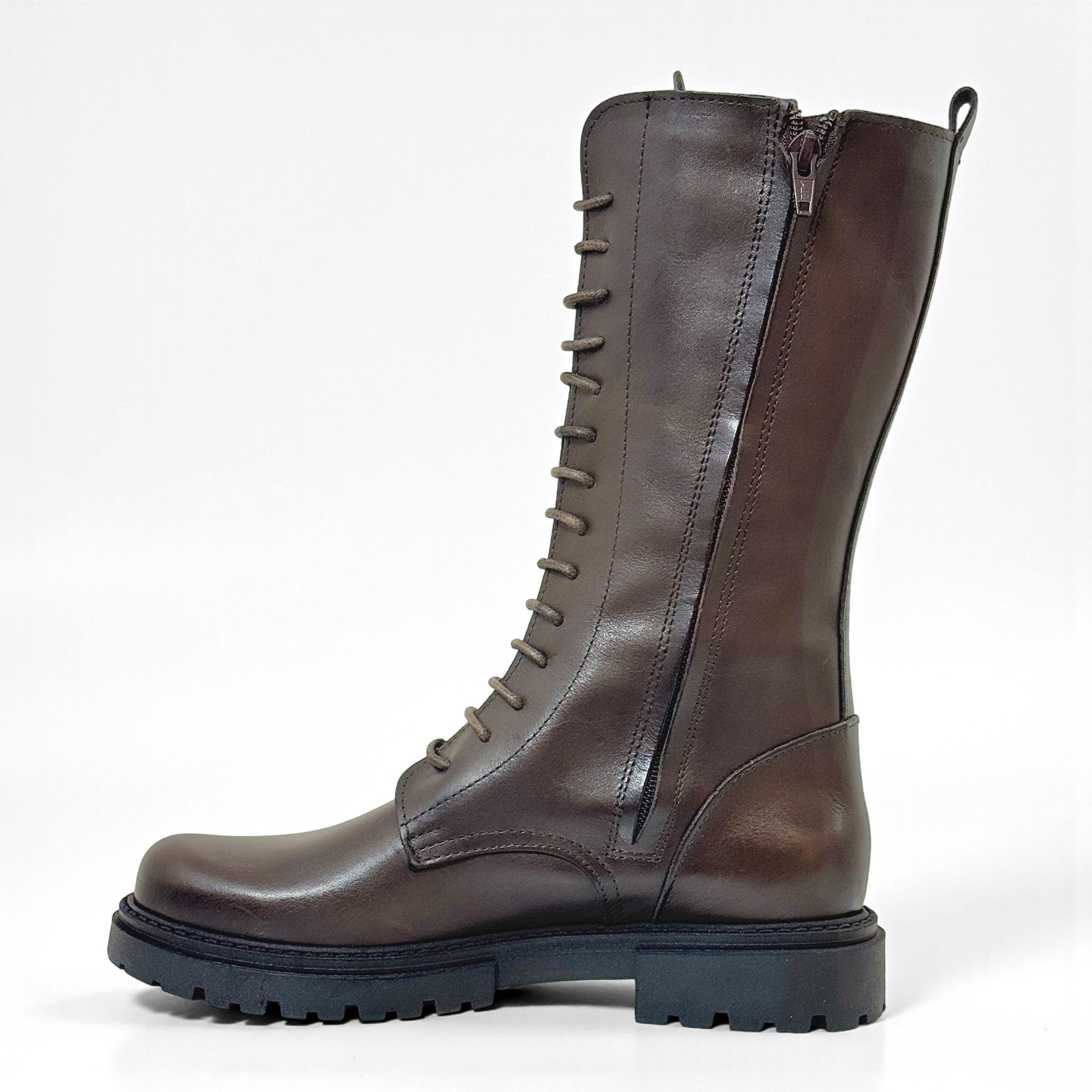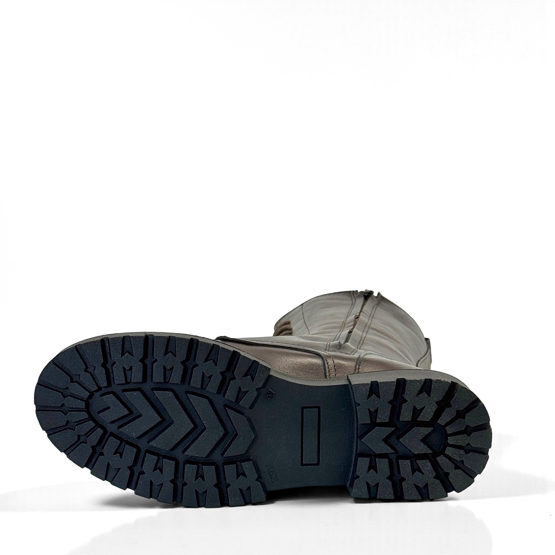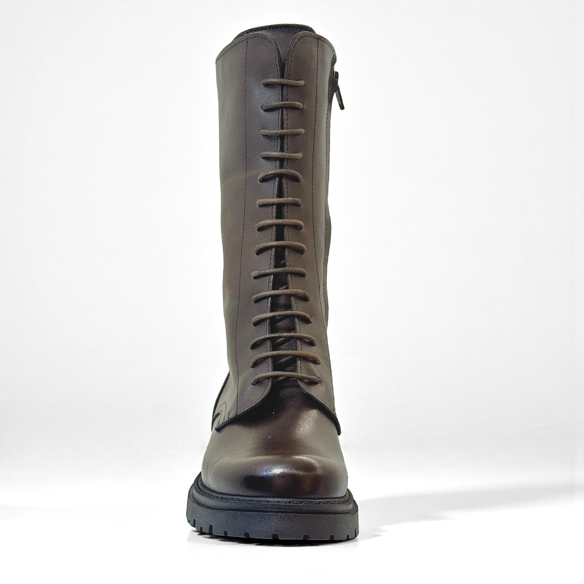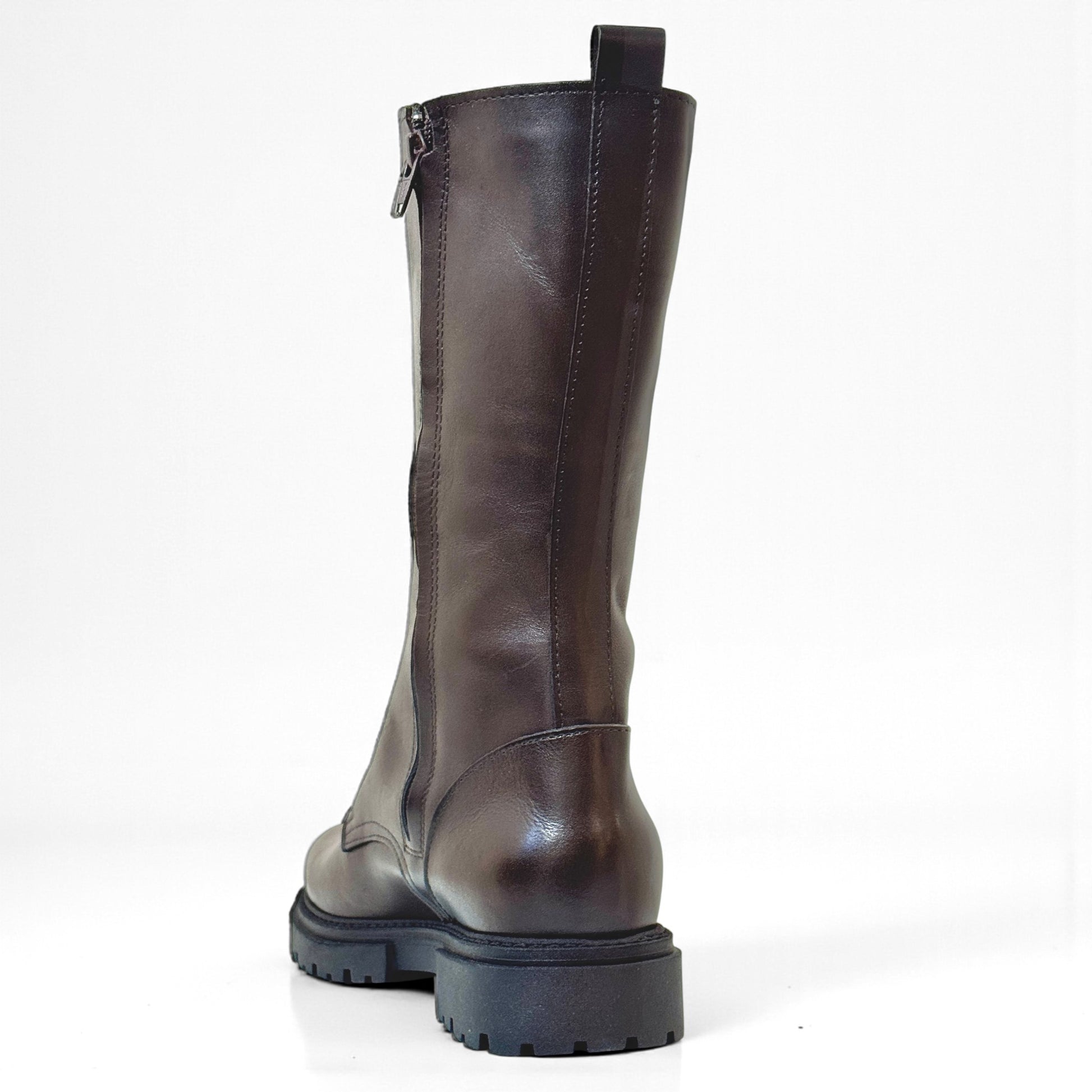 Anfibio in pelle artigianale con suola carrarmato. Realizzato in morbida pelle marrone, con zip laterale, gambale 3/4 e suola alta 4 cm per uno stile deciso e pratico.