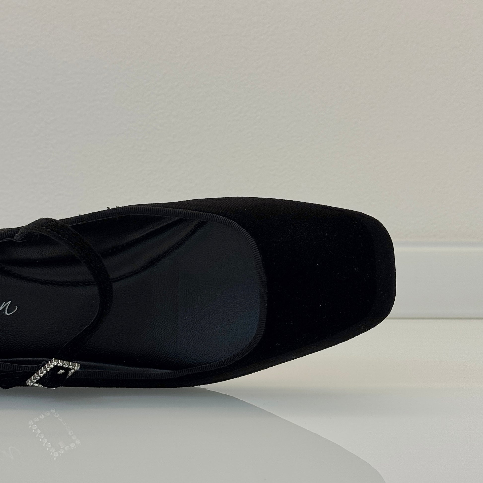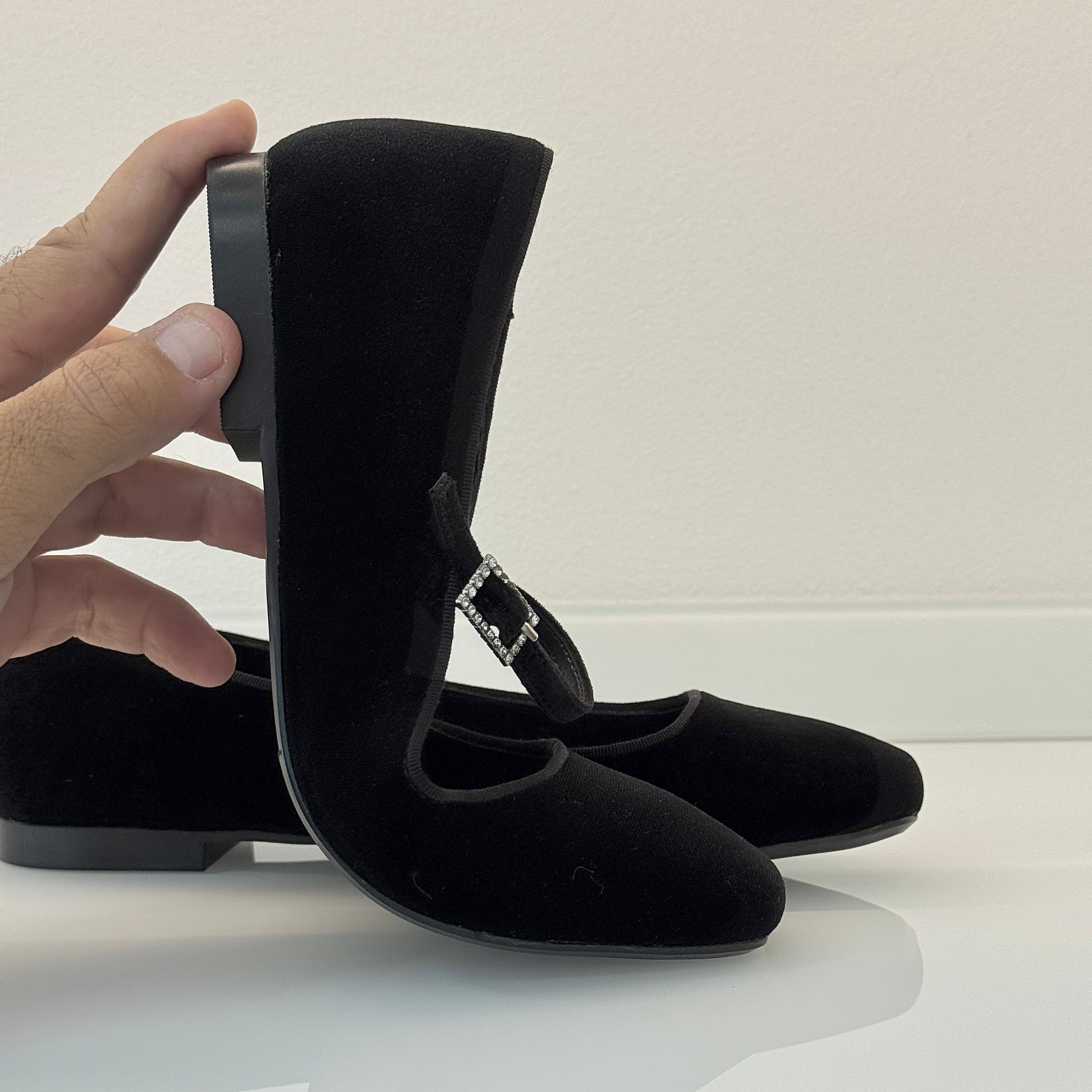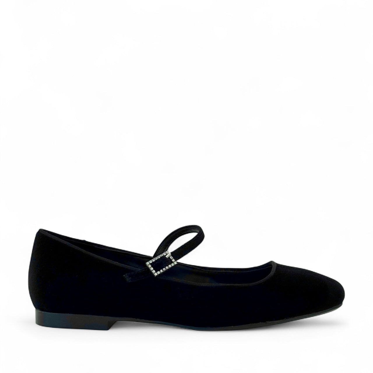 Ballerina Mary Jane in velluto nero con cinturino, elegante e sofisticata.