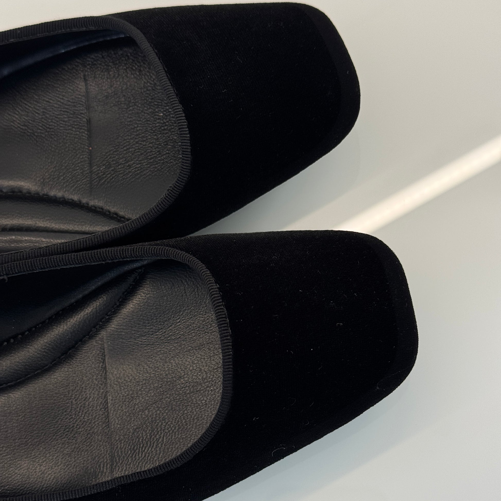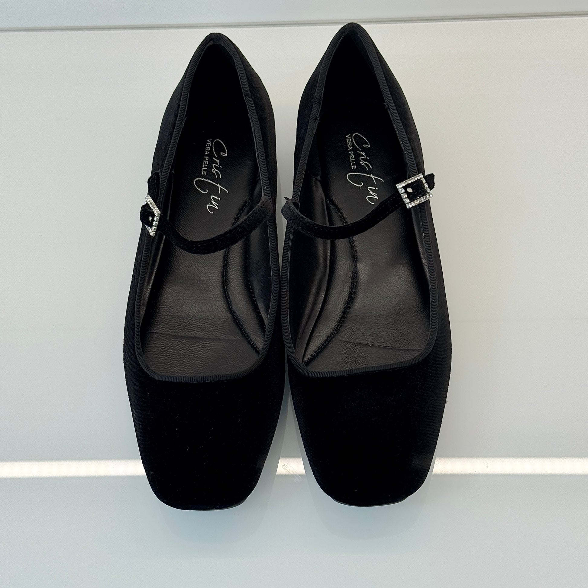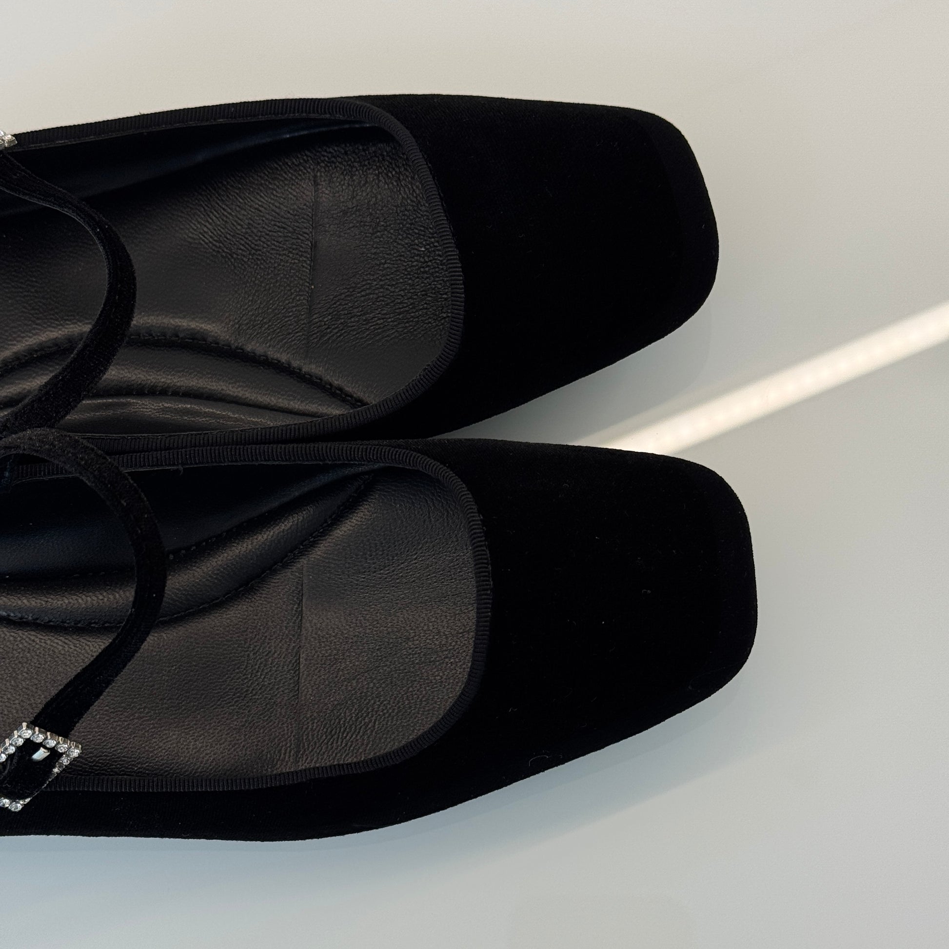 Ballerina Mary Jane in velluto nero con cinturino, elegante e sofisticata.