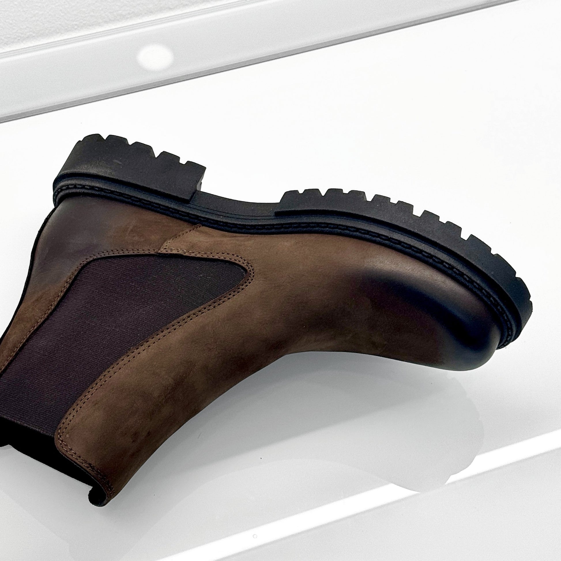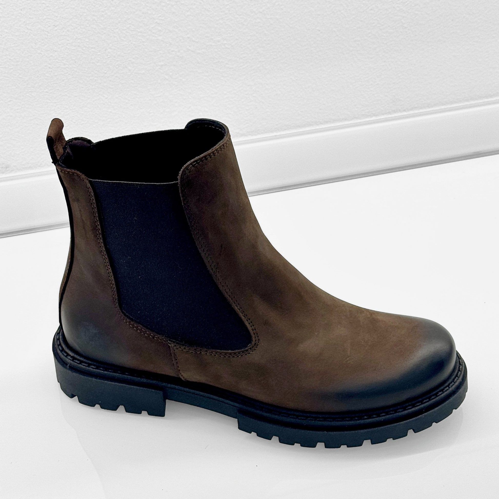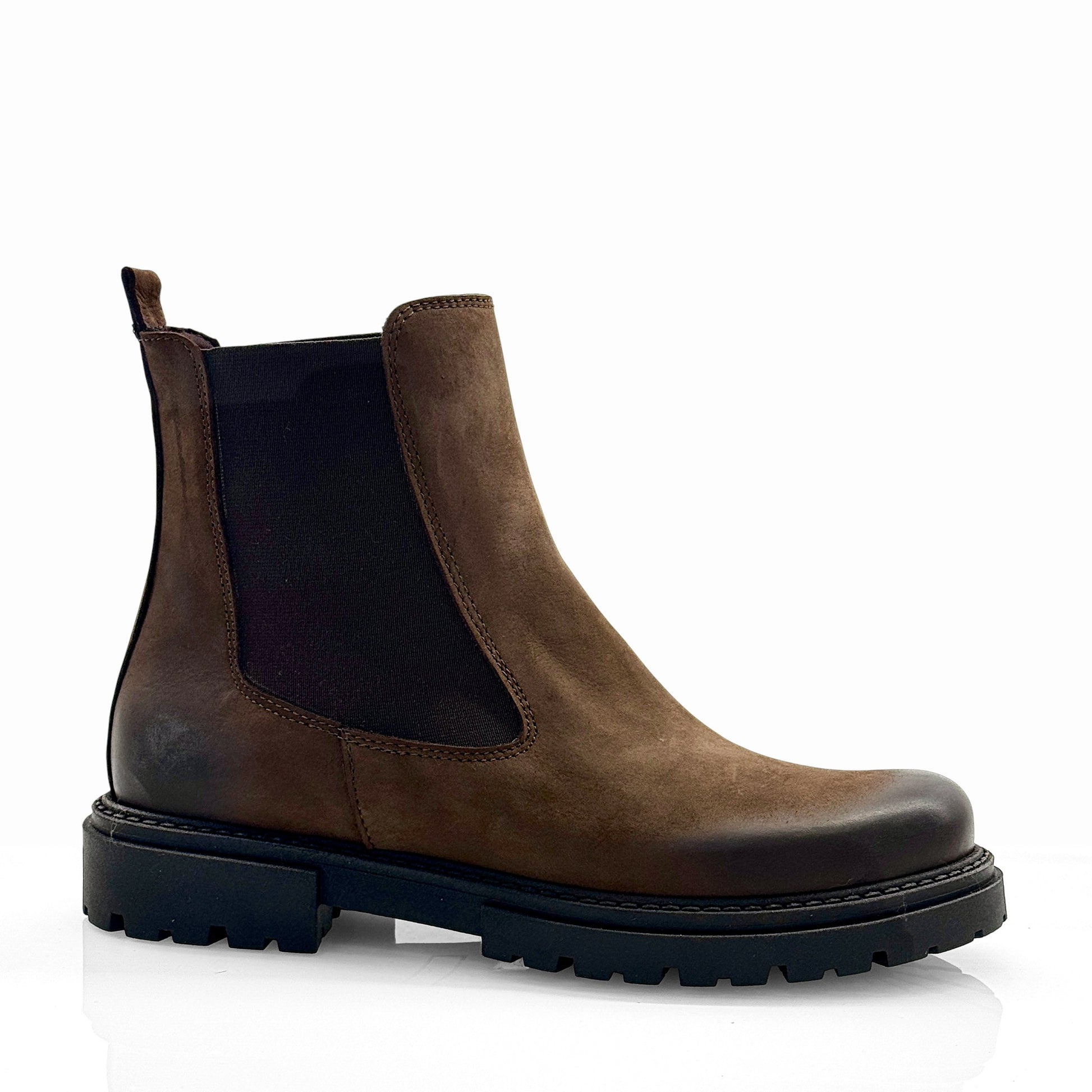 Scarponcino Beatles Nevada in pelle nabuk ingrassato color moro, ideale per l’inverno e resistente alle intemperie. Elastici laterali, suola carrarmato in vera gomma per stabilità e grip. Altezza 3,5 cm.