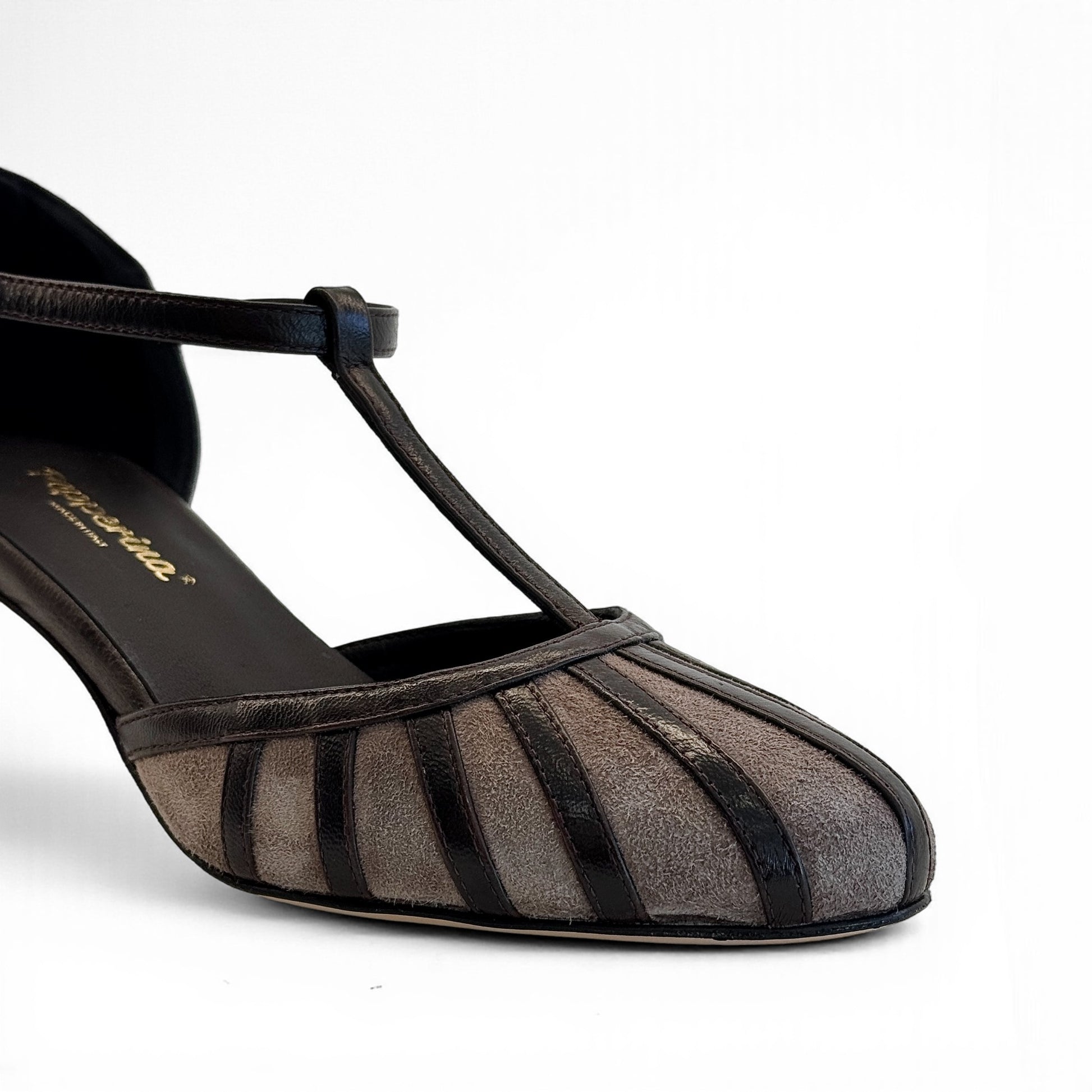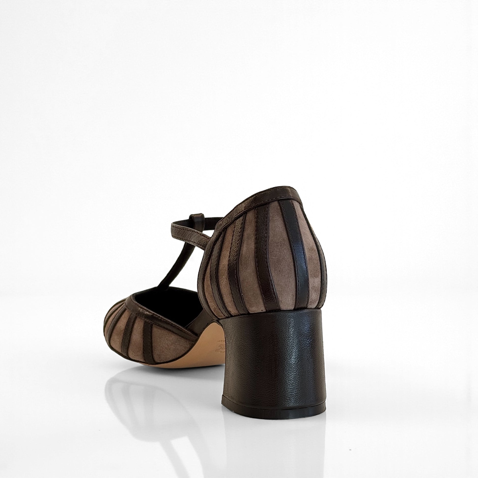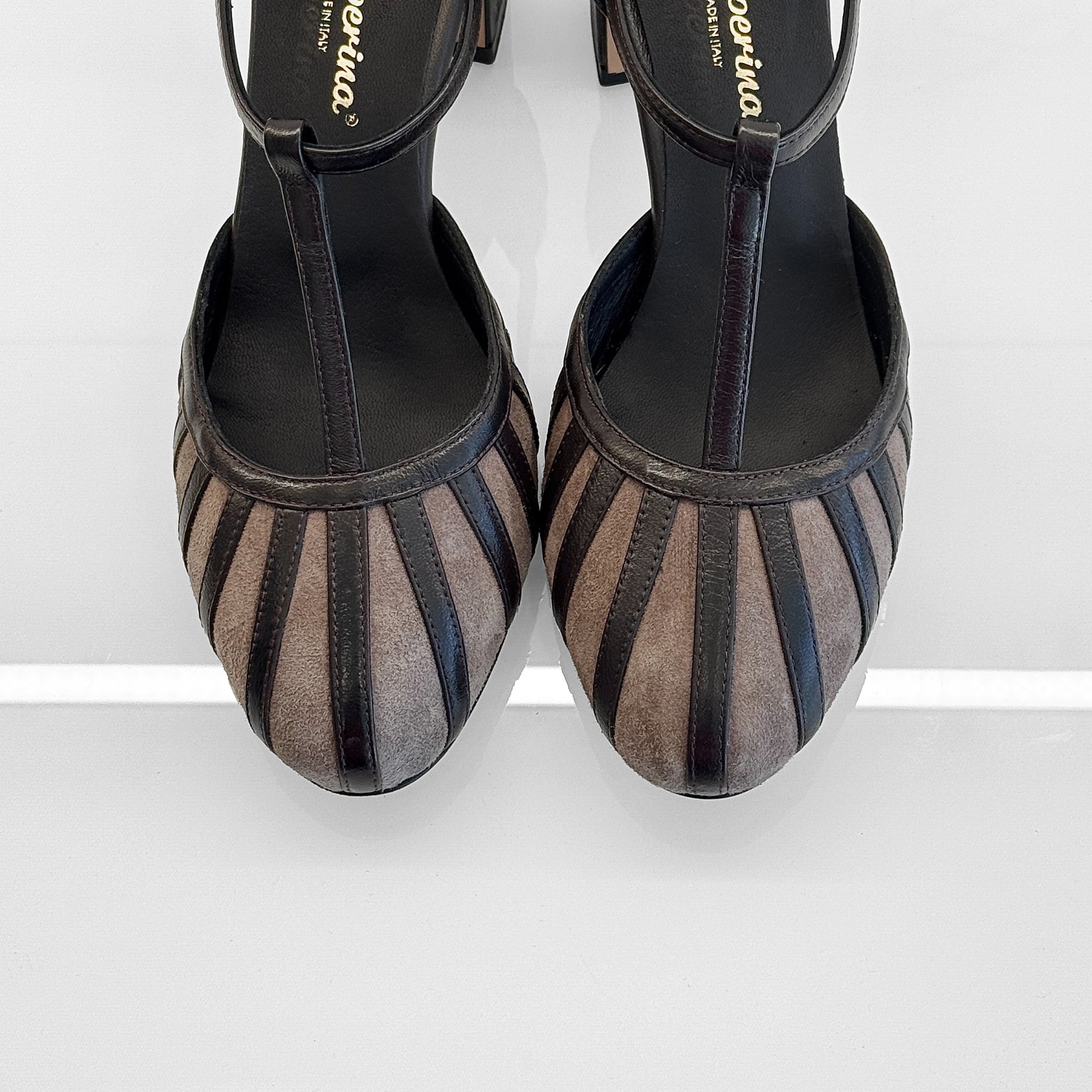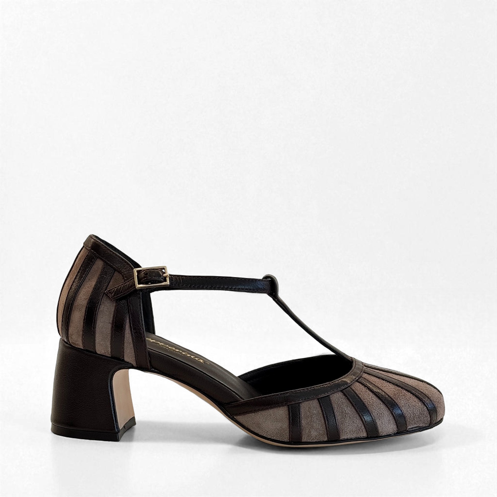Charleston Annette in camoscio con listelli in rilievo in pelle testa di moro e cinturino. Tacco largo comodo, sottopiede imbottito e suola in cuoio per un comfort artigianale di qualità.