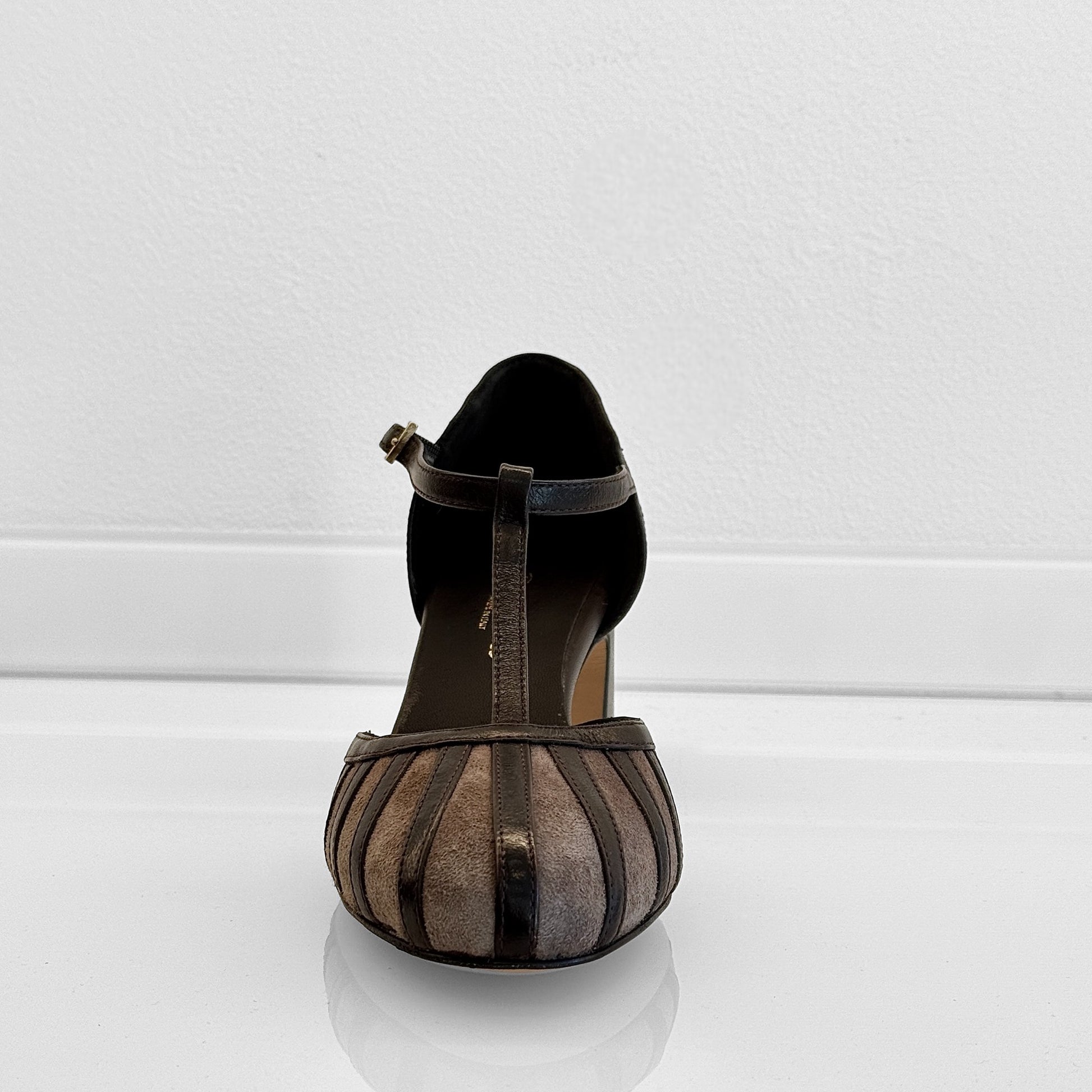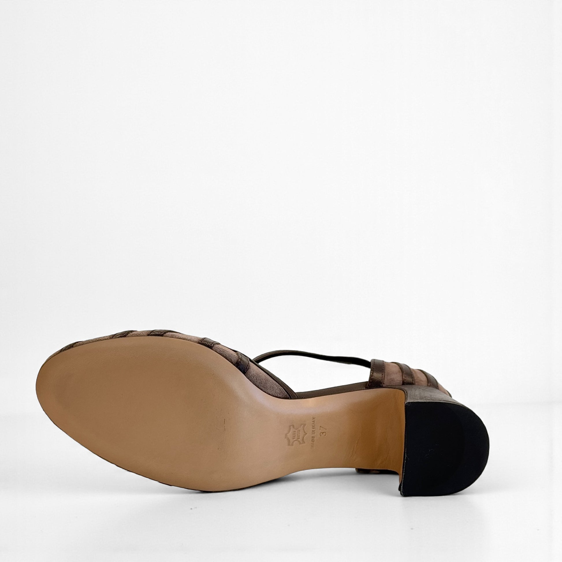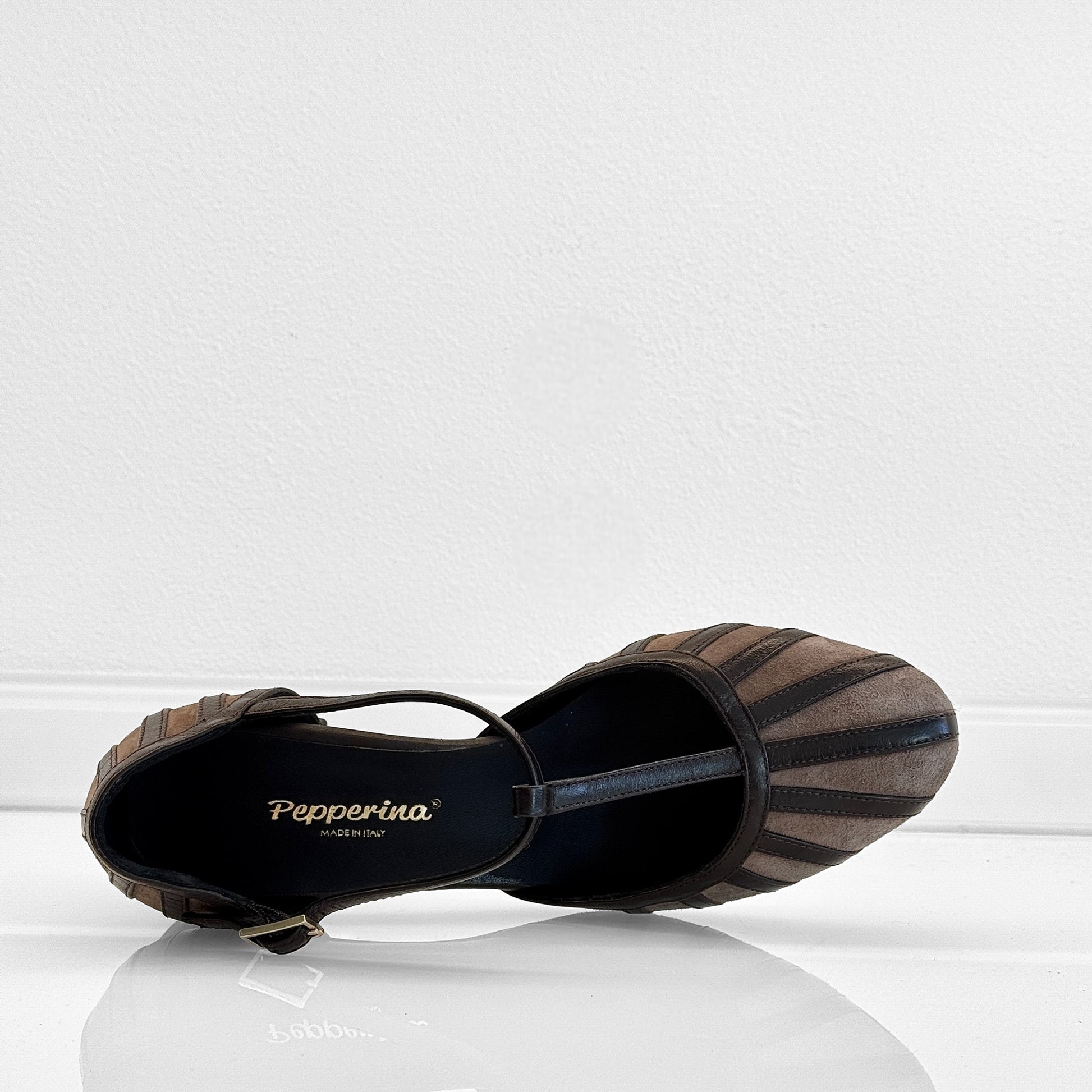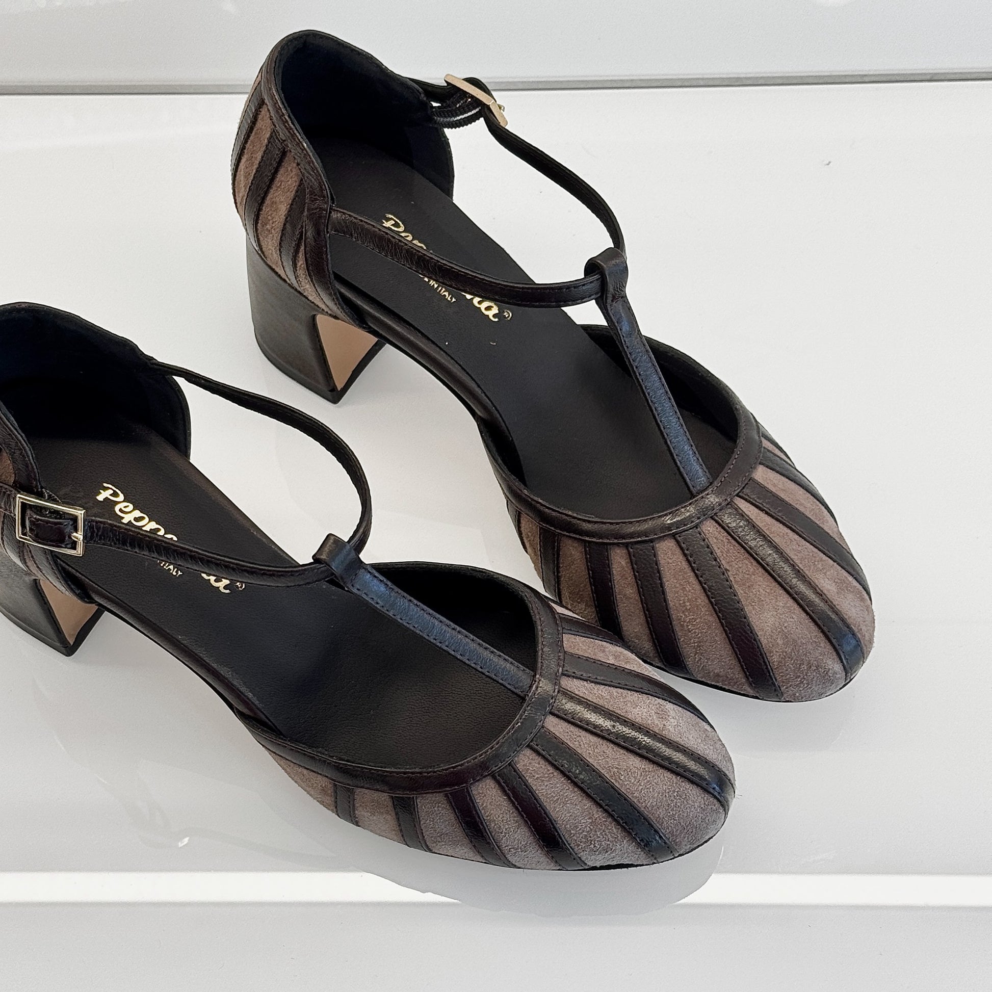 Charleston Annette in camoscio con listelli in rilievo in pelle testa di moro e cinturino. Tacco largo comodo, sottopiede imbottito e suola in cuoio per un comfort artigianale di qualità.