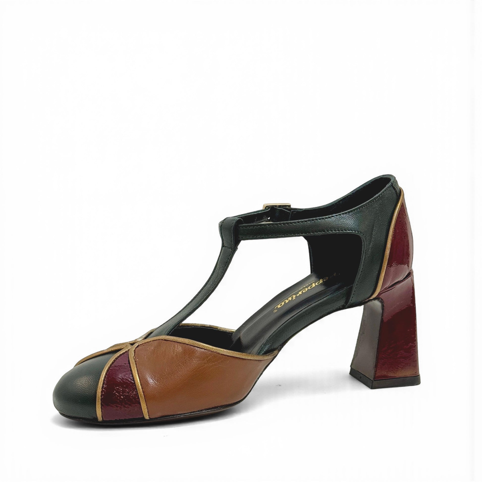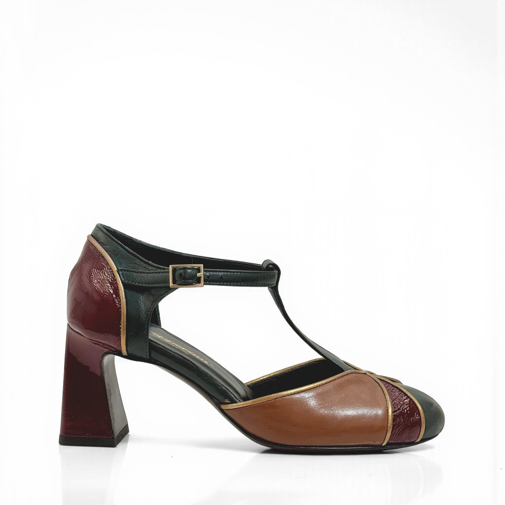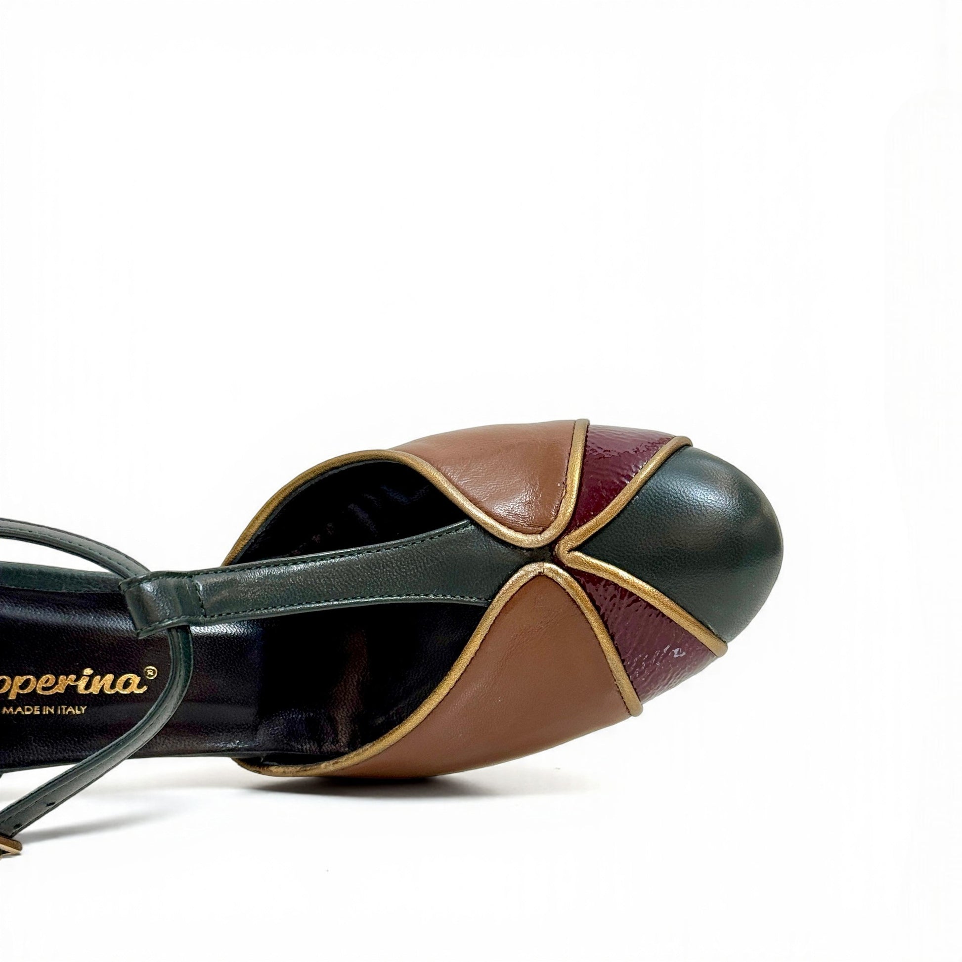 Charleston Fiorence multicolor in pelle verde, cuoio e vernice bordeaux con profili oro e tacco largo 7 cm. Modello artigianale con sottopiede morbido imbottito per un comfort superiore.