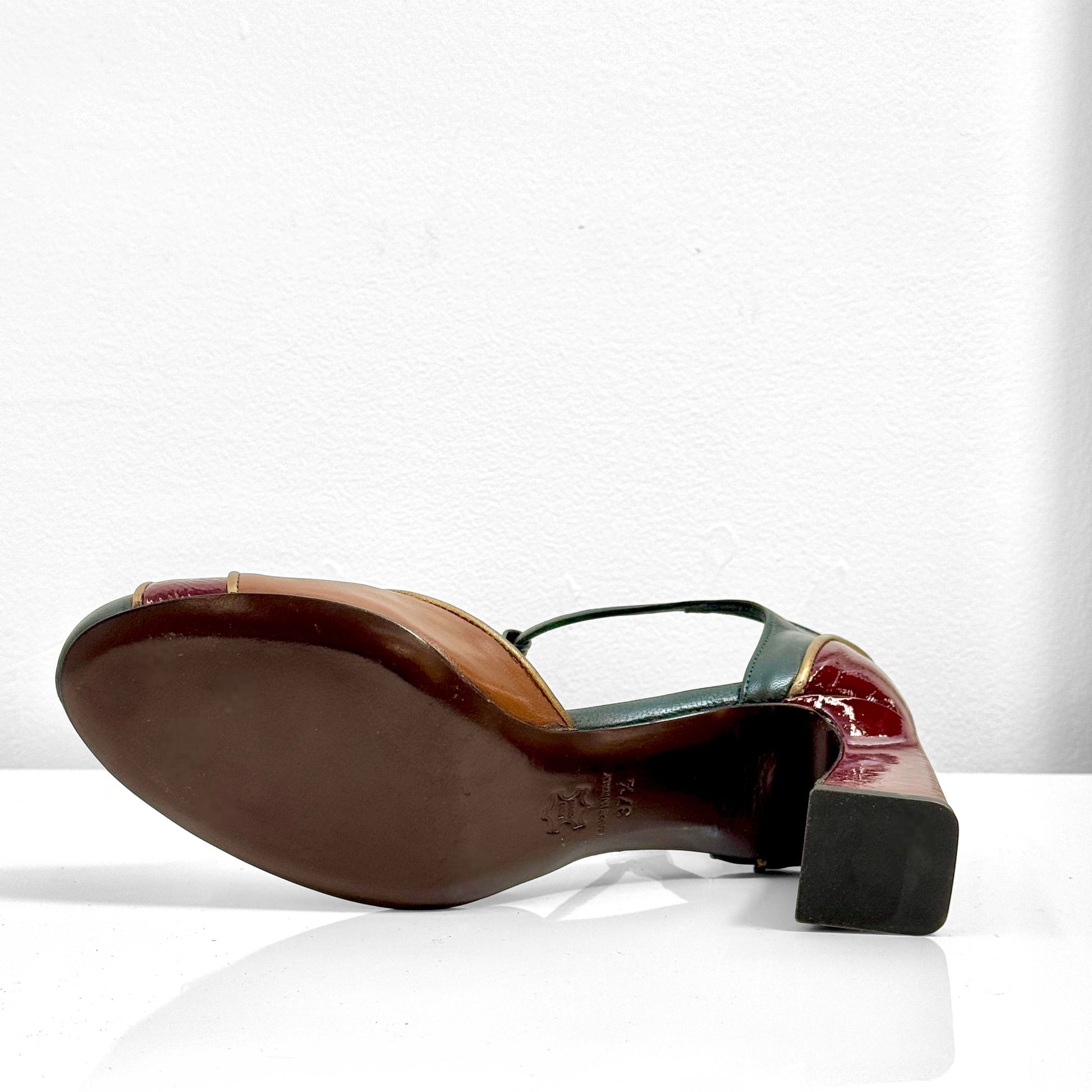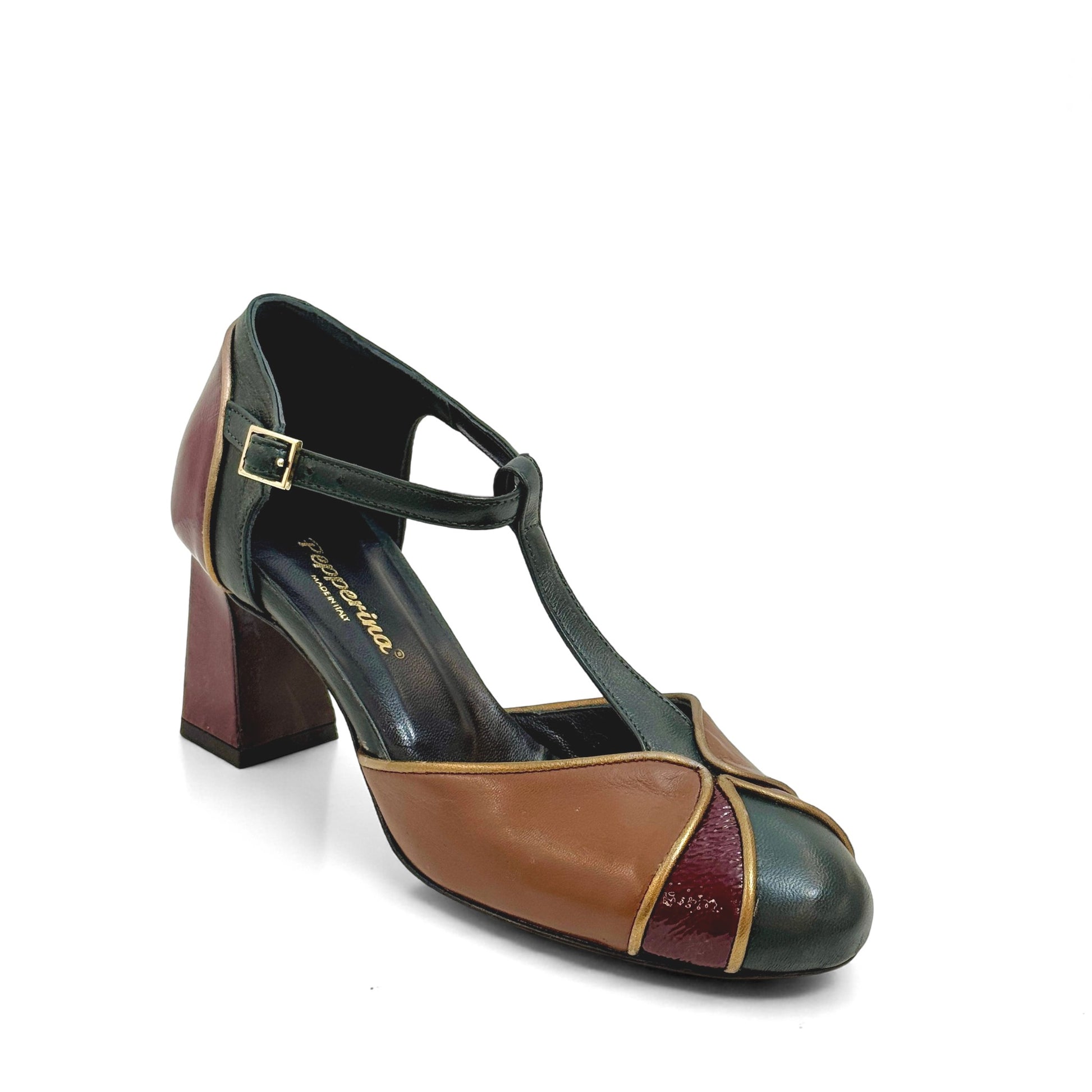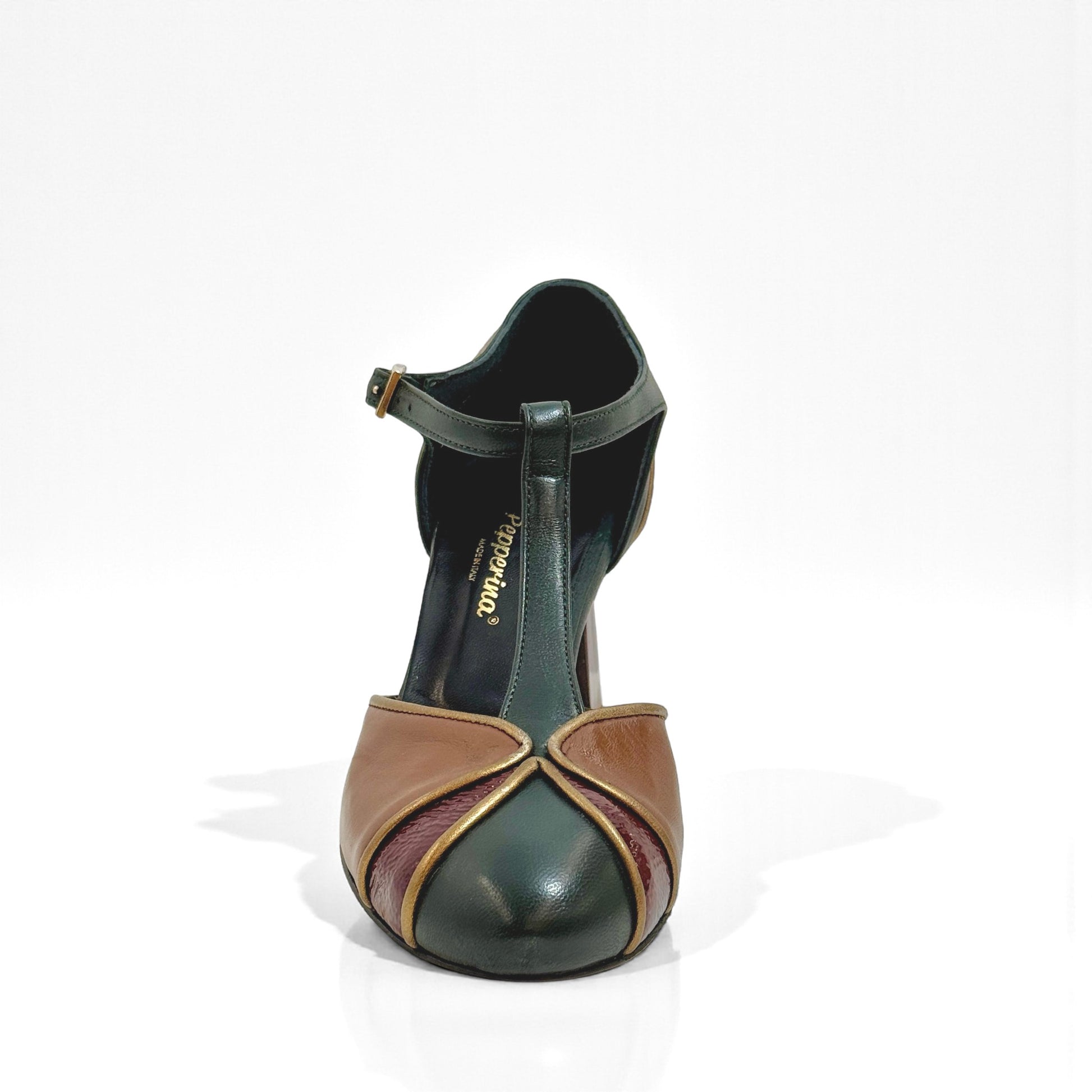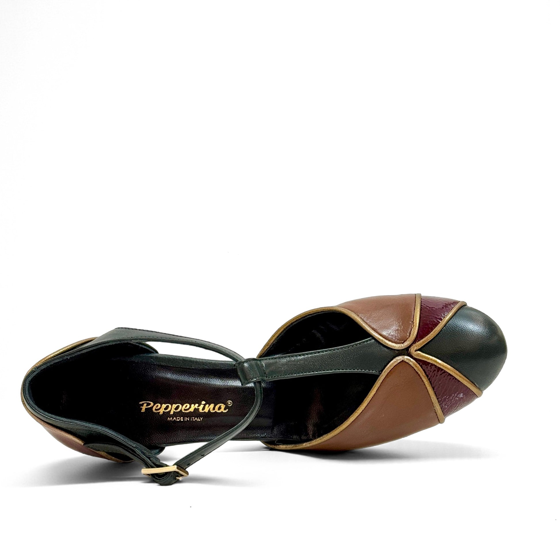 Charleston Fiorence multicolor in pelle verde, cuoio e vernice bordeaux con profili oro e tacco largo 7 cm. Modello artigianale con sottopiede morbido imbottito per un comfort superiore.