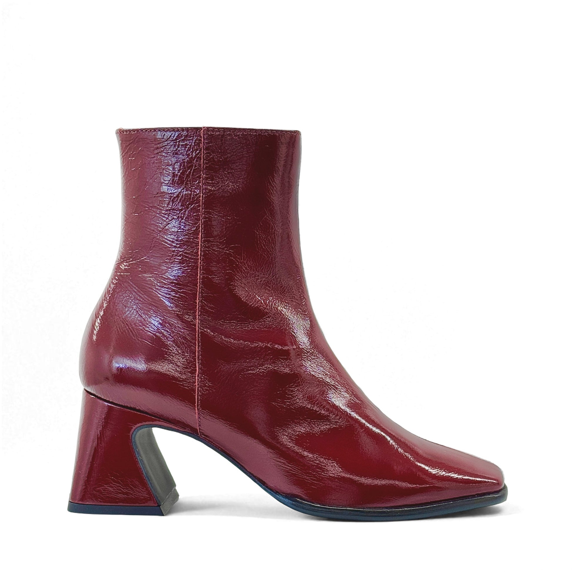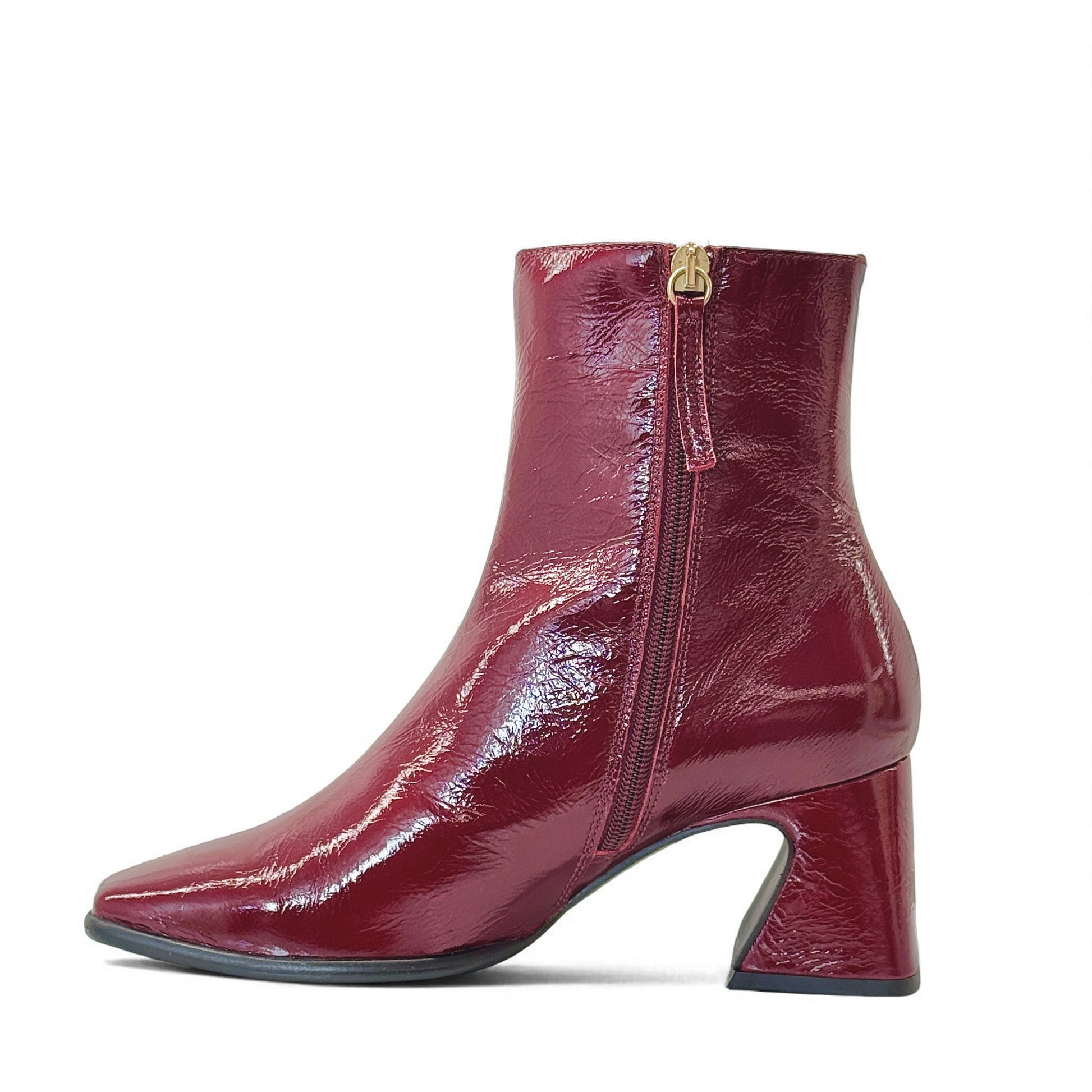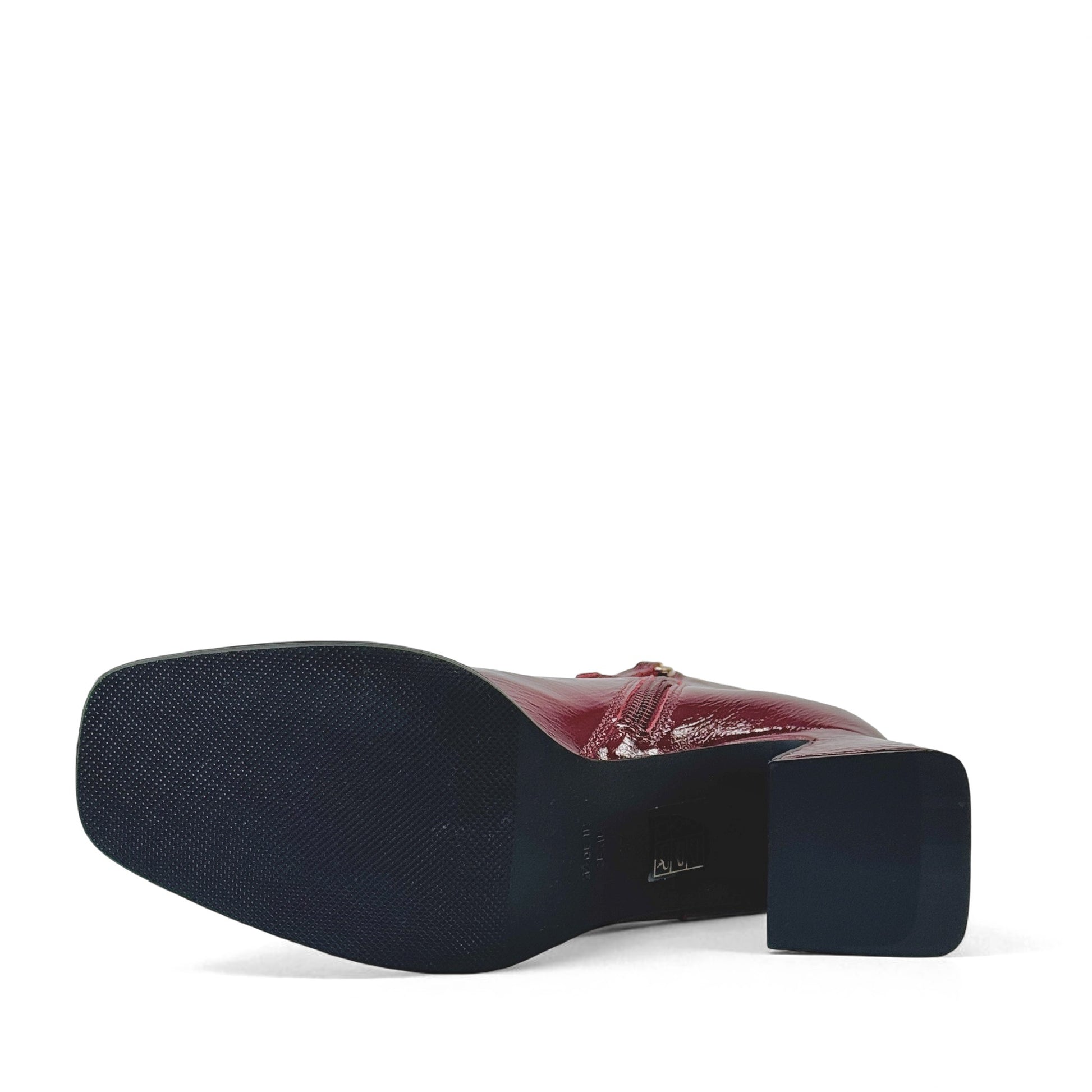 Stivaletto in pelle vernice bordeaux con tacco 6 cm.
