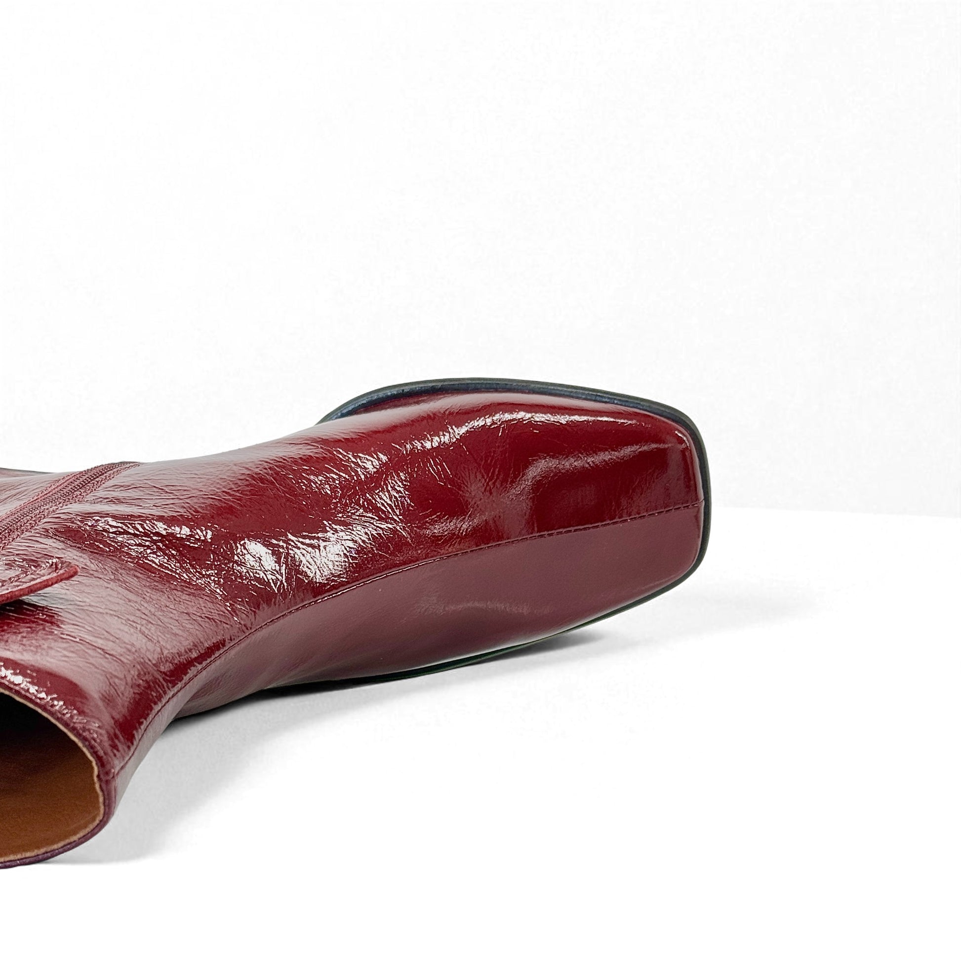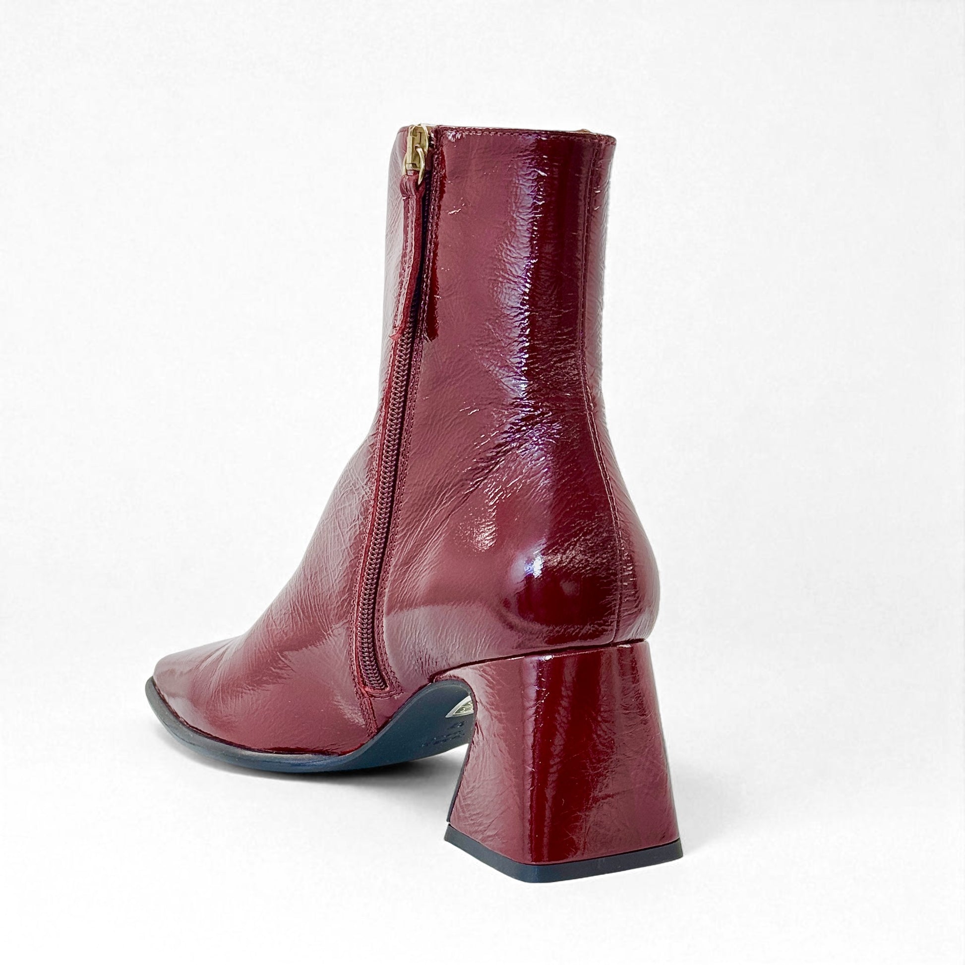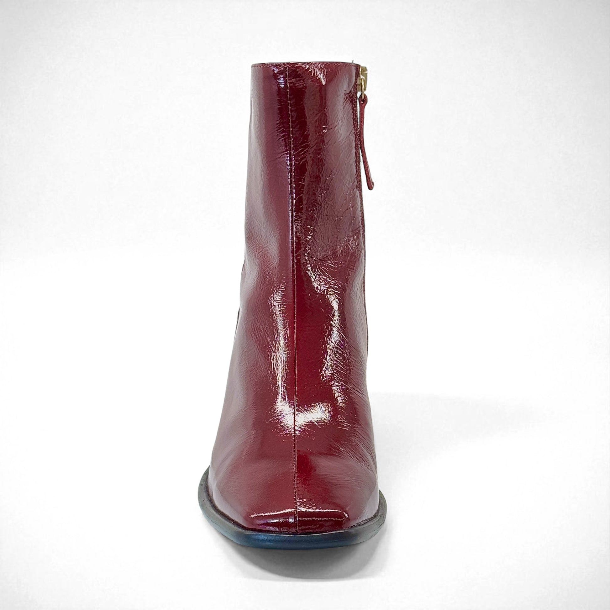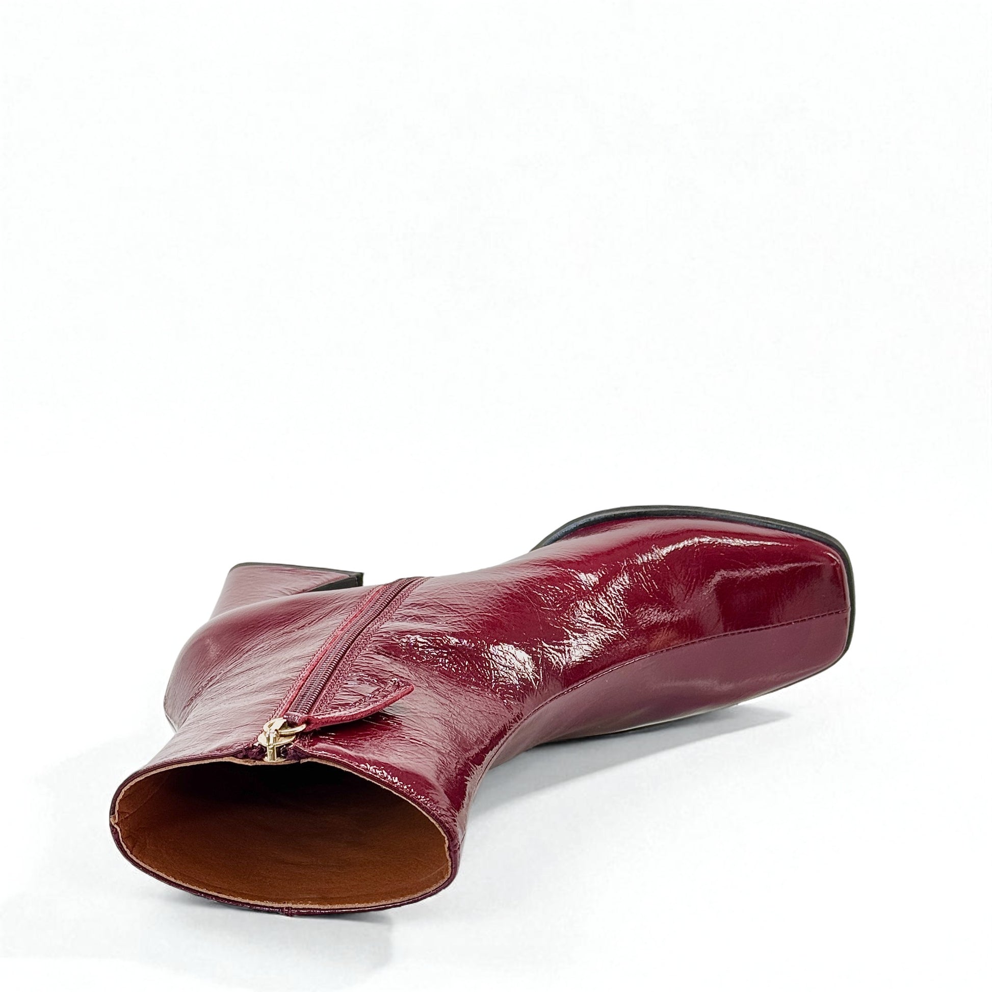 Stivaletto in pelle vernice bordeaux con tacco 6 cm.